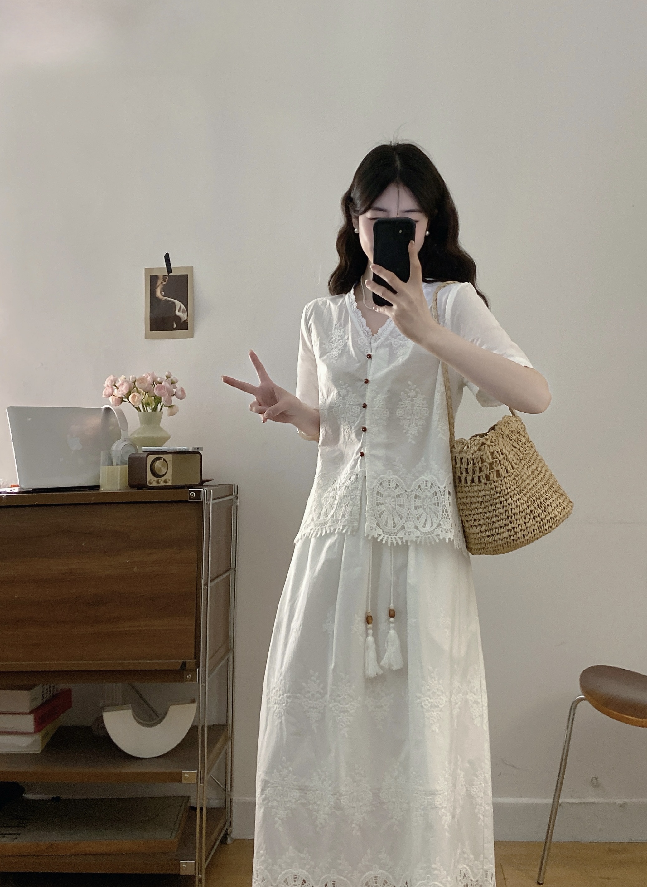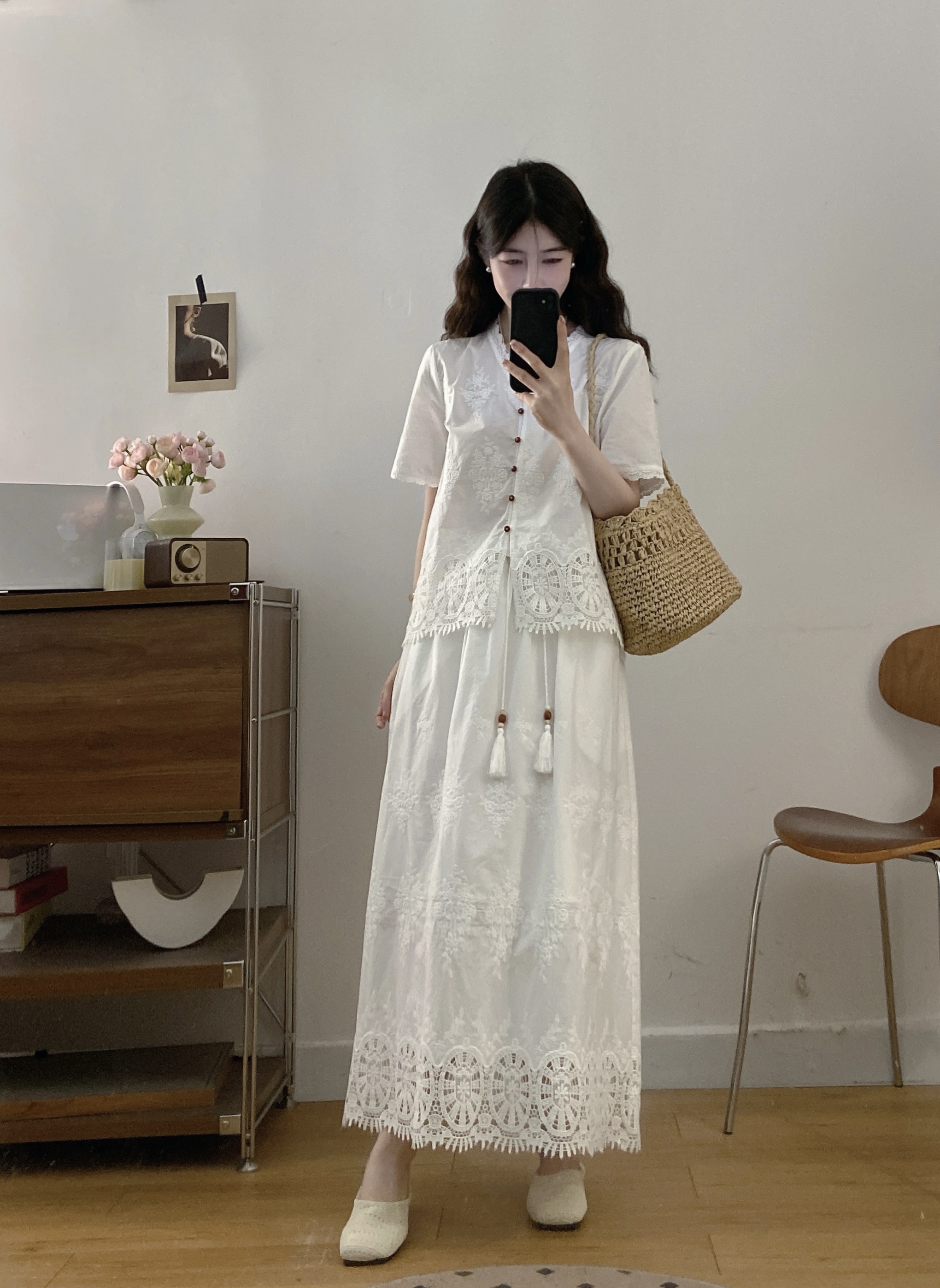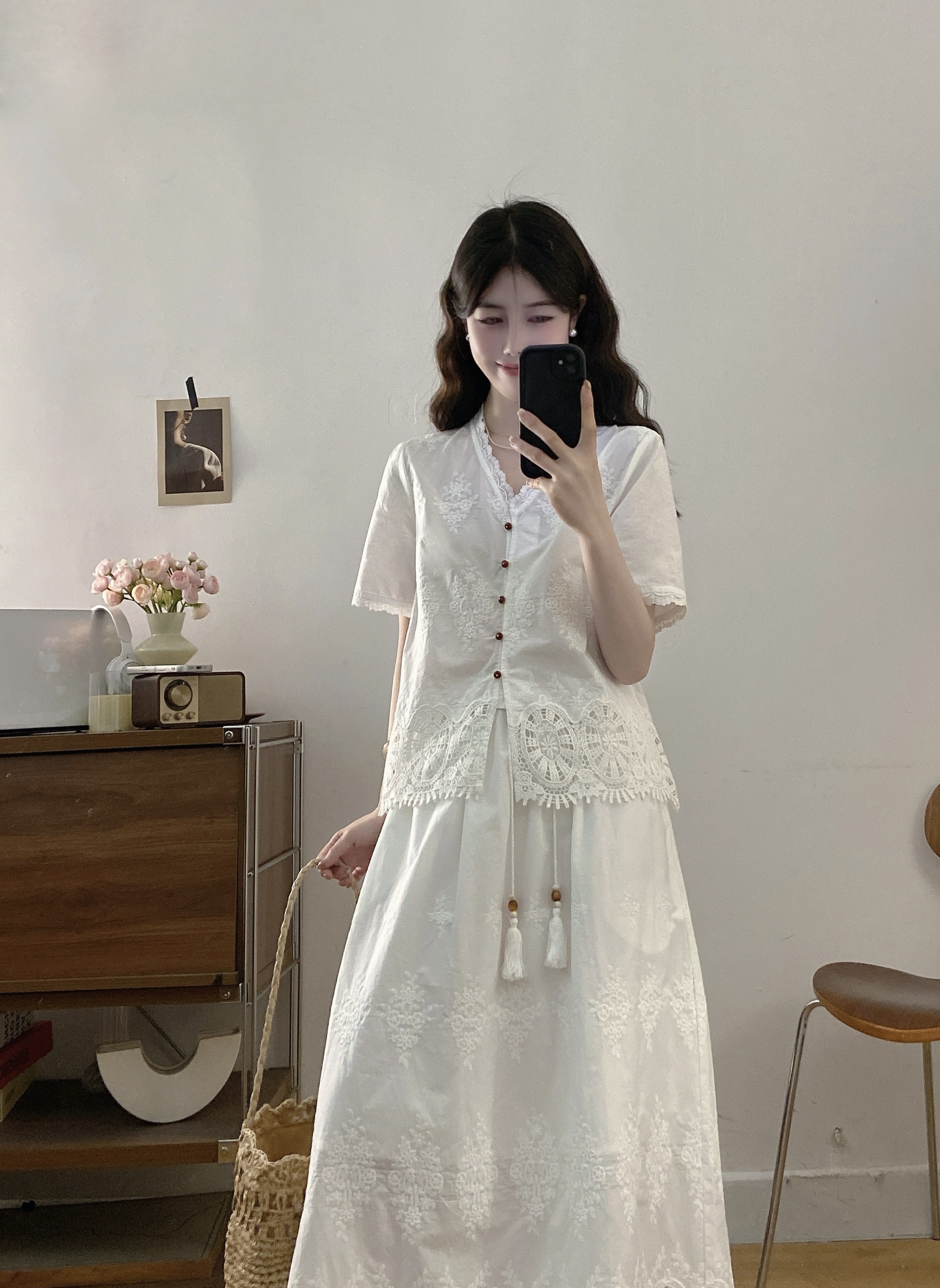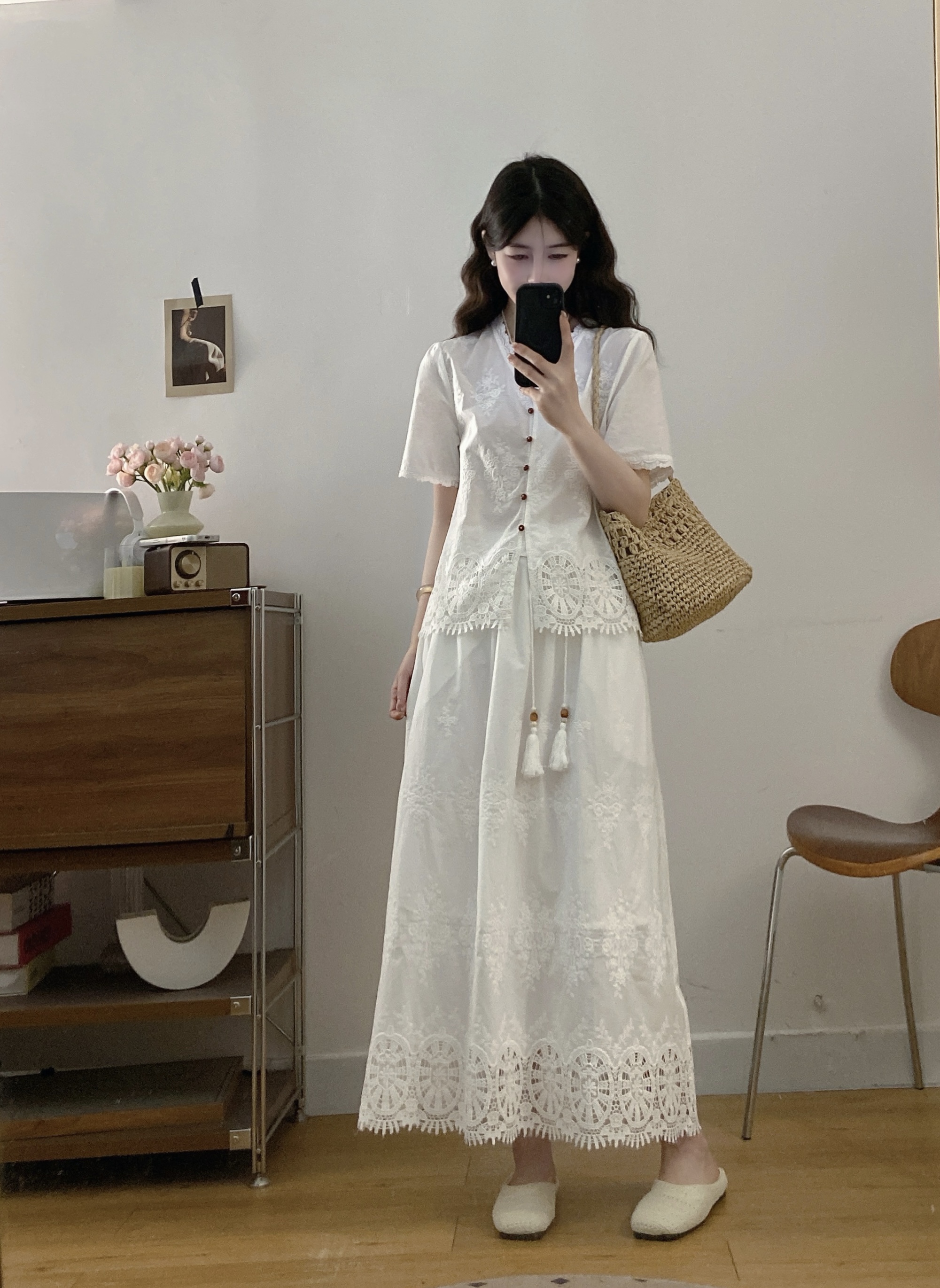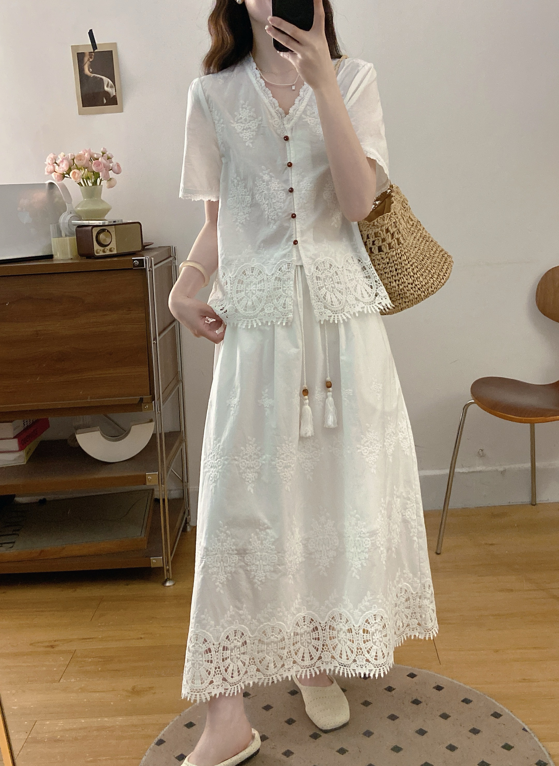 실사 빅 사이즈 여성 의류 2026 여름 새로운 프랑스식 레트로 자수 셔츠 하이웨이스트 반신 스커트 투피스 세트