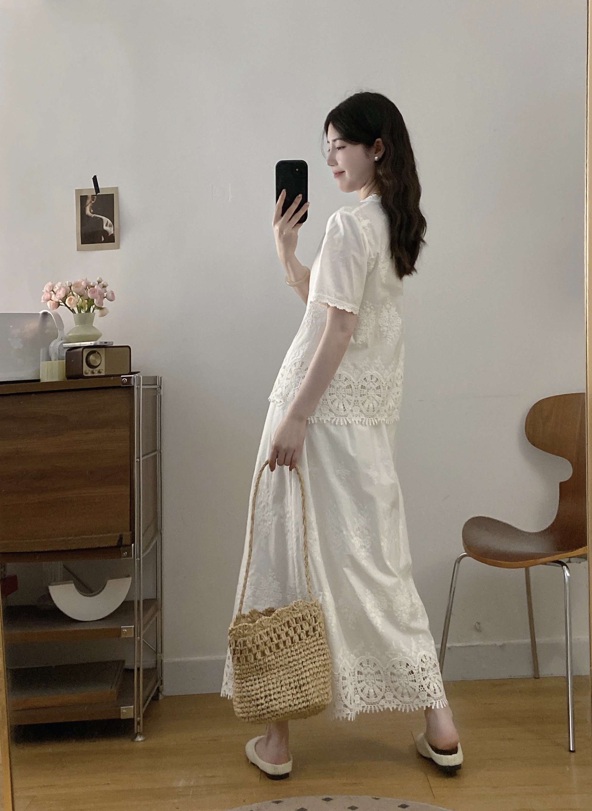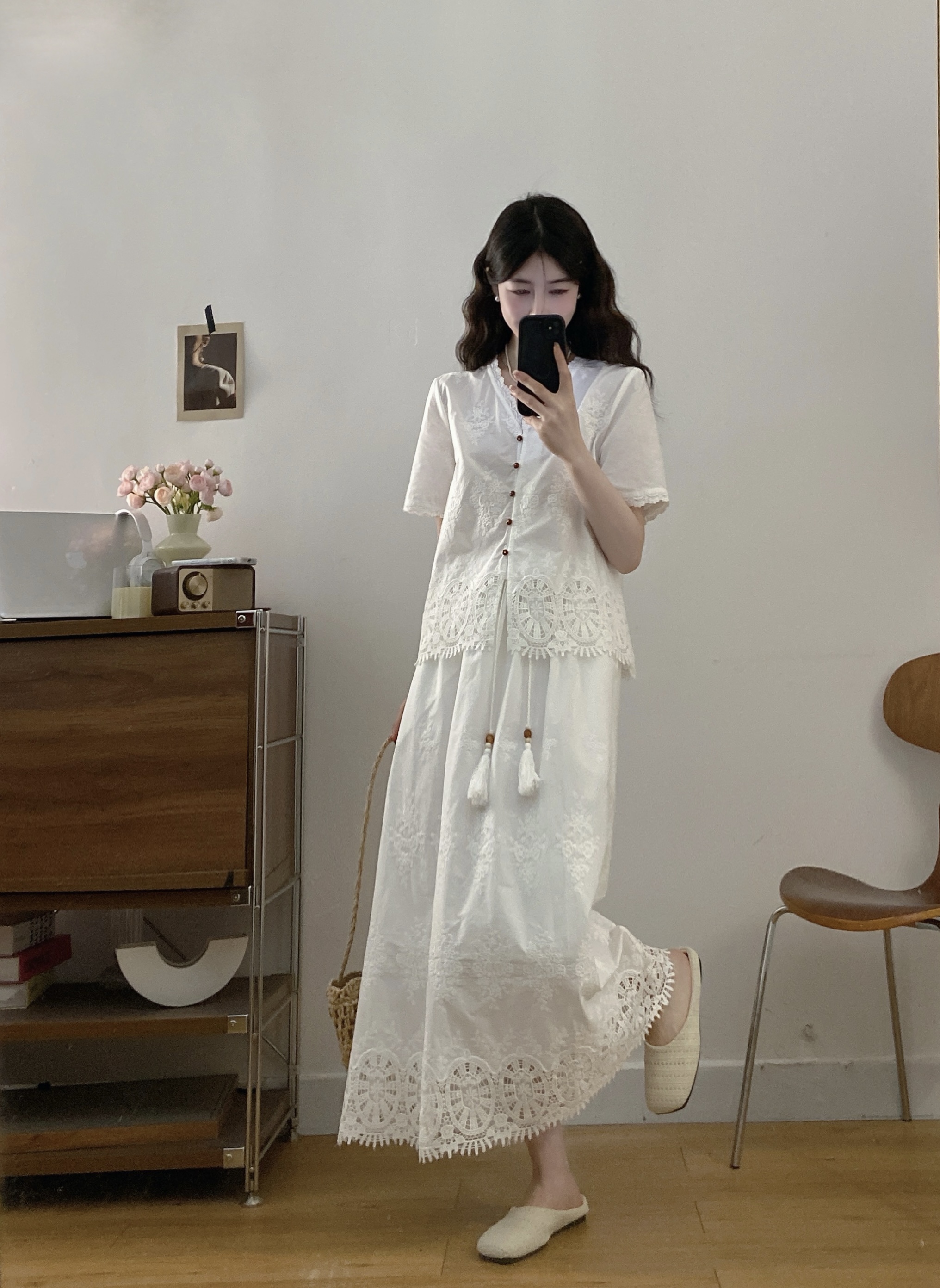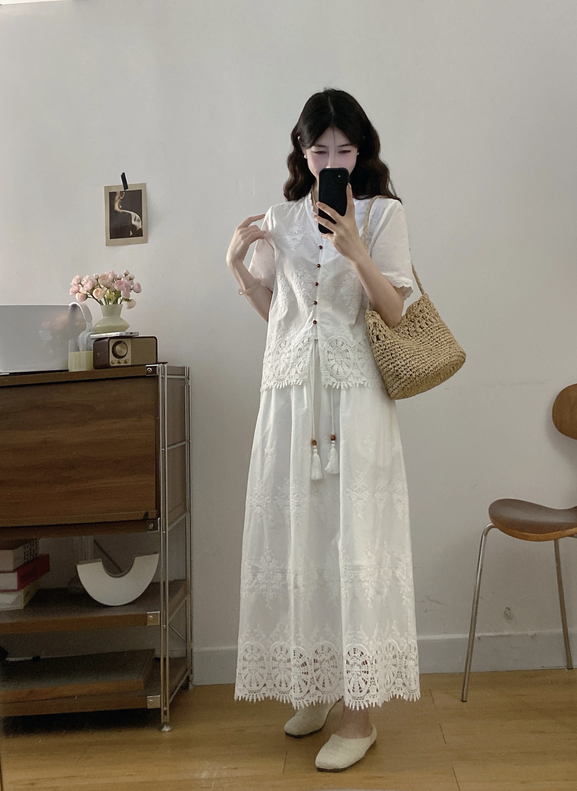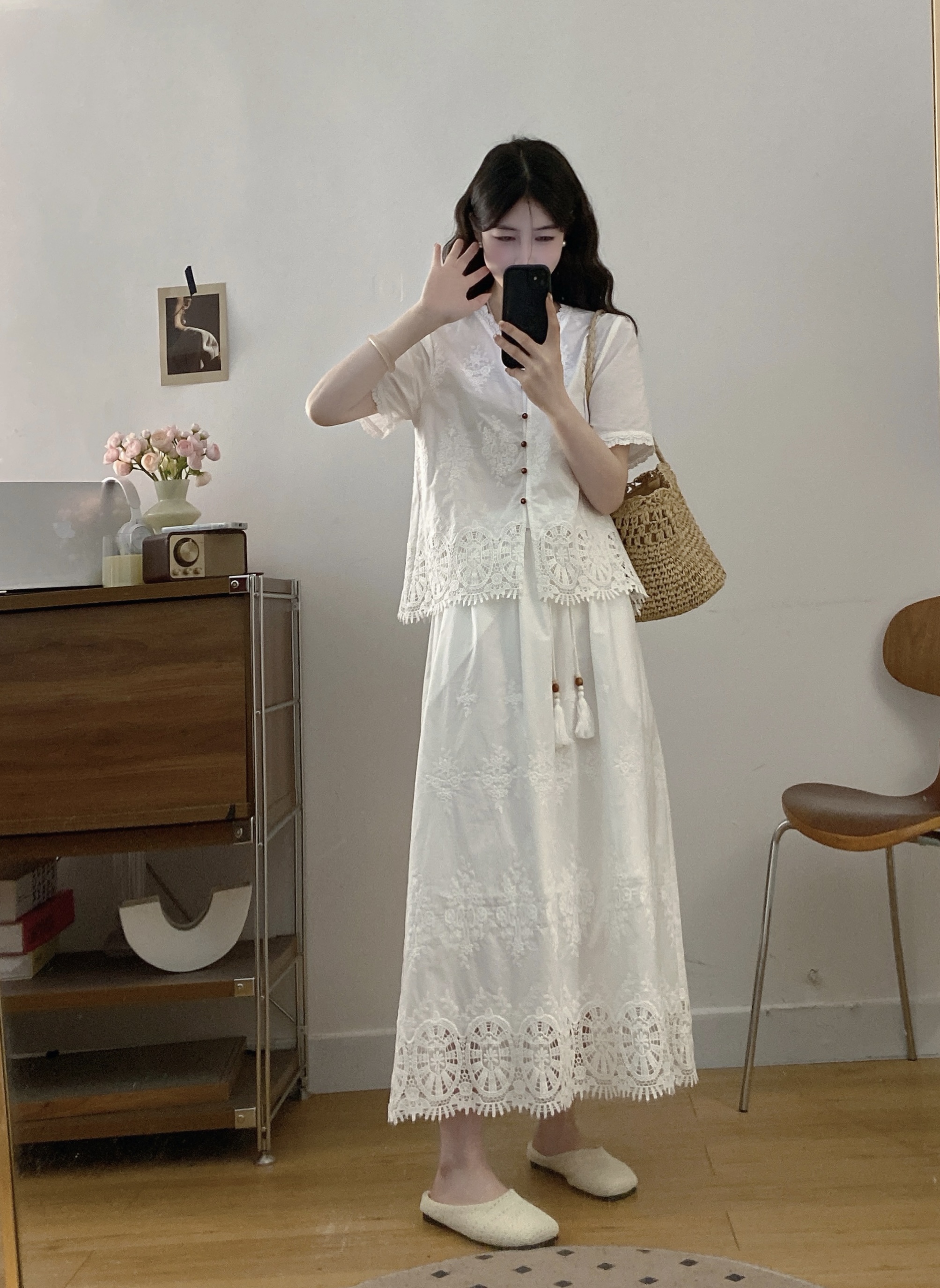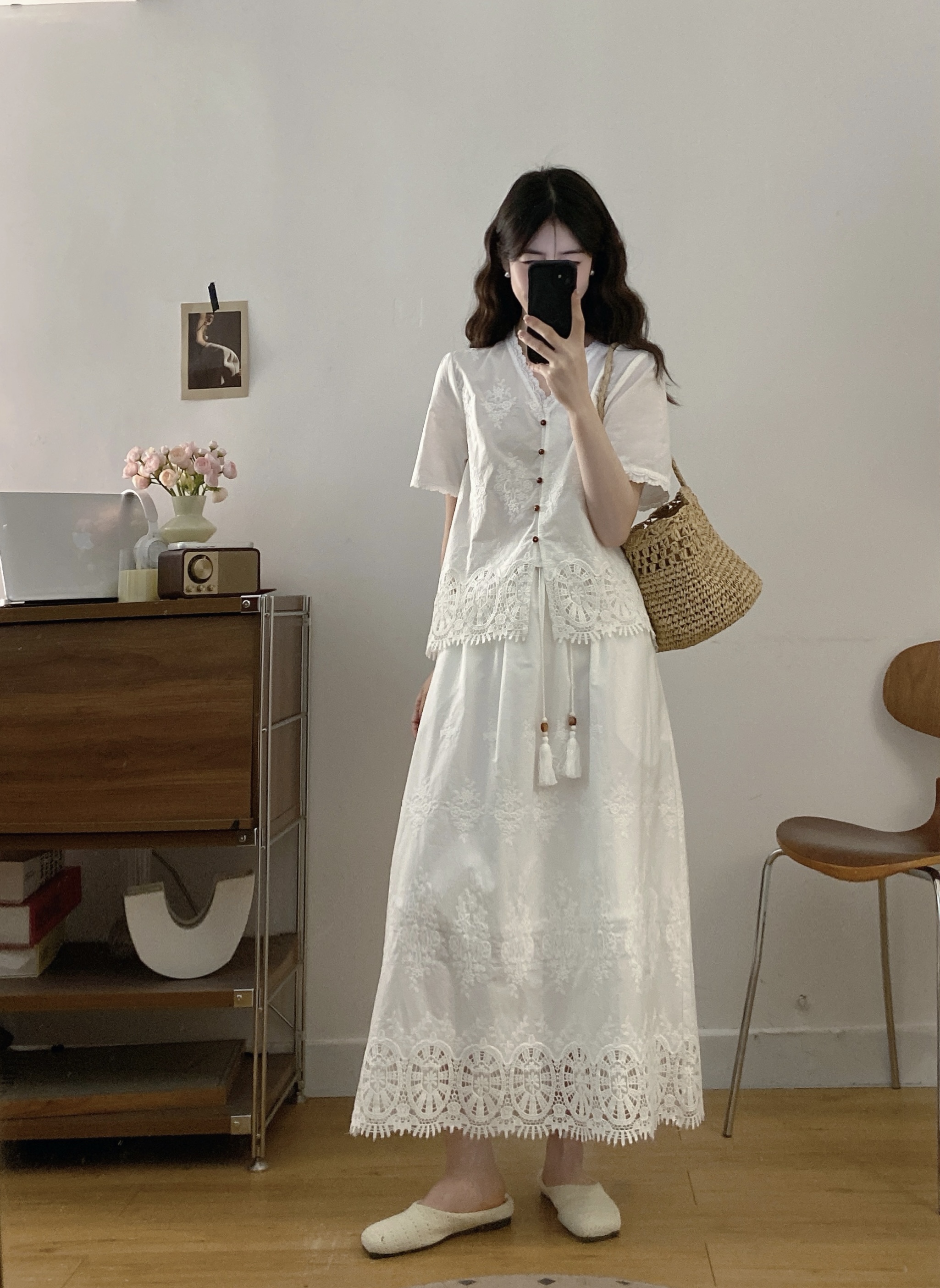 실사 빅 사이즈 여성 의류 2026 여름 새로운 프랑스식 레트로 자수 셔츠 하이웨이스트 반신 스커트 투피스 세트