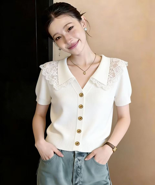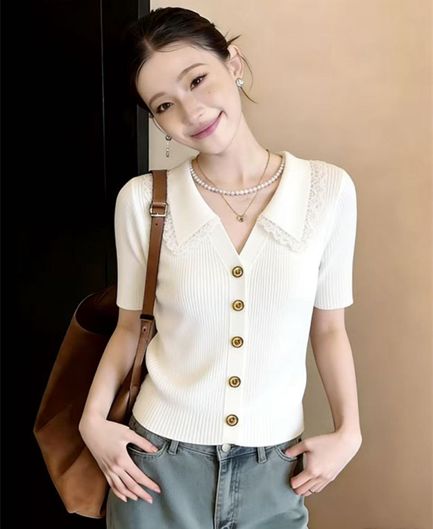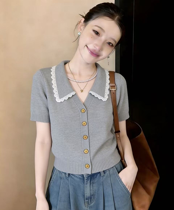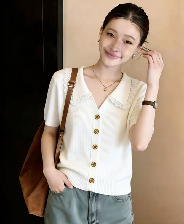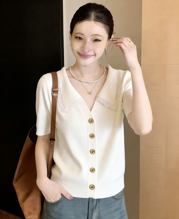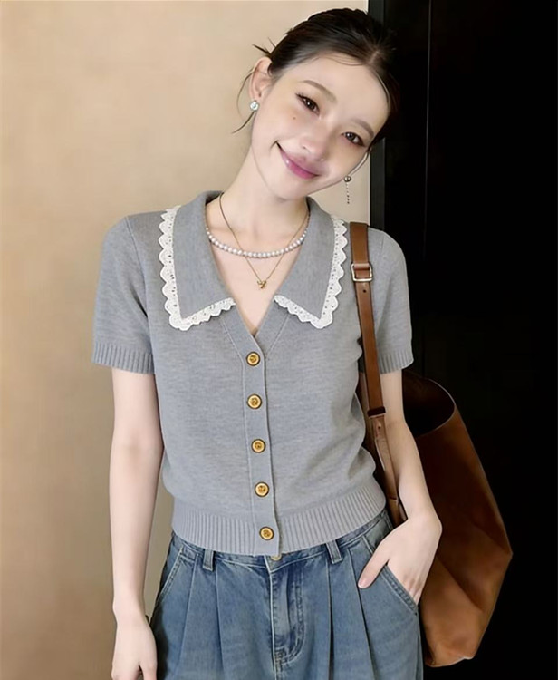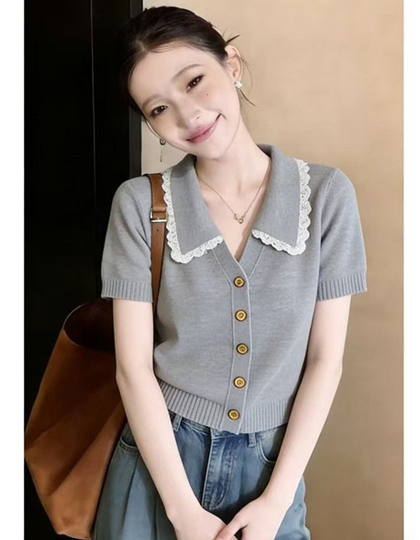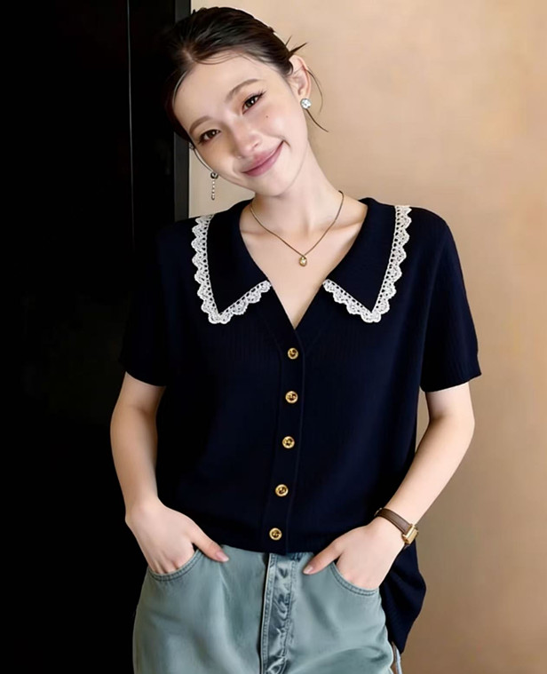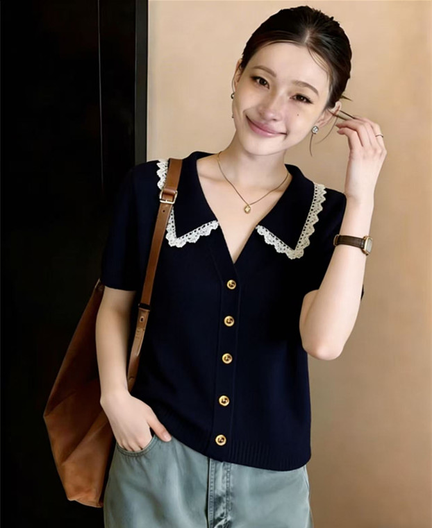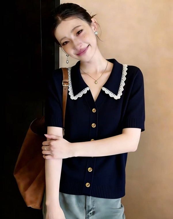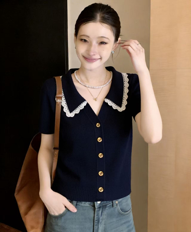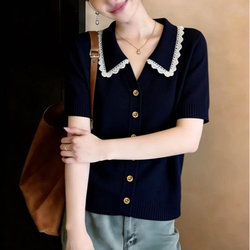학원 스타일 해군 레이스 폴로 칼라 니트 스웨터 반팔 티셔츠 여성 2026 새로운 여름 한 부서 착용 잡아라. 의류
