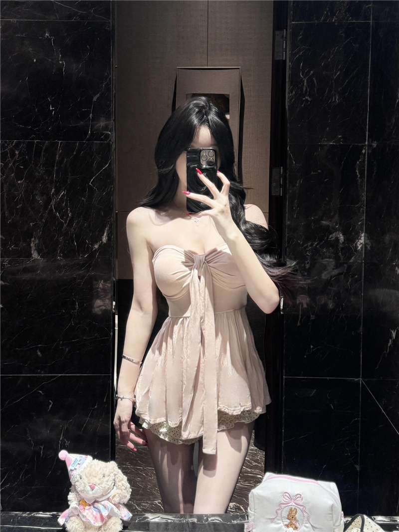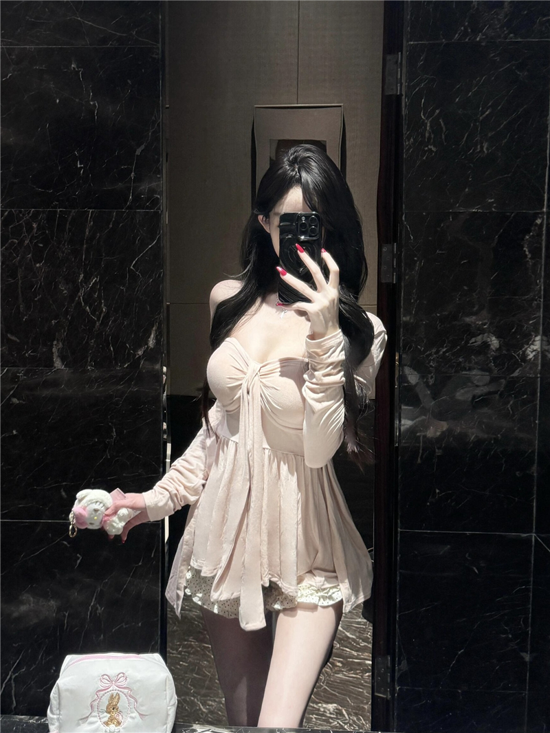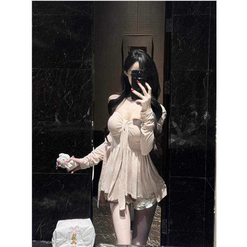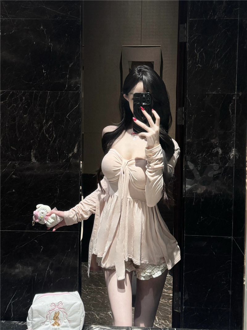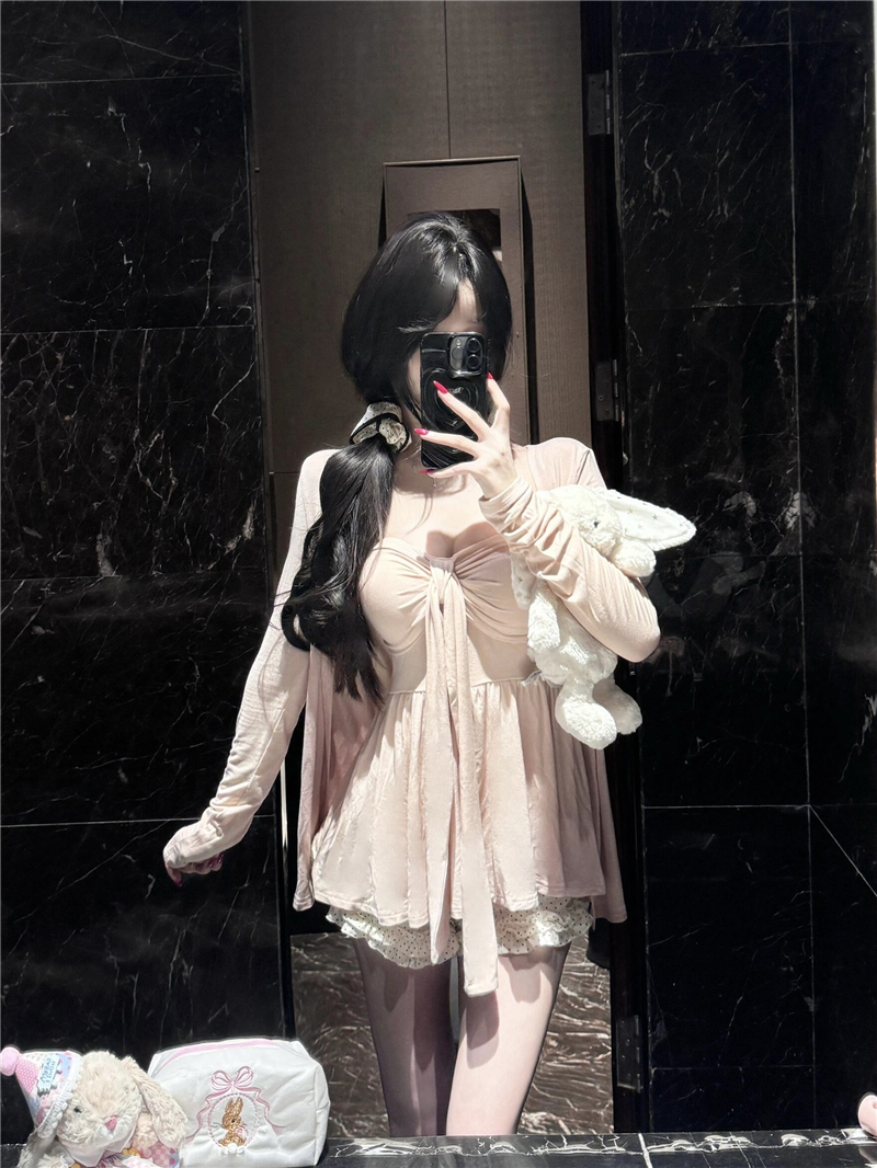 느긋한 자매 모달 핑크색 오픈 가디건 외부 가져 가라. 여름 튜브탑 한 부서 분위기 센스 순수한 욕망 세트