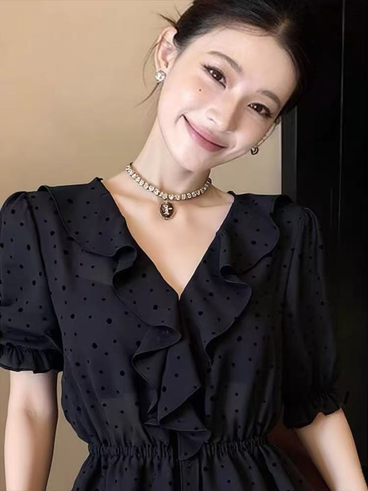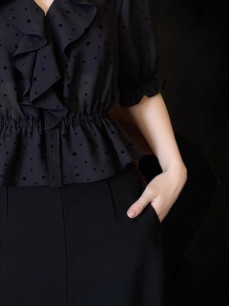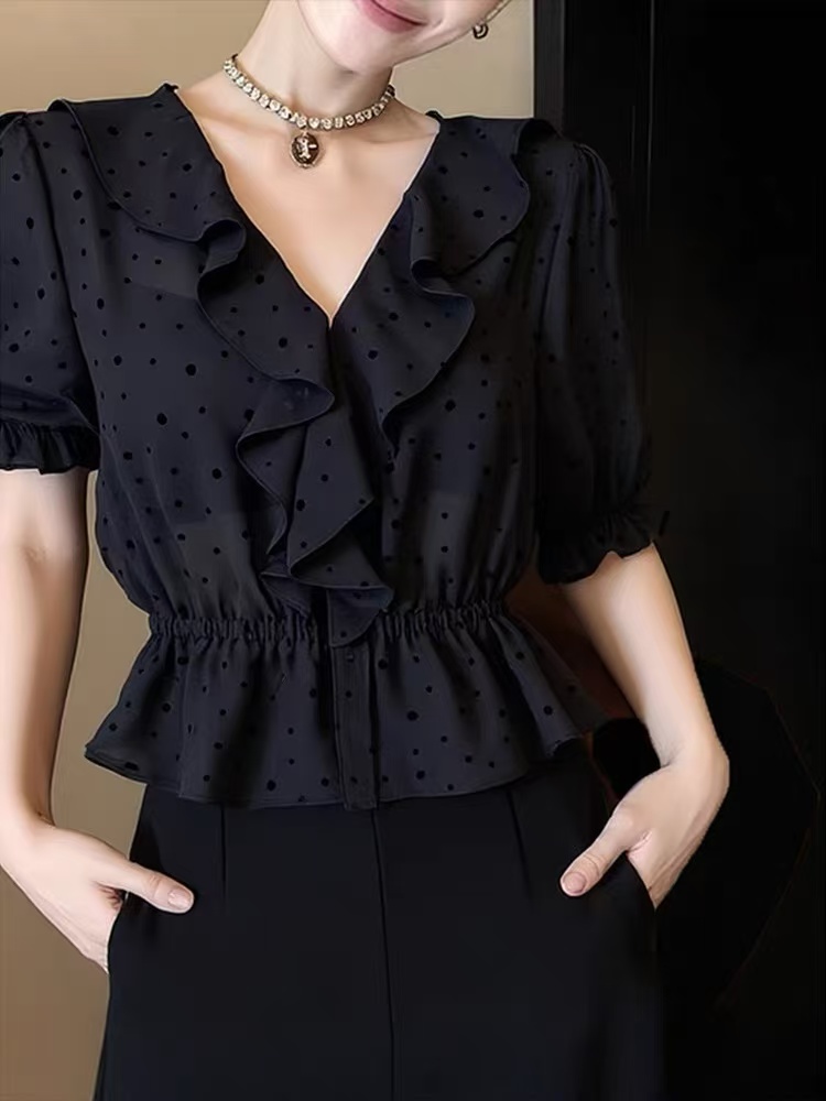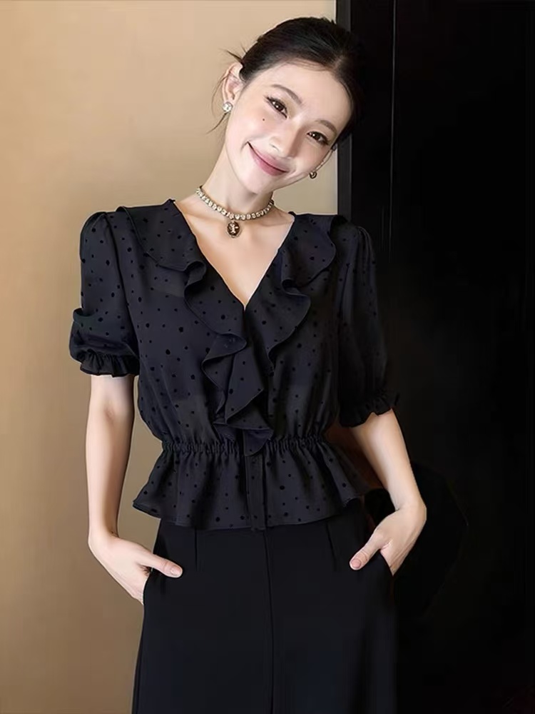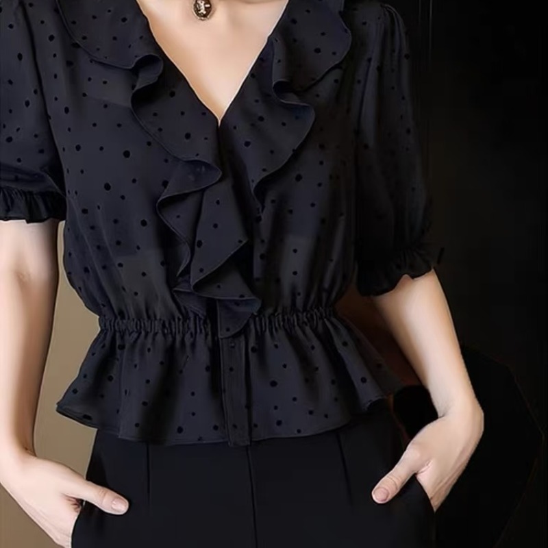 빛 요리 한 바람 검정색 도트 무늬 여성 셔츠 여름 2026 년 새로운 고급 절묘한 셔츠 캐주얼 프릴 반팔