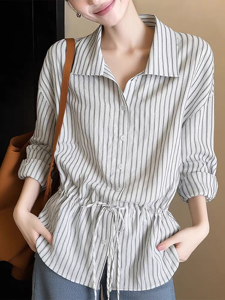 한 부서 디자인 센스 면 린넨 펌프 로프 허리 수축 스트라이프 여성 셔츠 봄 미니멀리즘 다용도 품격 다용도 루즈핏 맨위
