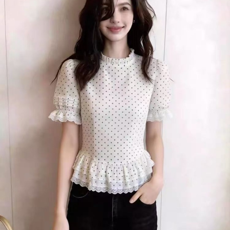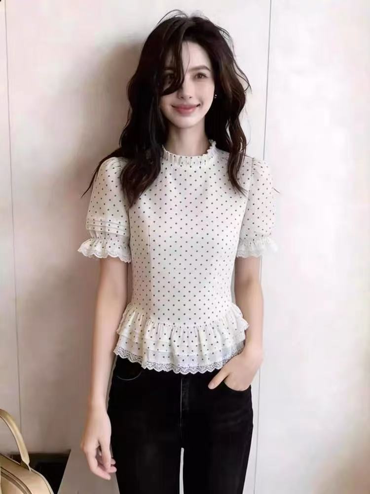 화이트 도트 무늬 프릴 허리 수축 맨위 여성 여름 새로운 슬림해 보이는 연령 감소 다용도 레이스 레이스 반팔 셔츠