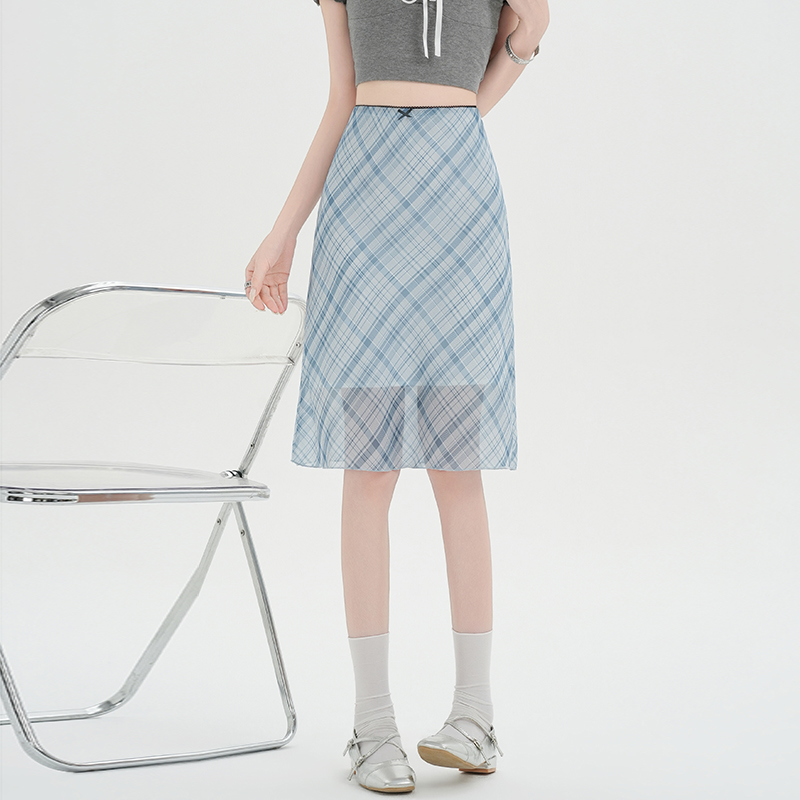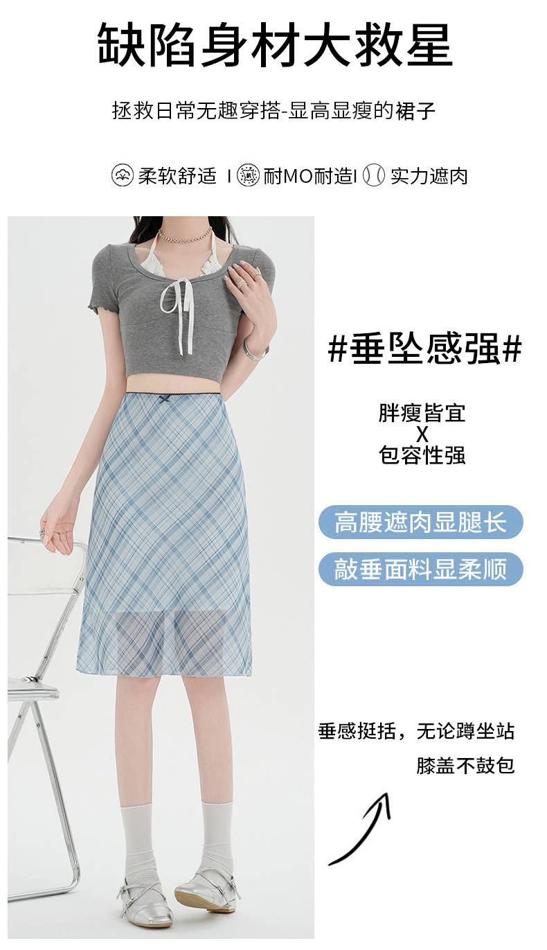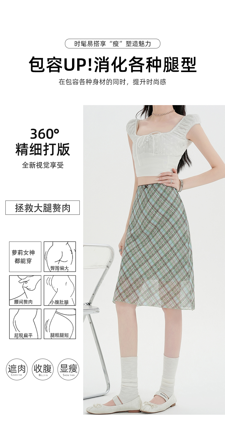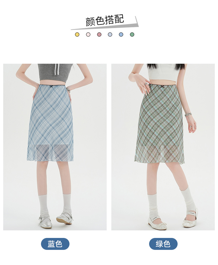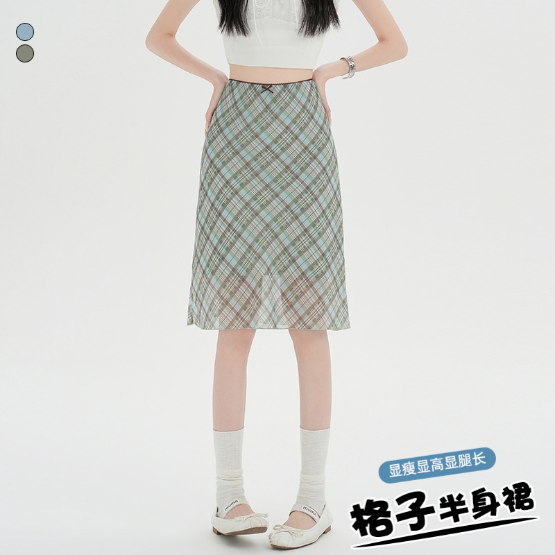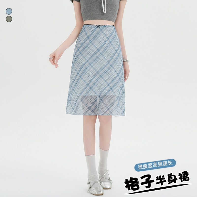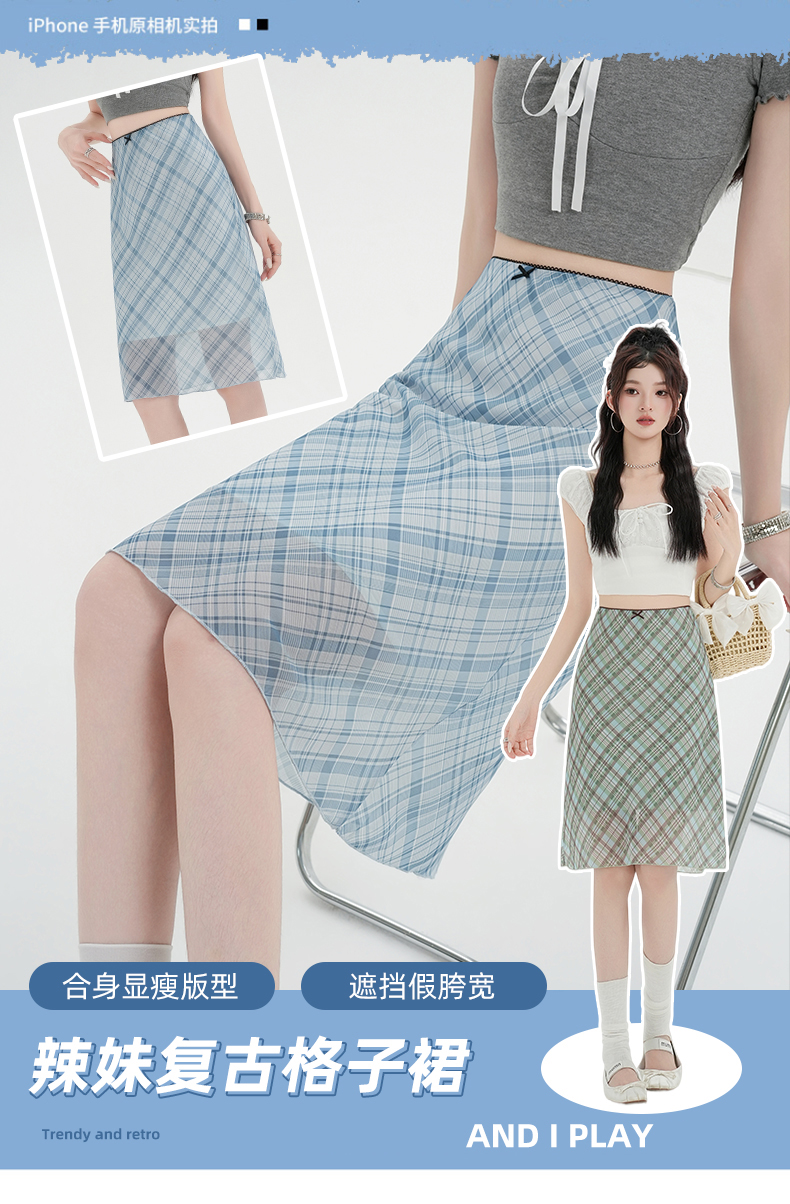 실사 여름 프랑스식 레트로 하이웨이스트 표지 십자가 다용도 배색 체크무늬 타이트 스커트 핫걸 슬림해 보이는 인어 꼬리 중간 스커트