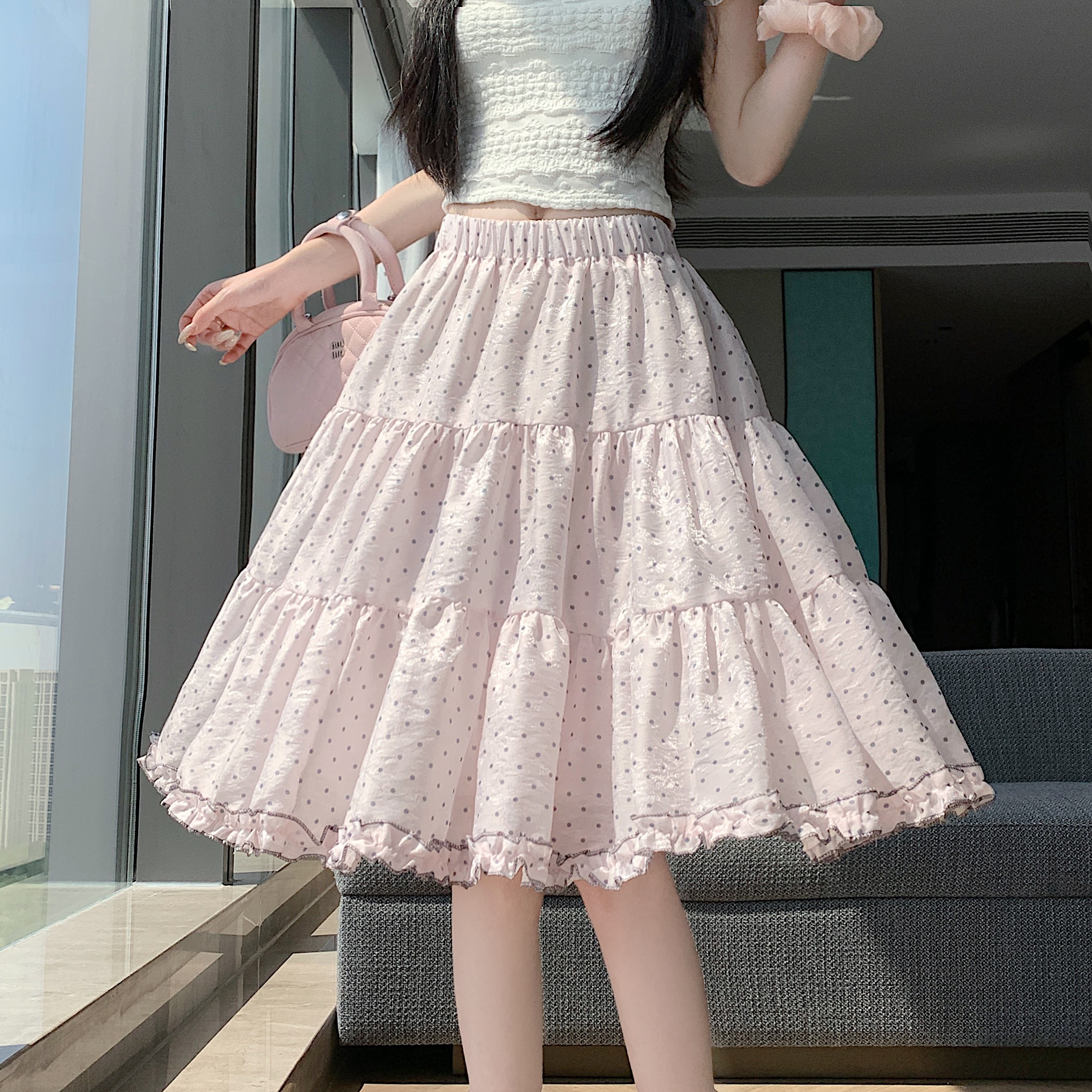 실사 한 부서 핑크색 부드러운 프릴 도트 무늬 반신 스커트 여성 하이웨이스트 슬림해 보이는 한 마디 중간 스커트 퍼프 케이크 드레스