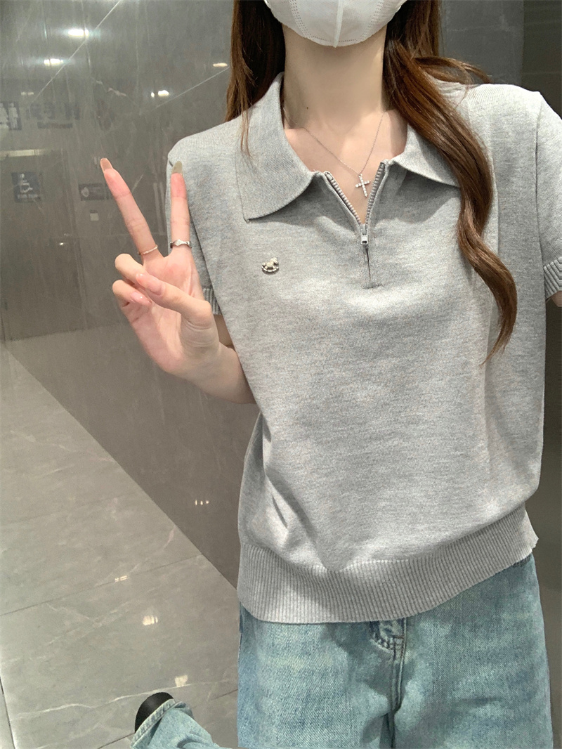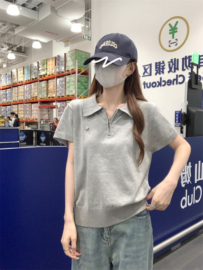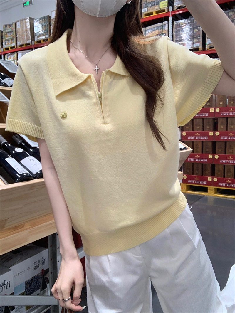 한 부서 chic 황색 얼음 실크 니트 반팔 티셔츠 여성 여름 작은 키 고유 한 아름다운 긍정적 인 어깨 POLO 칼라 맨위