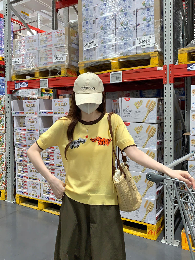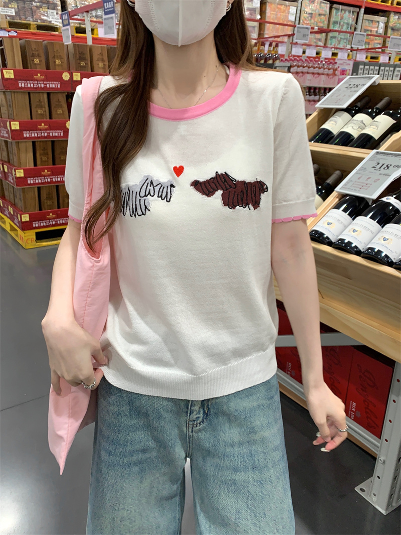 한국 반팔 티셔츠 여성 의류 여름 새로운 쇼트 스타일 한 부서 가시 자수 라운드 넥 맨위