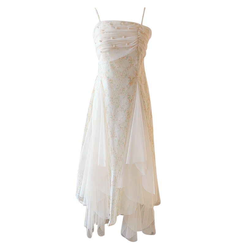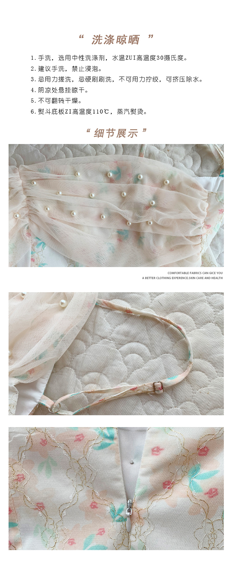 실사 핑크색 꽃무늬 여성 드레스 여름 부드러운 품격 허리 수축 롱 코트 슬립 치마 세트