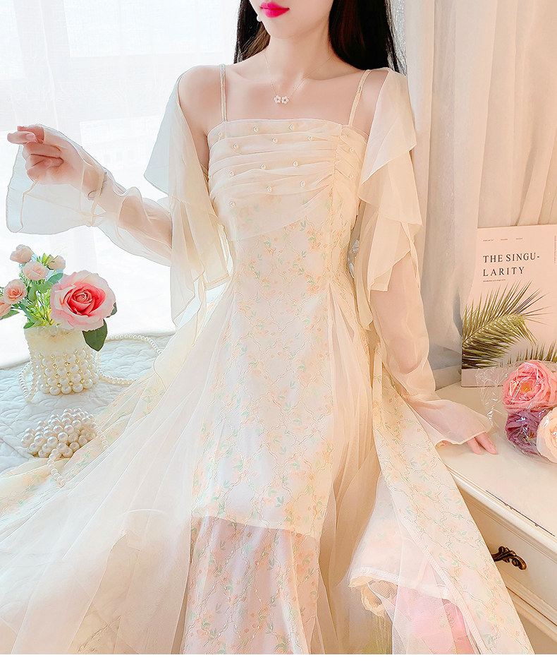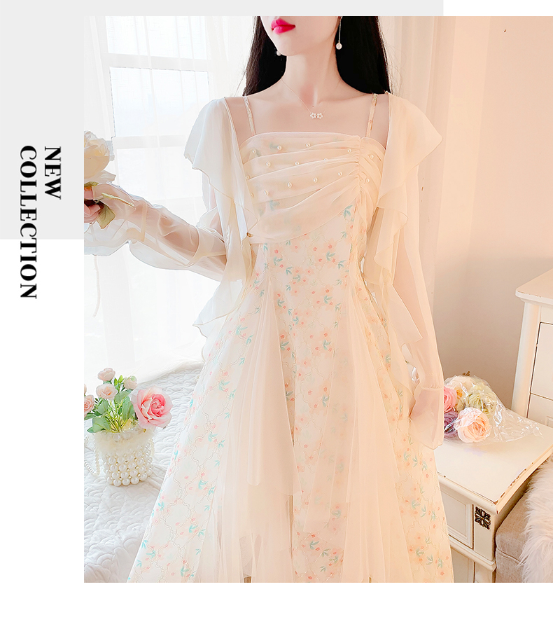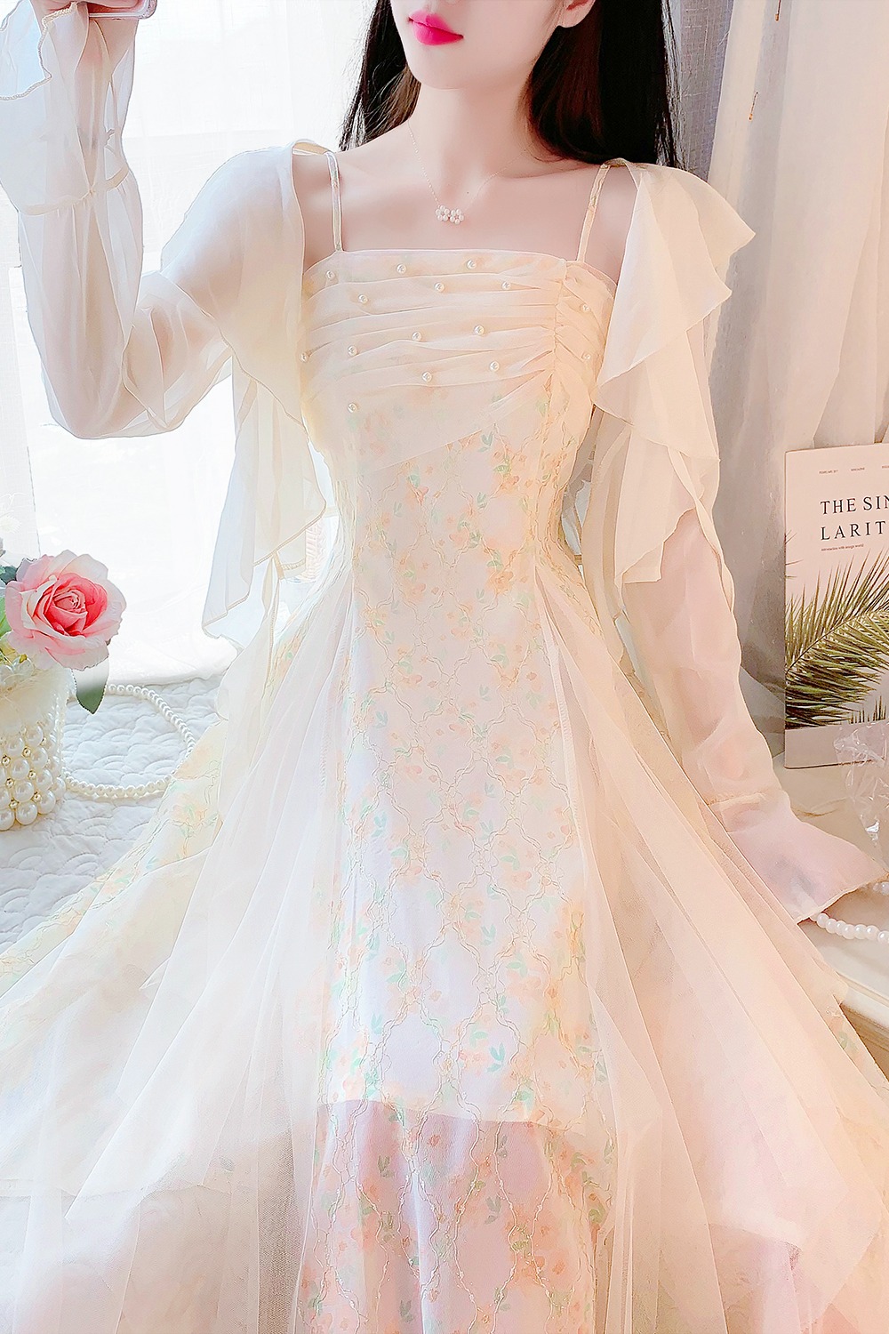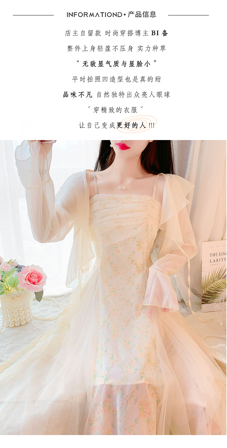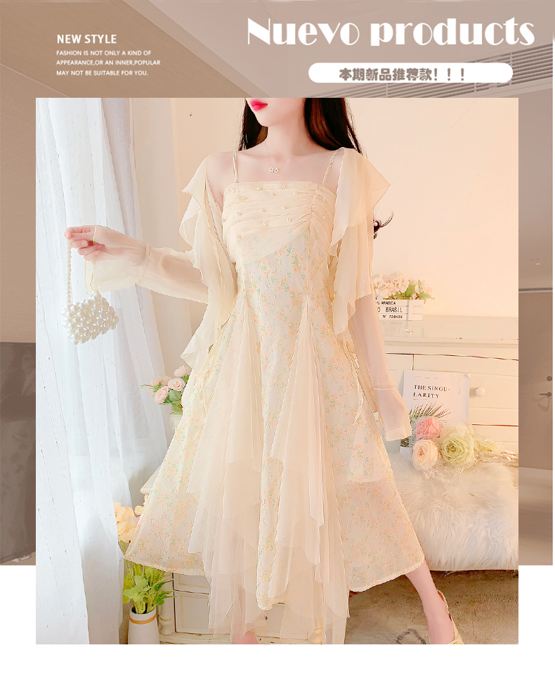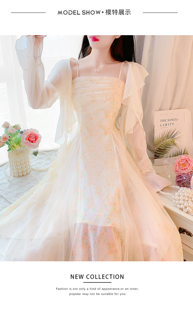실사 26 여름 달콤함 망사 슬립 프린트 요정 드레스 긴팔 자외선 차단 오픈 가디건 두 조각 패션 세트 여성