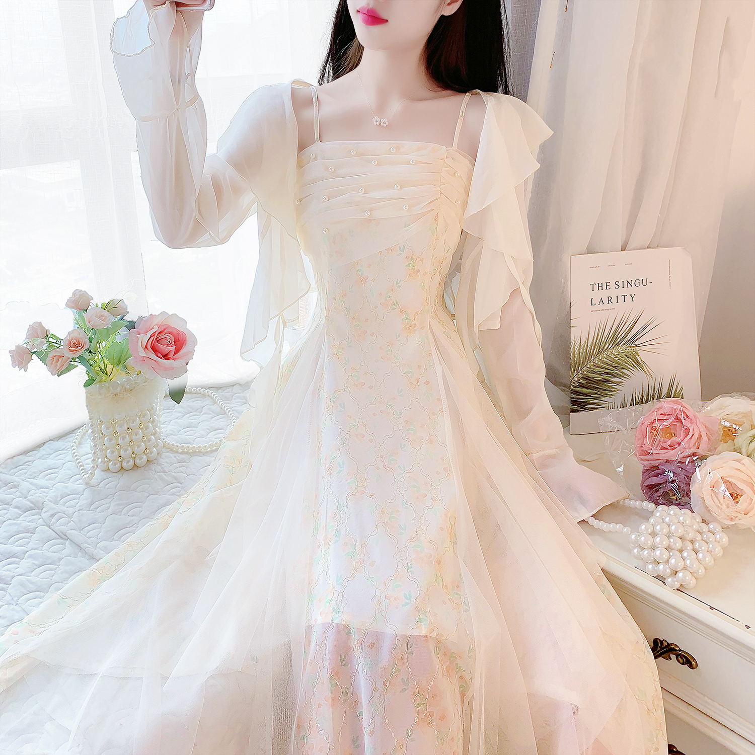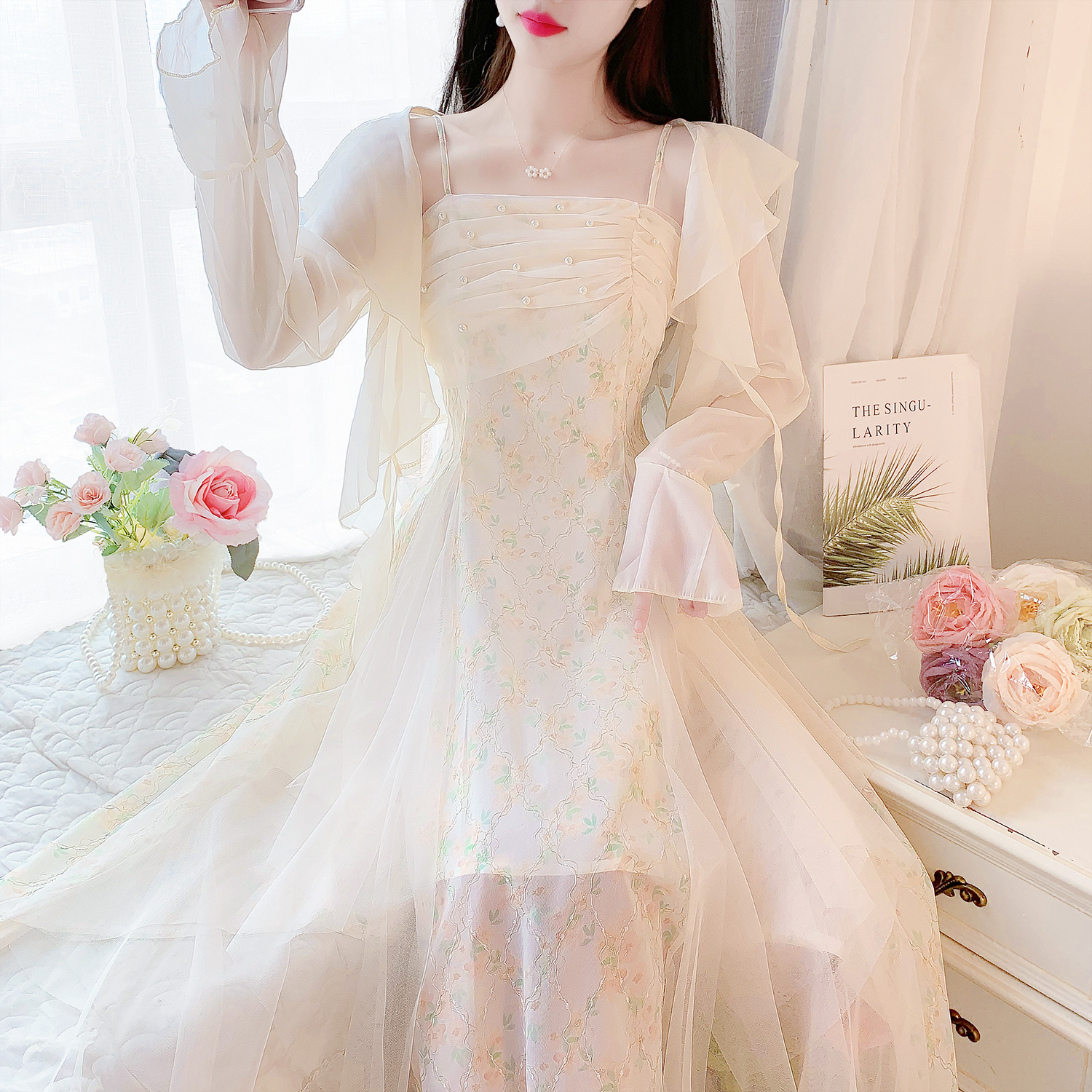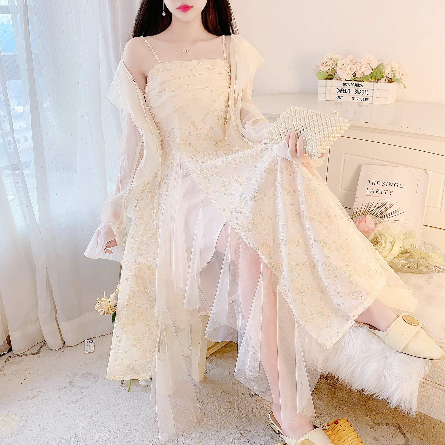 실사 26 봄 여름 점프 슈트 치마 세트 프랑스식 프린트 꽃무늬 요정 치마 슬립 롱 스커트 긴팔 자외선 차단 오픈 가디건