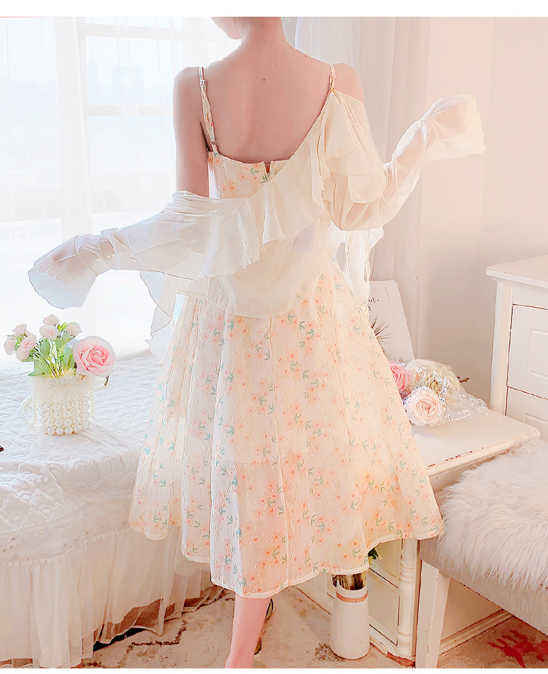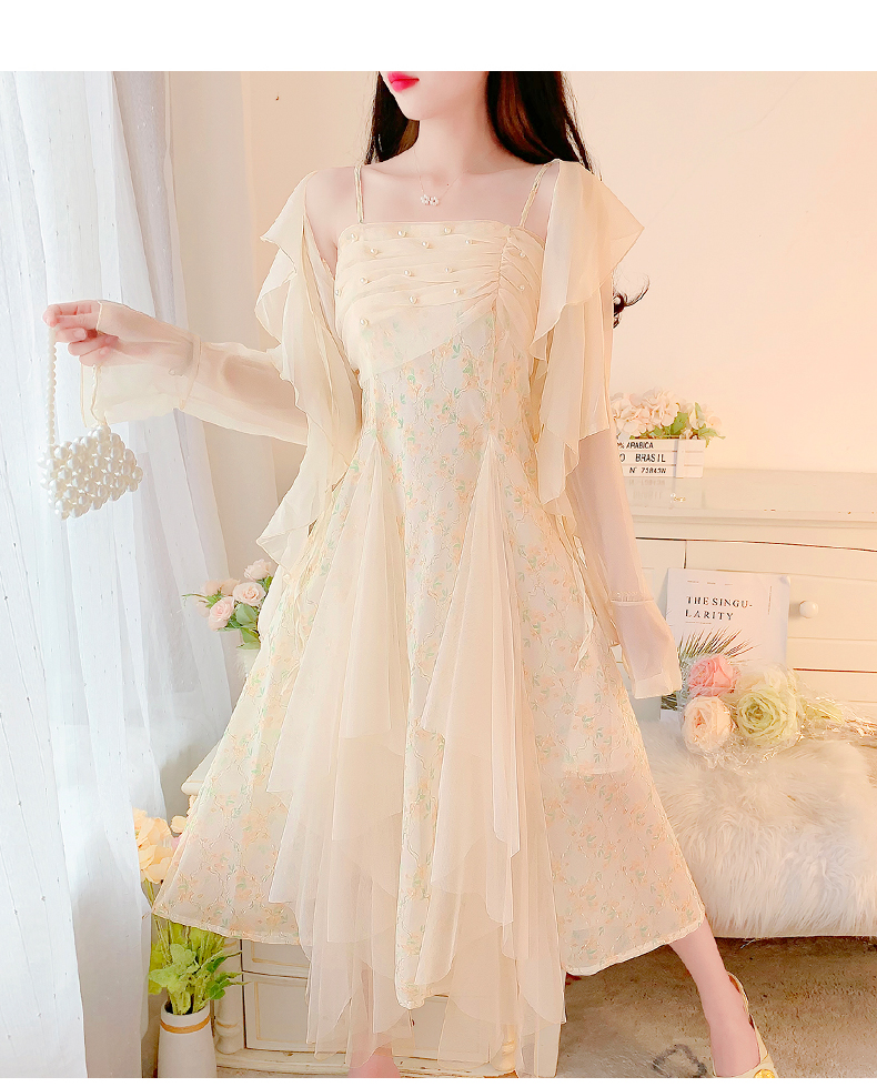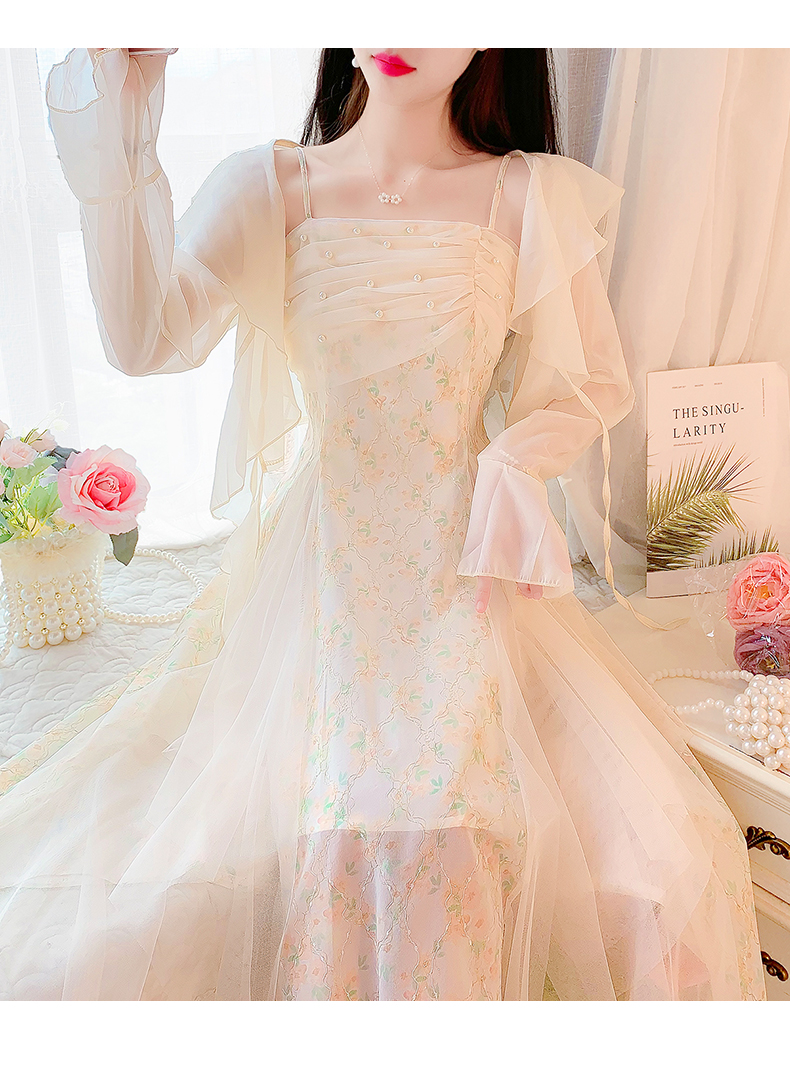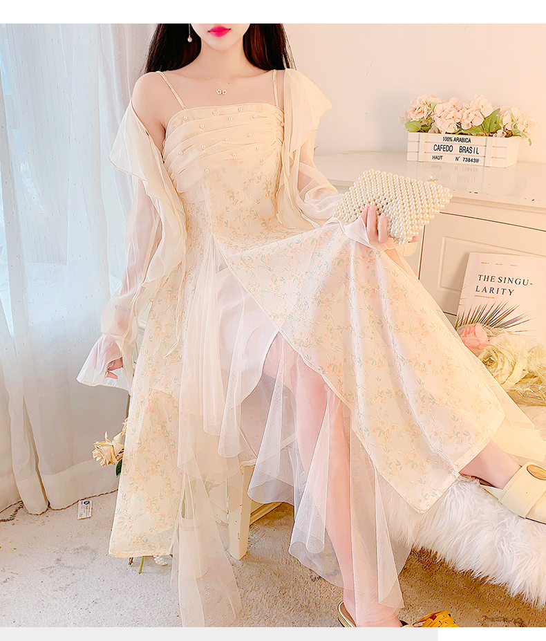 실사 26 봄 여름 점프 슈트 치마 세트 프랑스식 프린트 꽃무늬 요정 치마 슬립 롱 스커트 긴팔 자외선 차단 오픈 가디건