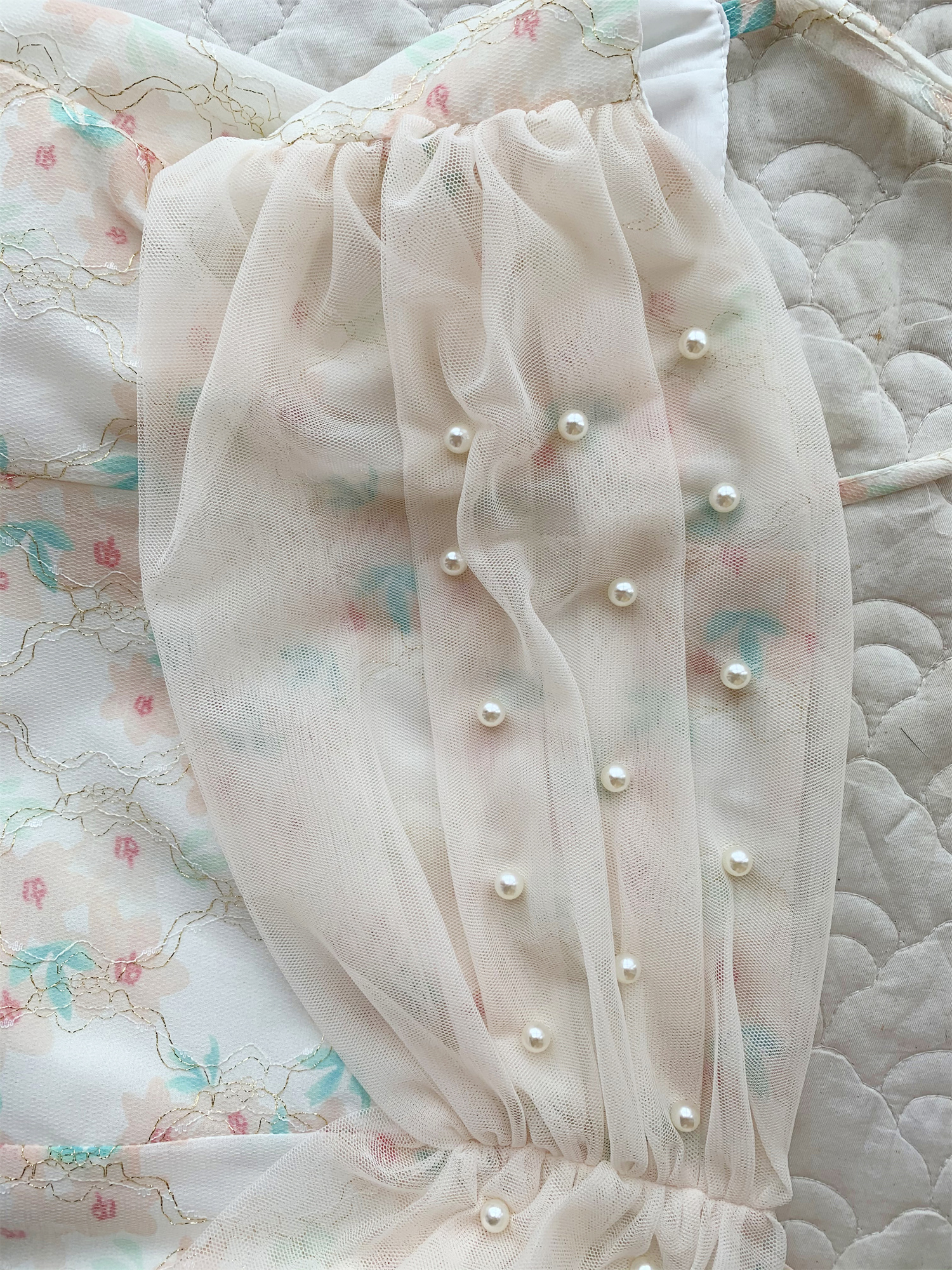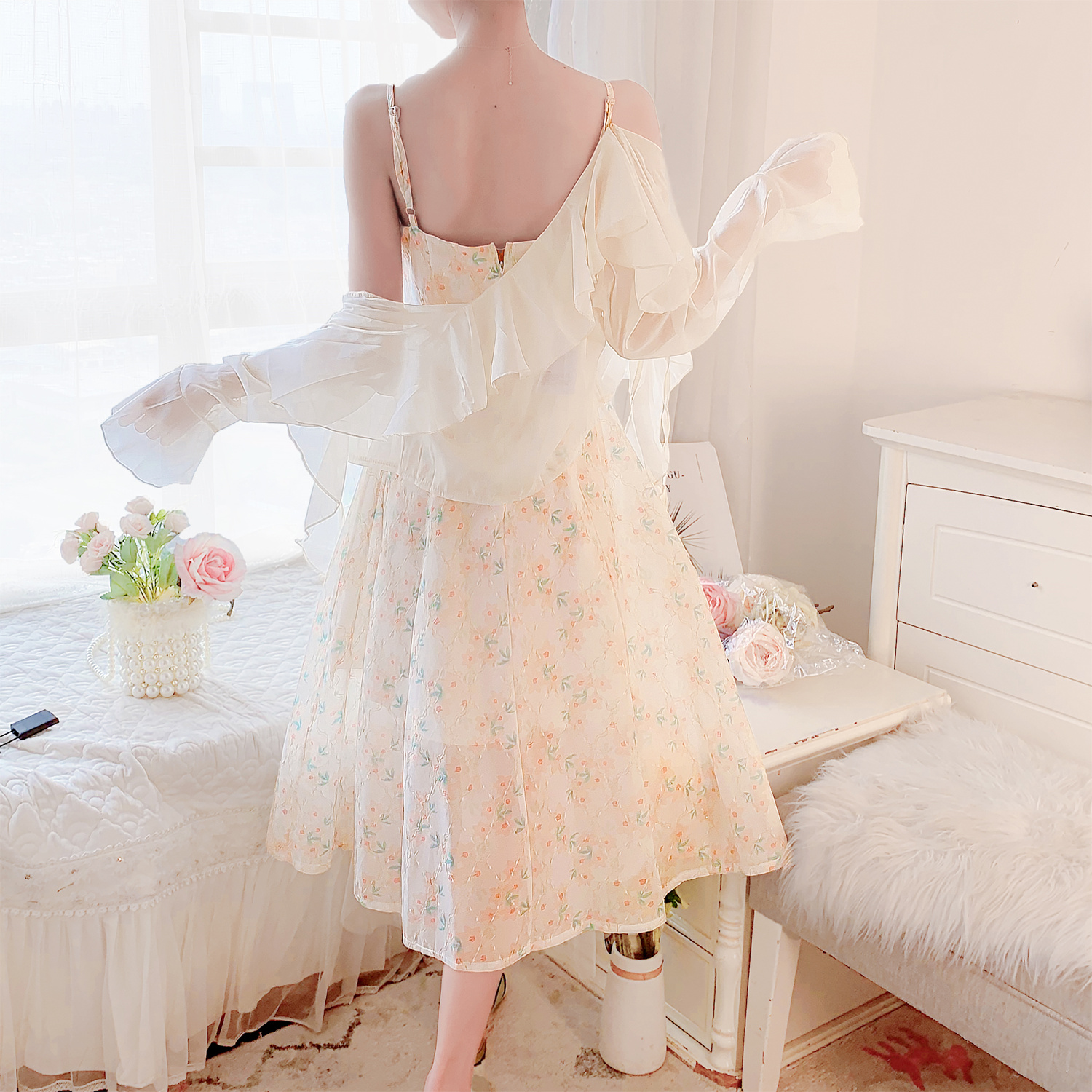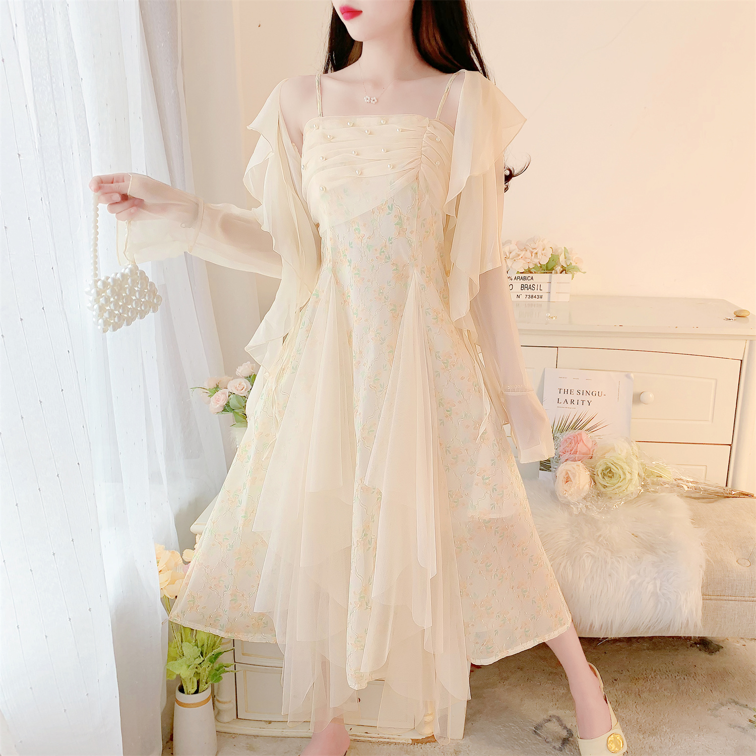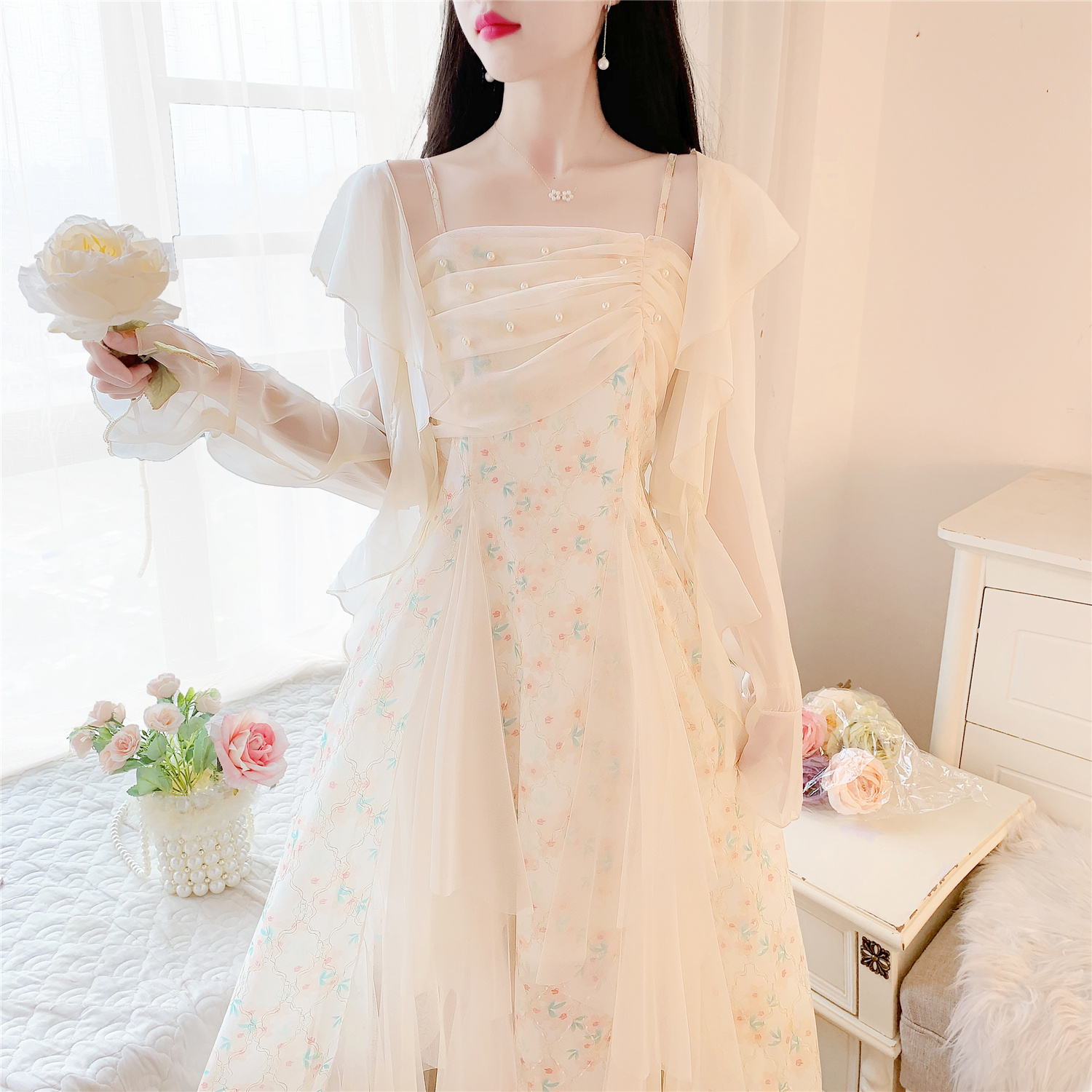 실사 26 봄 여름 점프 슈트 치마 세트 프랑스식 프린트 꽃무늬 요정 치마 슬립 롱 스커트 긴팔 자외선 차단 오픈 가디건