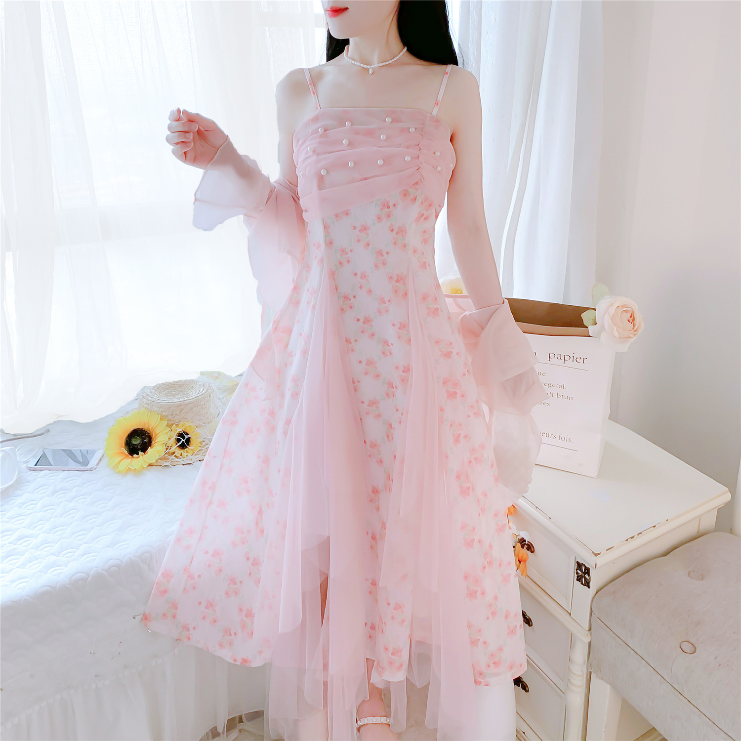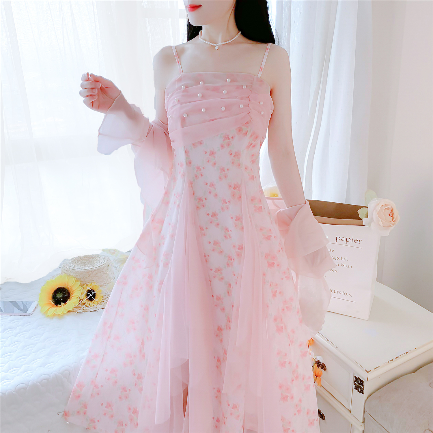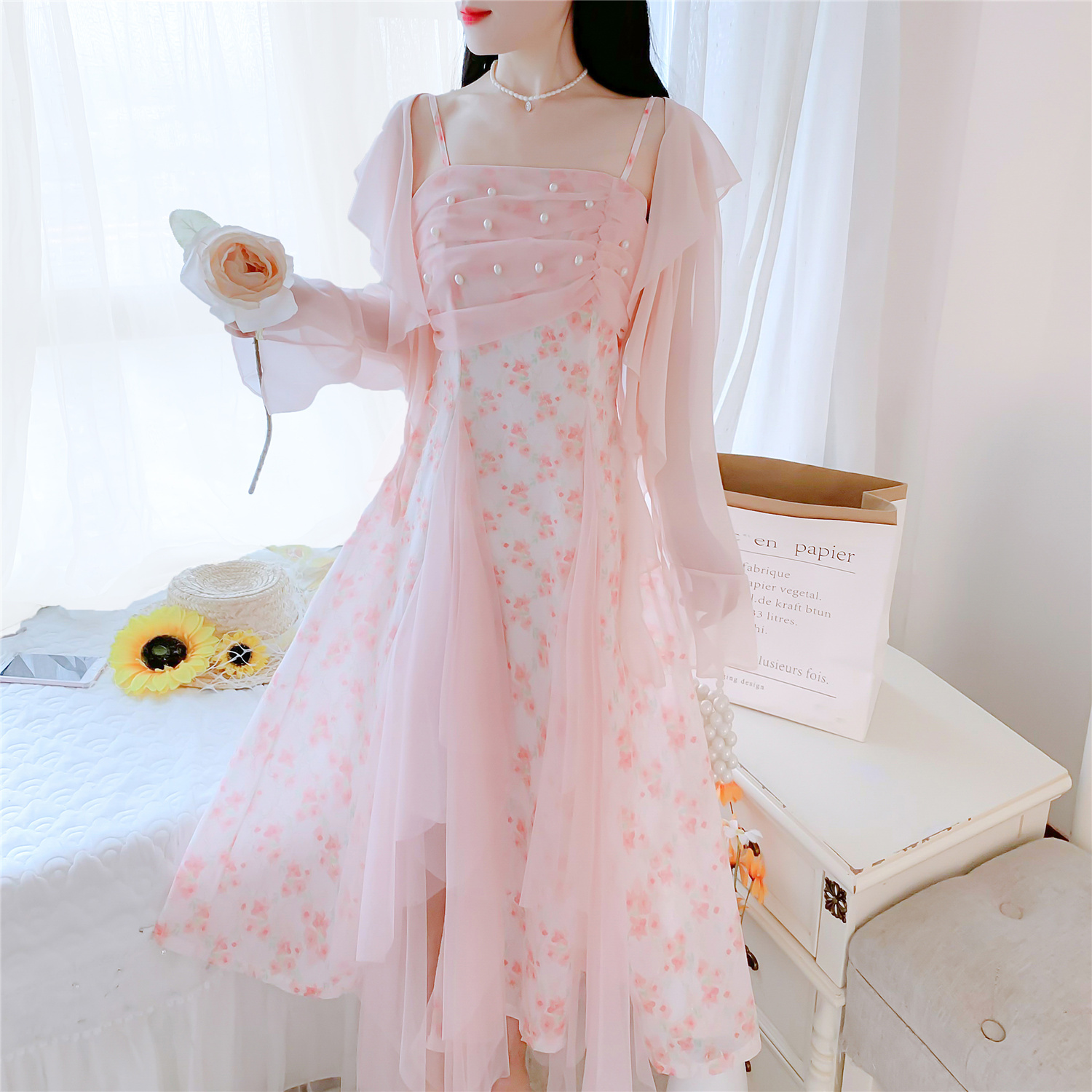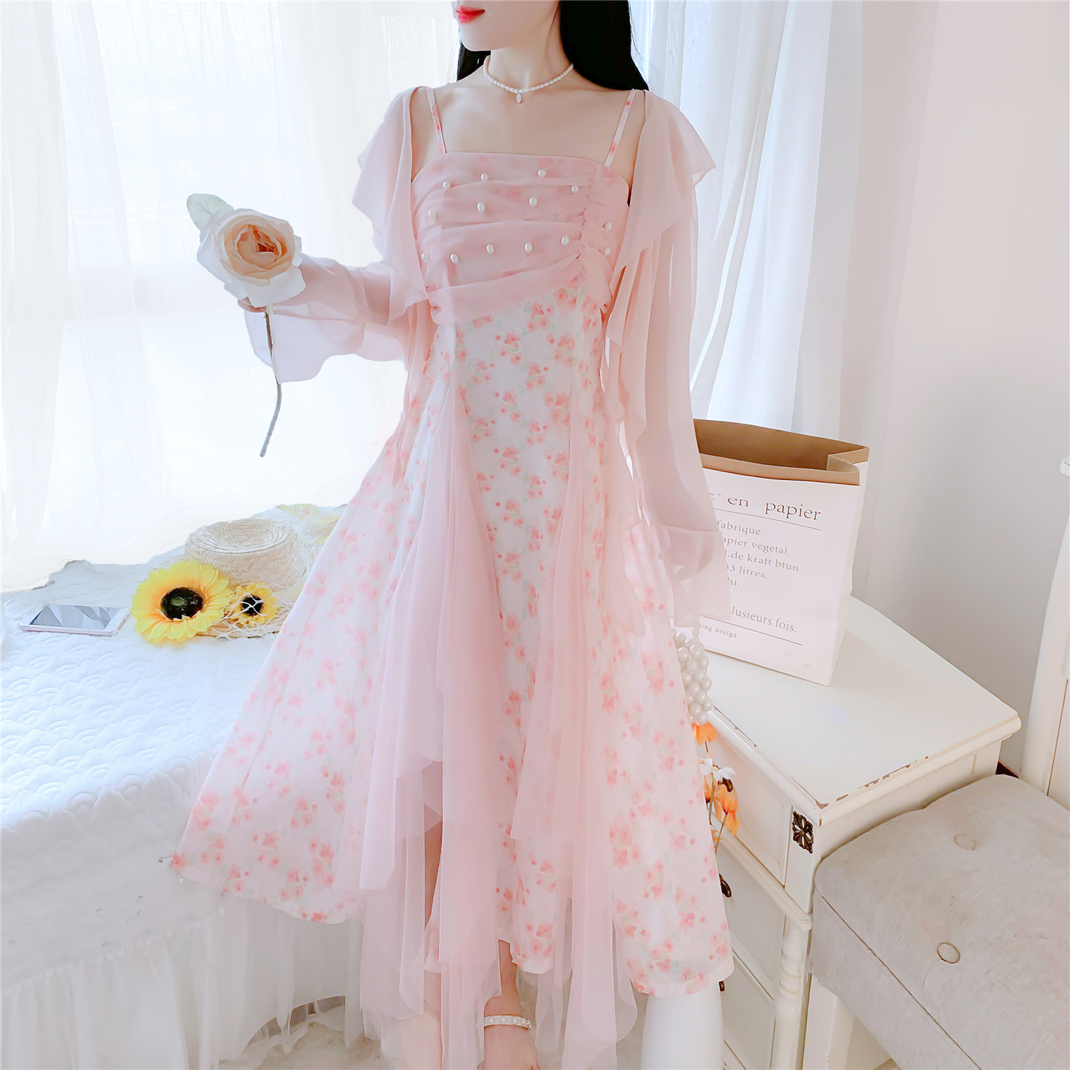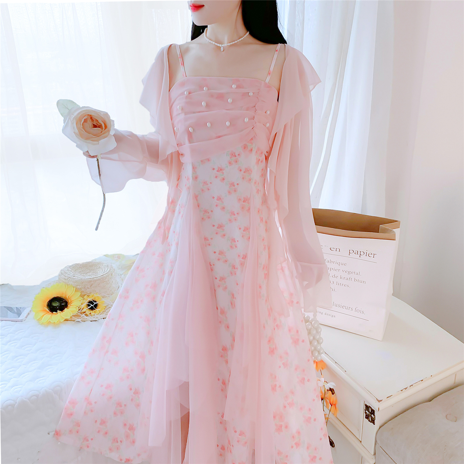 실사 핑크색 꽃무늬 여성 드레스 여름 부드러운 품격 허리 수축 롱 코트 슬립 치마 세트