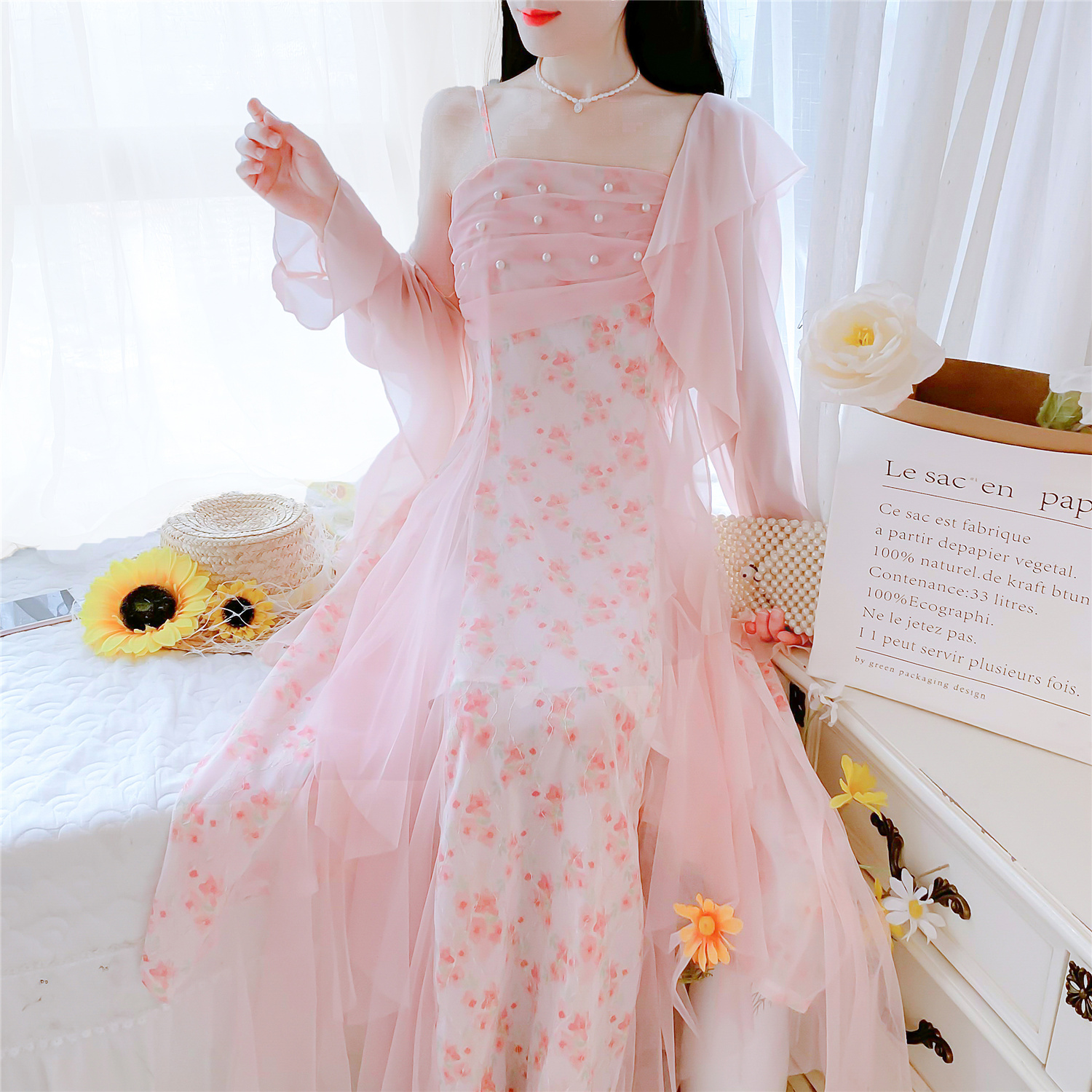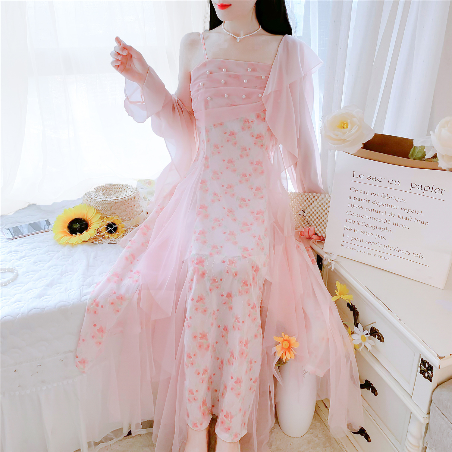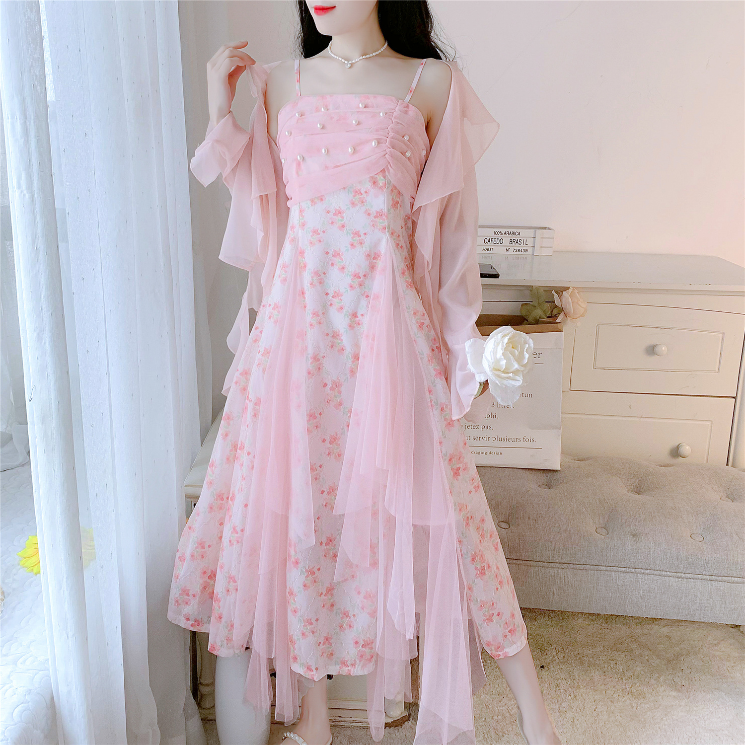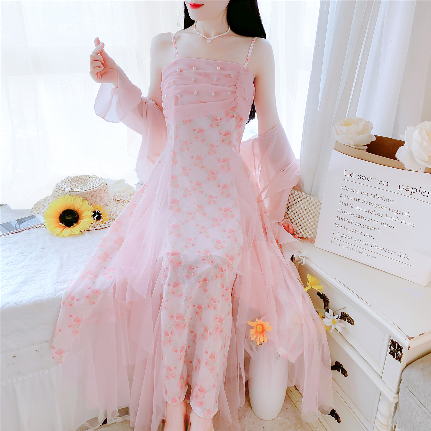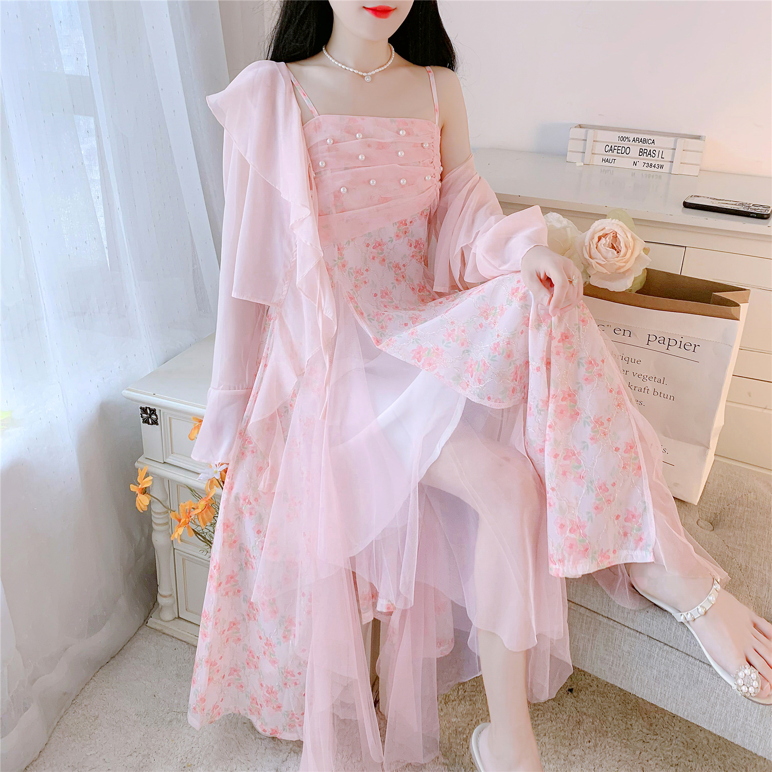 실사 핑크색 꽃무늬 여성 드레스 여름 부드러운 품격 허리 수축 롱 코트 슬립 치마 세트