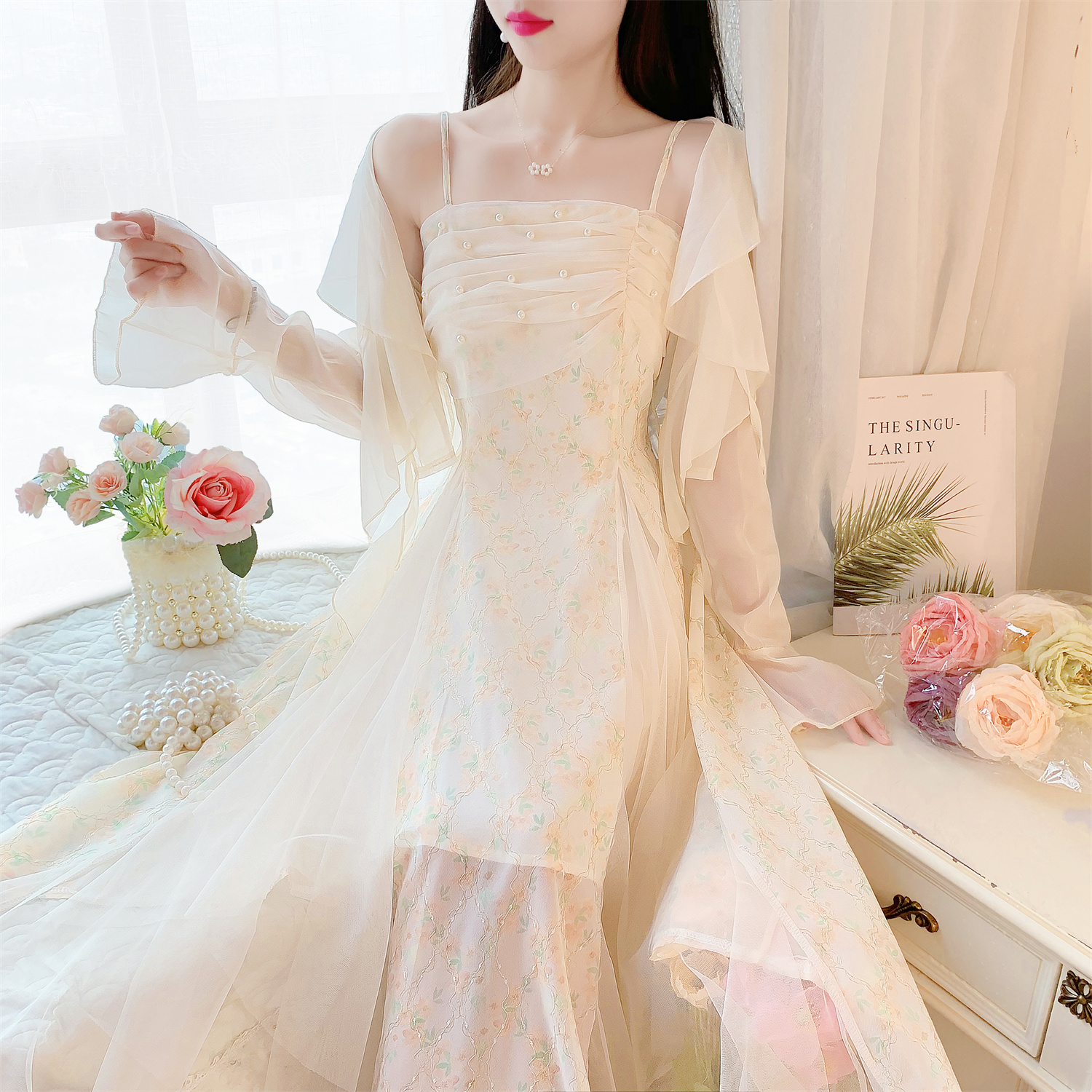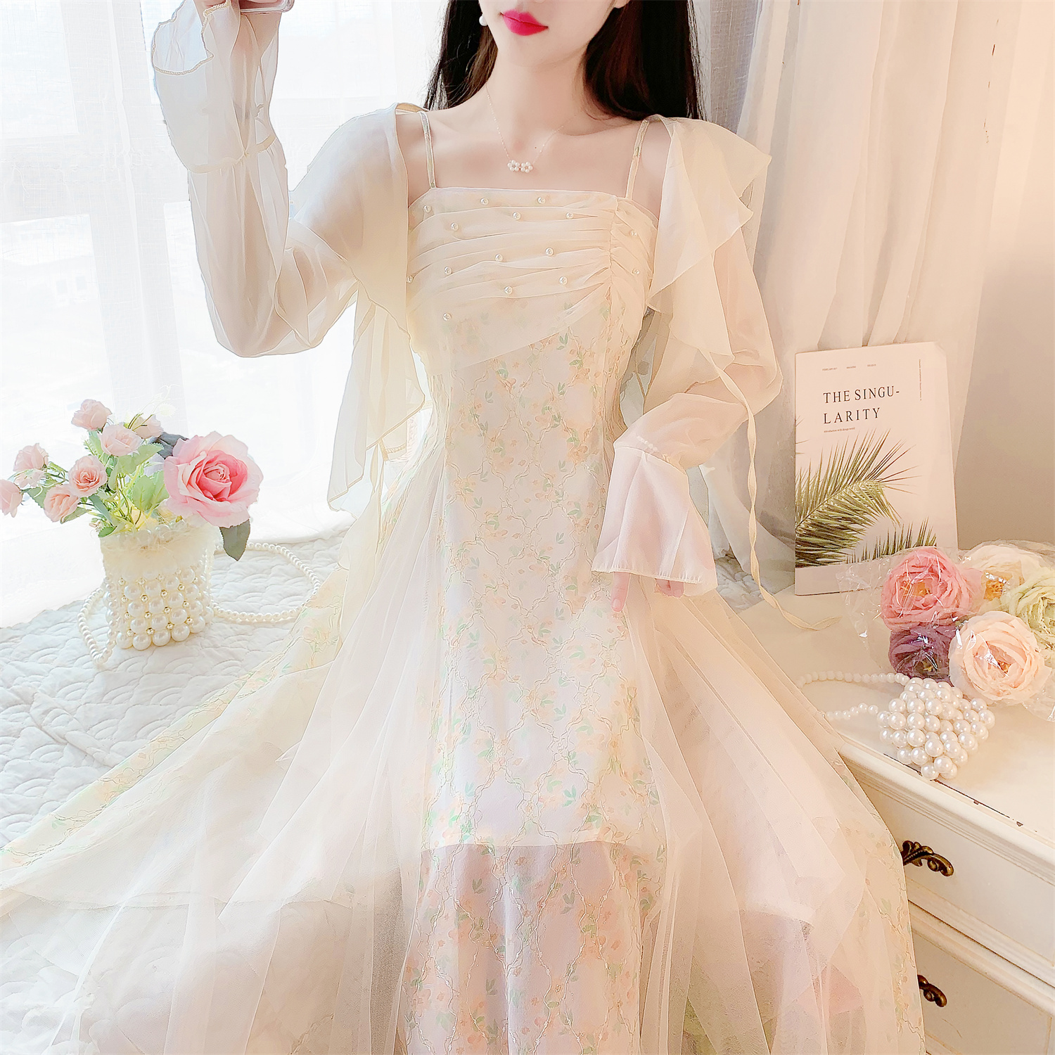 실사 26 여름 달콤함 망사 슬립 프린트 요정 드레스 긴팔 자외선 차단 오픈 가디건 두 조각 패션 세트 여성
