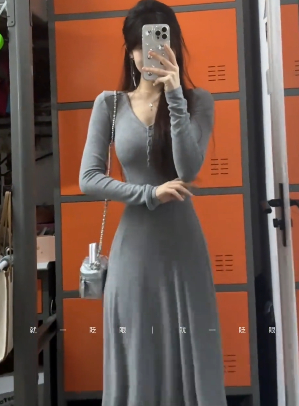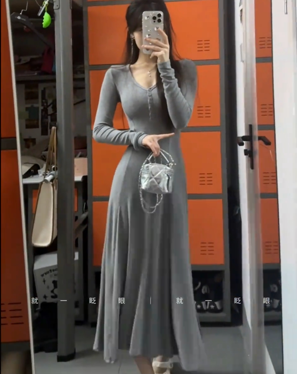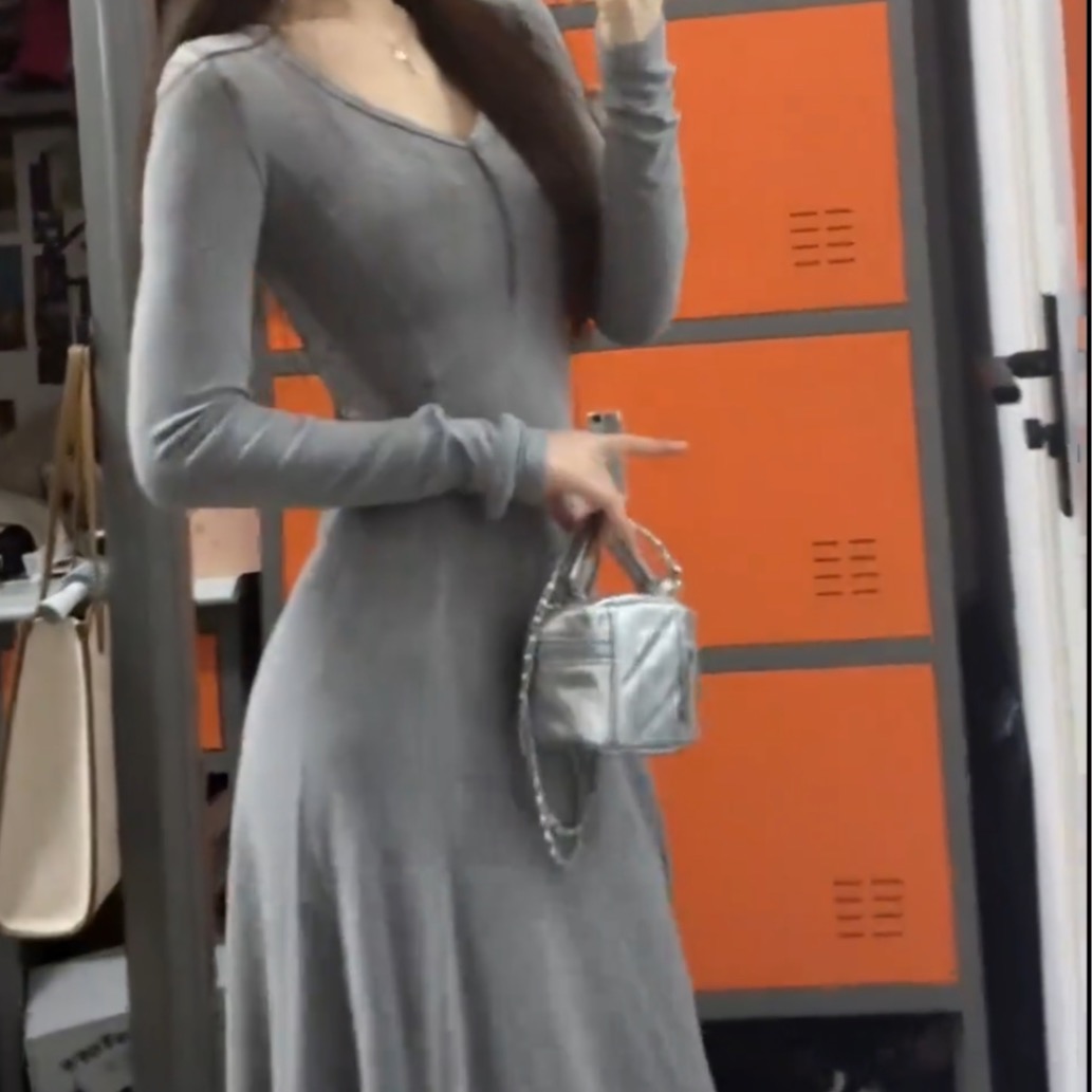 2026 봄 새로운 프랑스식 품격 빛 요리 한 바람 V넥 긴팔 하이웨이스트 몸매 가꾸기 슬림해 보이는 드레스 롱 스커트 여성
