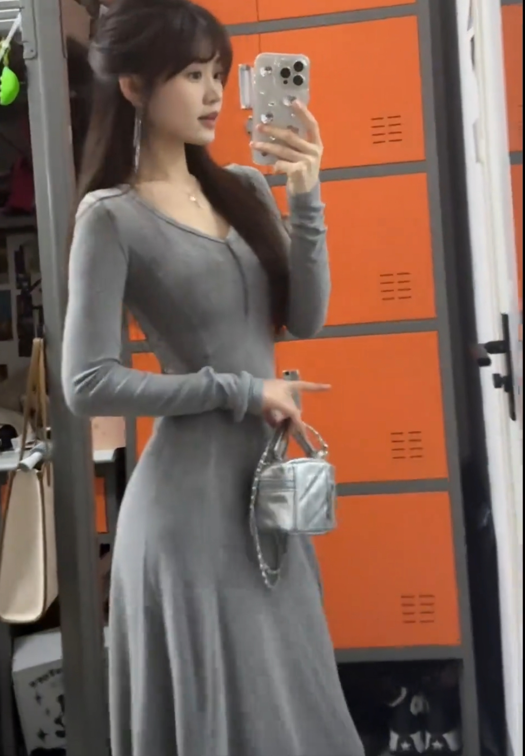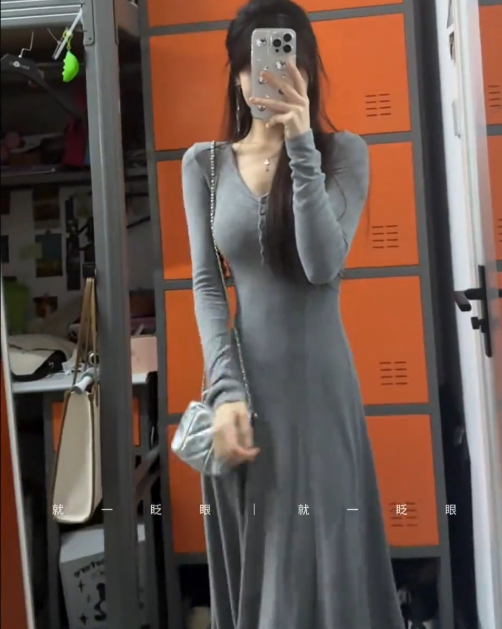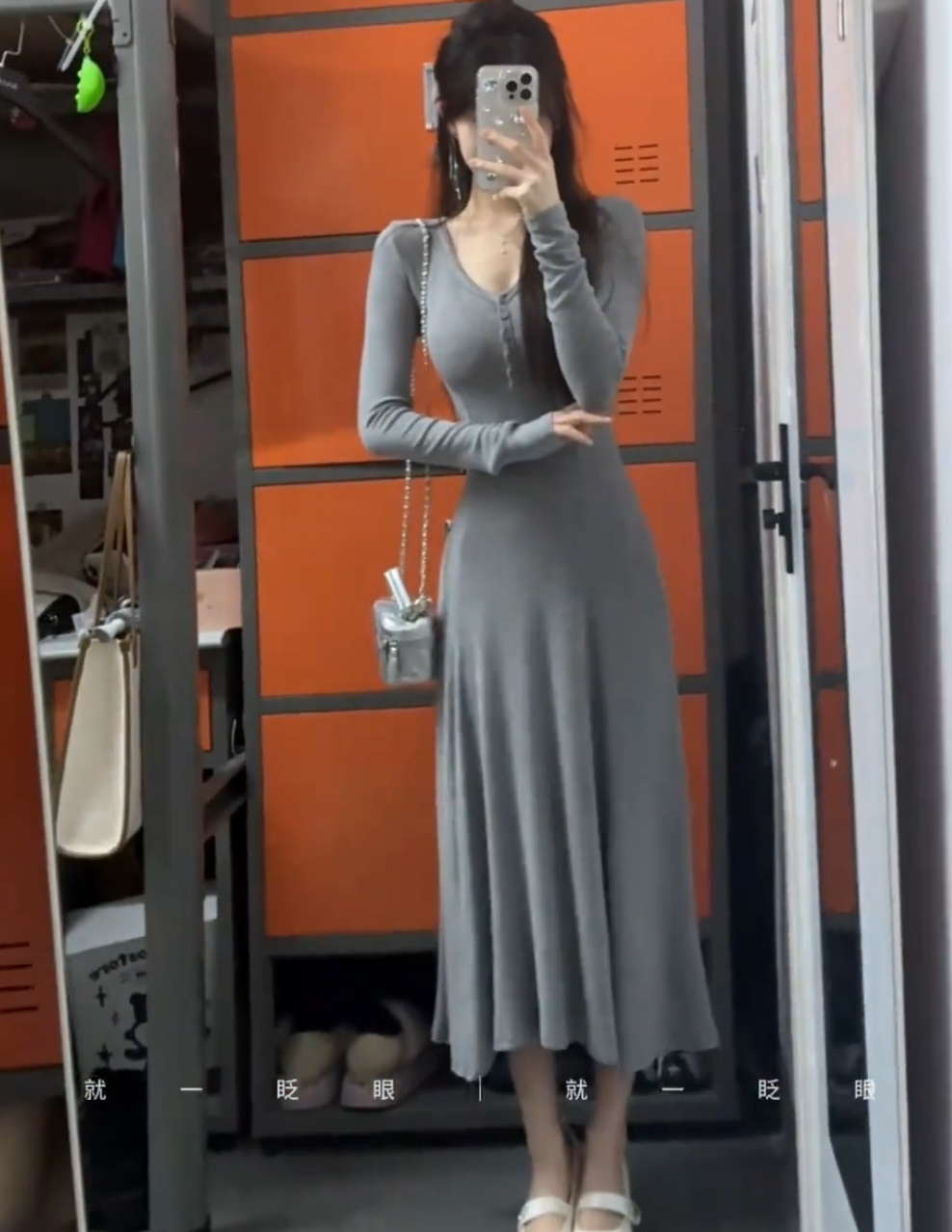 2026 봄 새로운 프랑스식 품격 빛 요리 한 바람 V넥 긴팔 하이웨이스트 몸매 가꾸기 슬림해 보이는 드레스 롱 스커트 여성