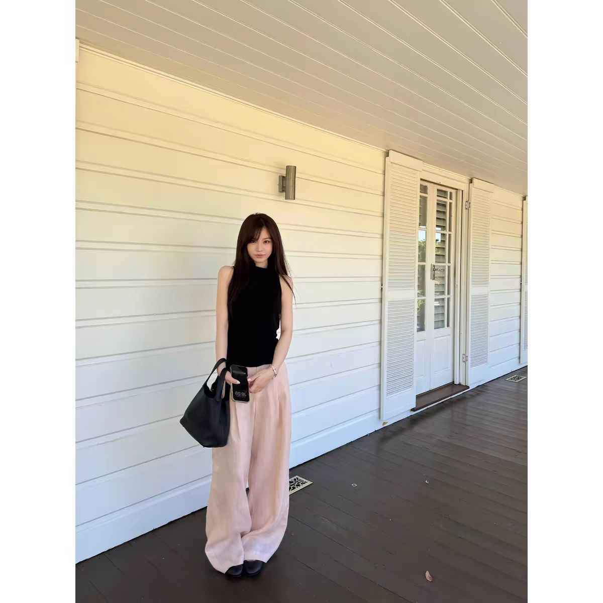 yuyureal 산소 100 전체 아마 여름 에어컨 화이트 핑크색 캐주얼 바지 도루 센스 넓은 다리 면 린넨 바지