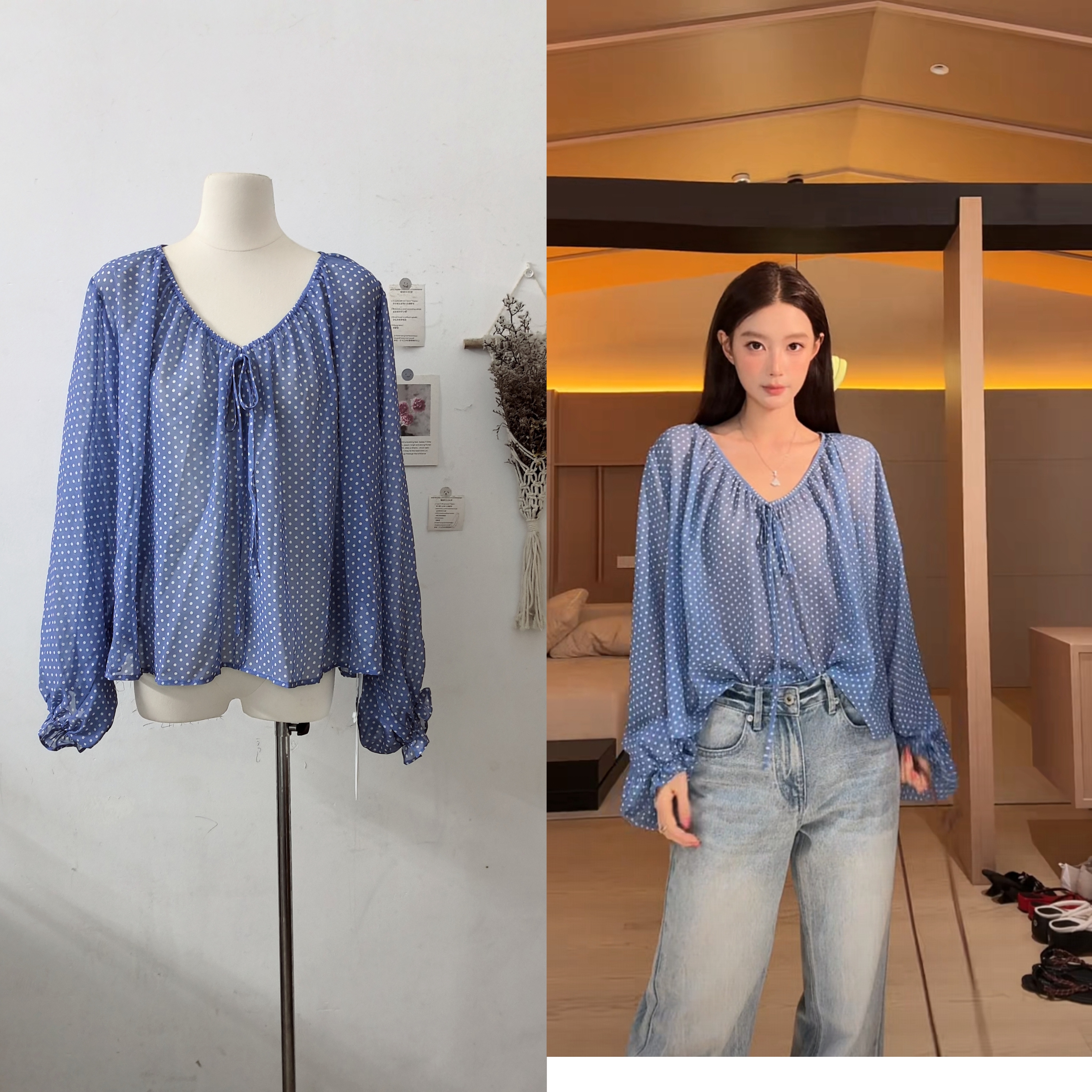 오프숄더 도트 무늬 스트랩 얇은 스타일 쉬폰 여성 셔츠 여름 마이크로 ~을 통해 루즈핏 긴팔 맨위