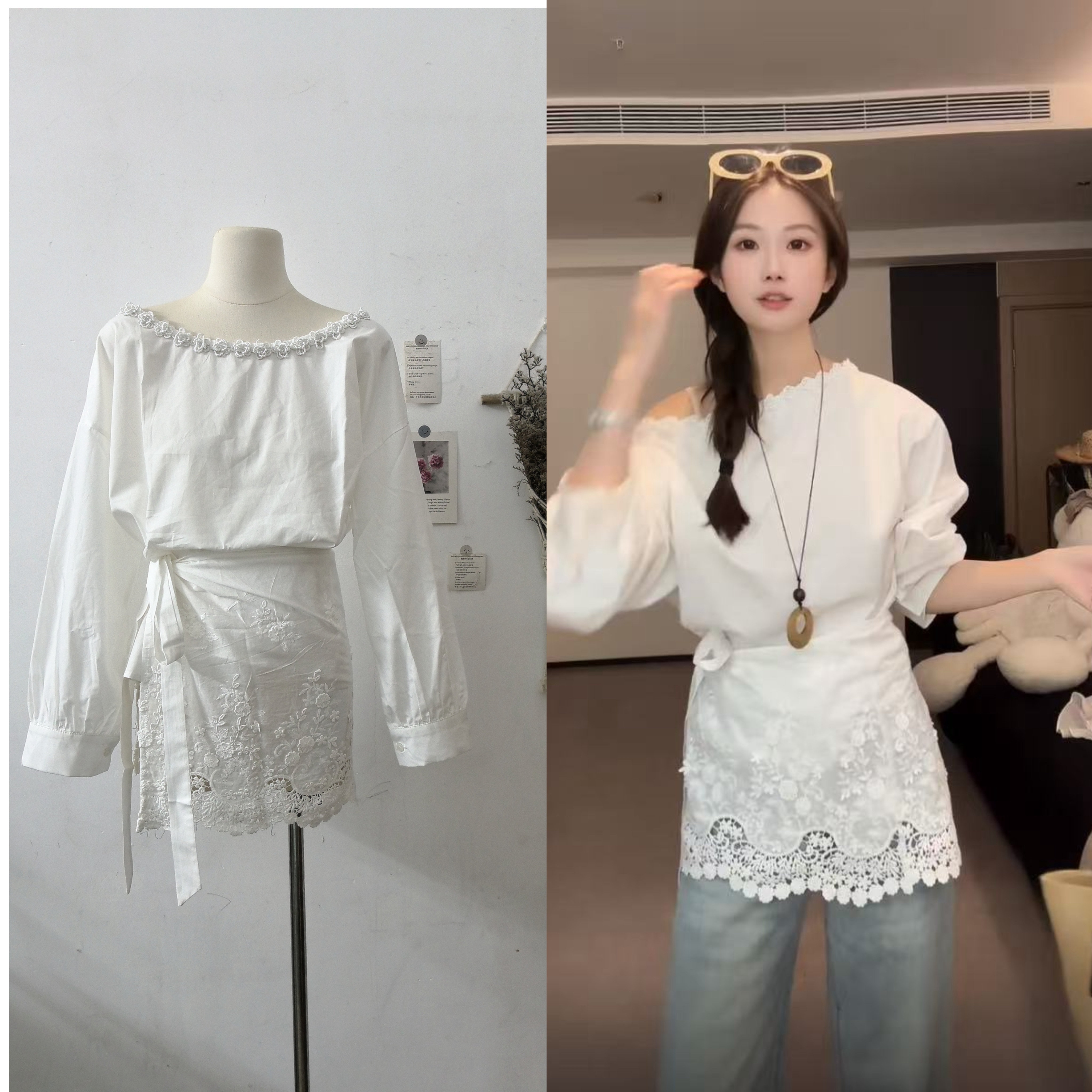 봄 새로운 꽃 네클라인 레이스 디자인 비스듬한 어깨 긴팔 셔츠 탈착식 방귀 커튼 코디