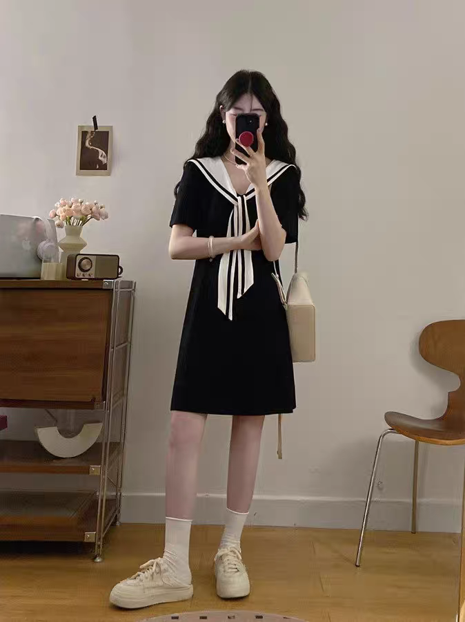 학원 스타일 해군 칼라 검정색 한 마디 여성 드레스 프랑스식 품격 디자인 센스 허리 수축 슬림해 보이는 거품 소매 미니 스커트