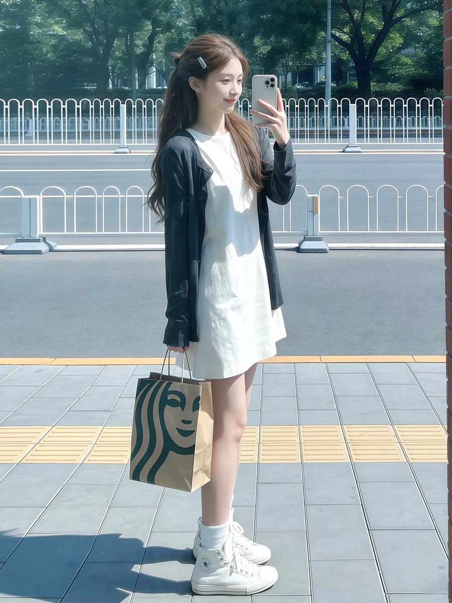 봄 드레스 코디 전체 집합 한 부서 착용 가져 가라. 도트 무늬 쉬폰 셔츠 스택 착용 데님 베스트 반신 스커트 세 조각 세트