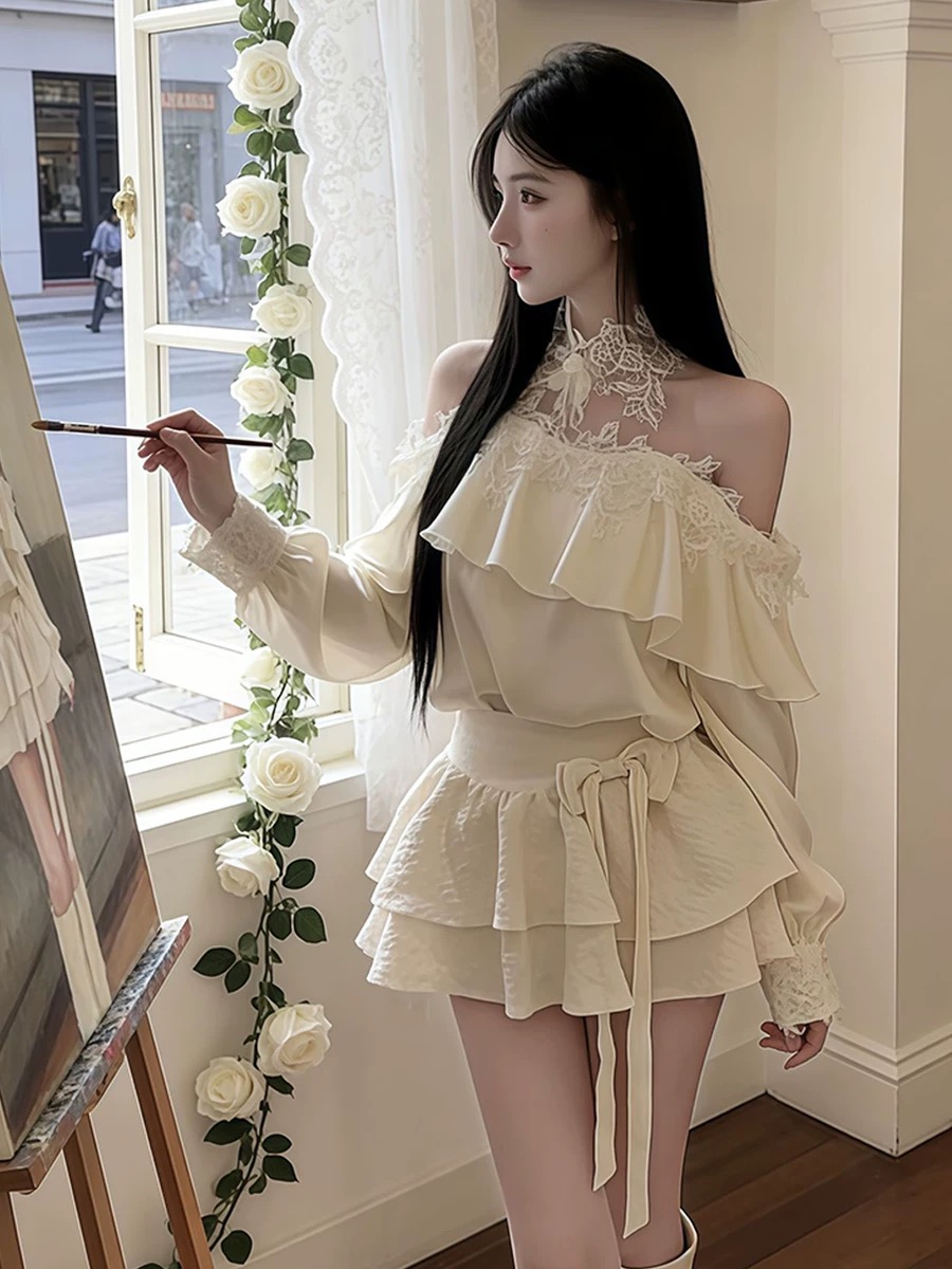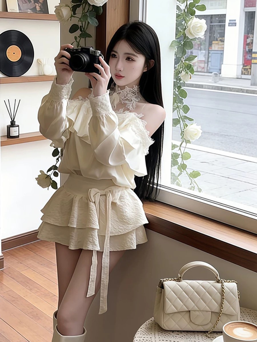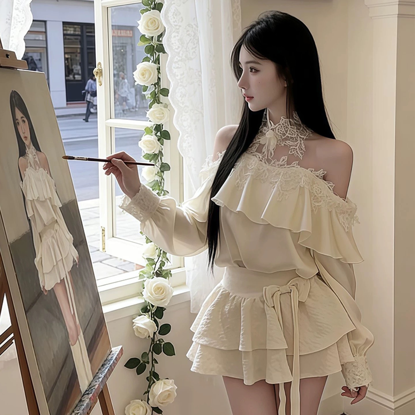 프랑스식 품격 레이스 오프숄더 긴팔 맨위 퍼프 케이크 미니 스커트 여성 의류 2026 봄 여름 새로운 아름다운 세트