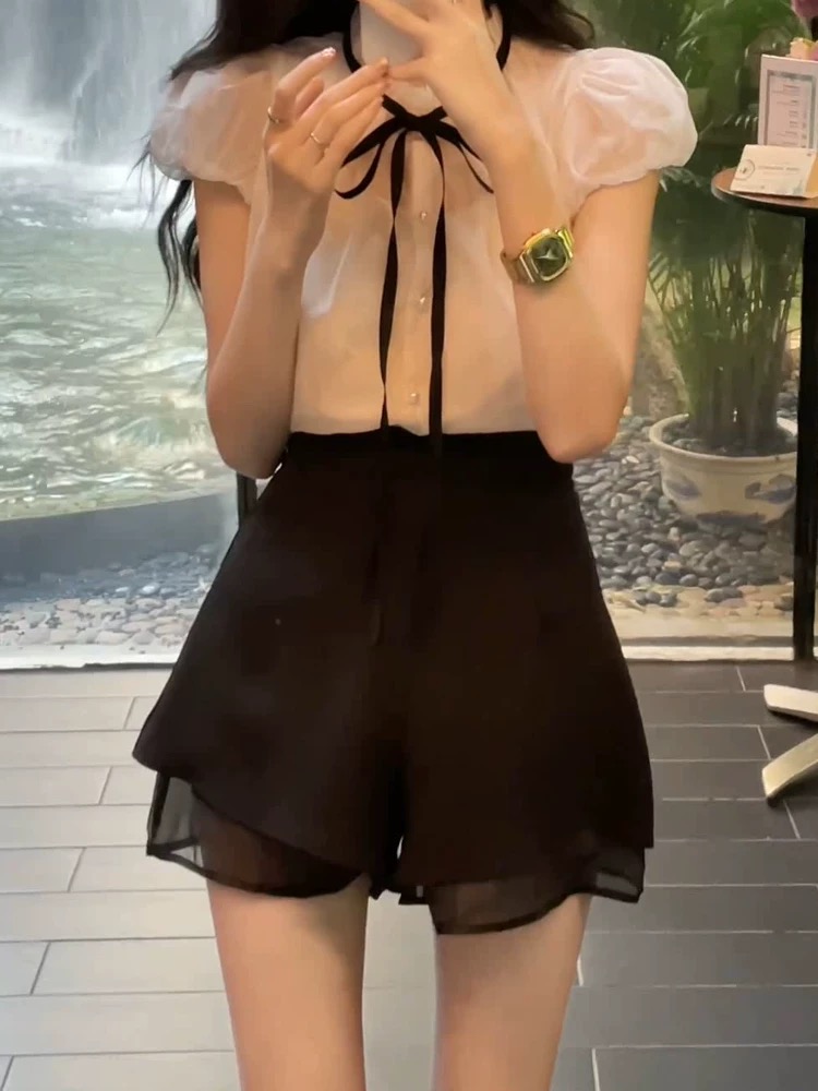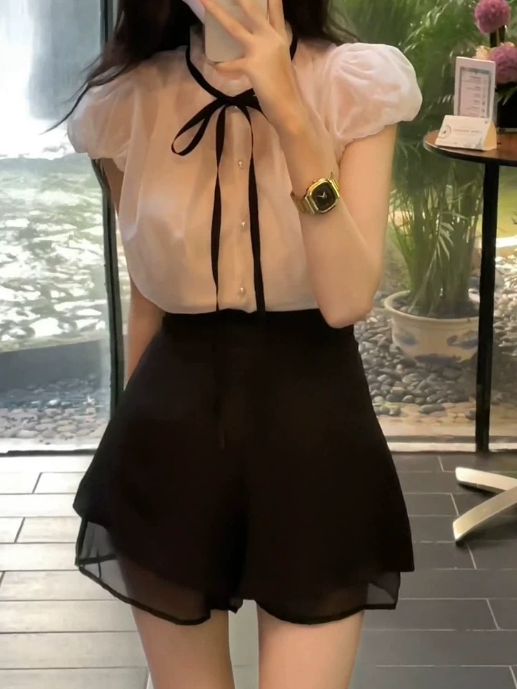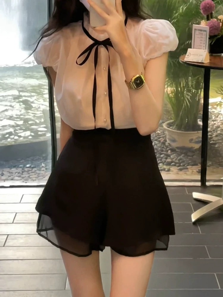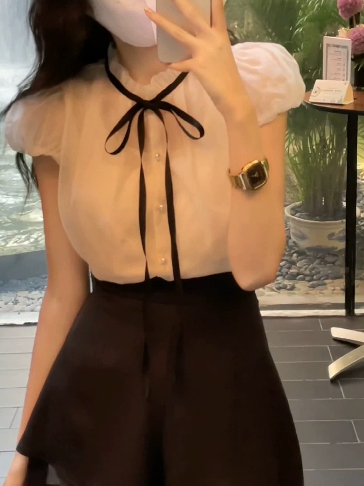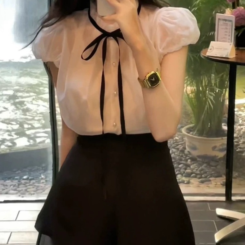 디자인 센스 작은 대중 프랑스식 Chic 나비 넥타이 레이스 거품 소매 쉬폰 톱 반팔 여성 셔츠 여름