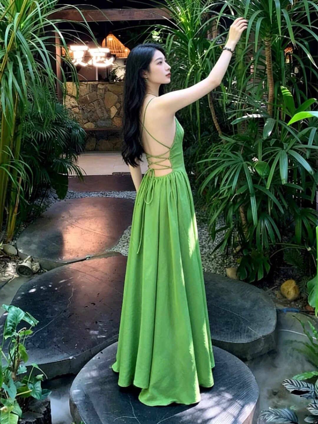 하나 달콤한 복숭아 yikett 인간 그린 필드 여름 휴가 백리스 슬립 여성 드레스 품격 롱 스커트