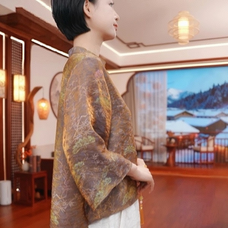 새로운 중식 국풍 스탠드 칼라 7부 소매 녹색 맨위 여성 고급 센스 작은 대중 Chic 품격 루즈핏 다용도 셔츠