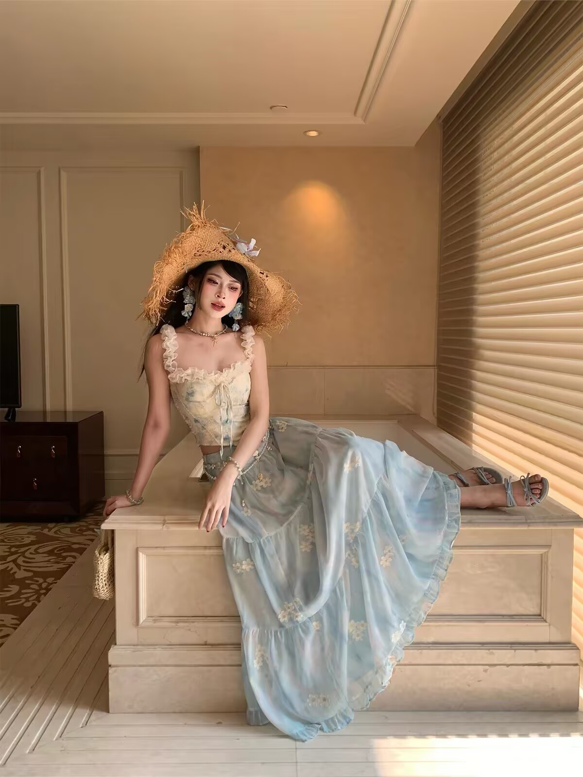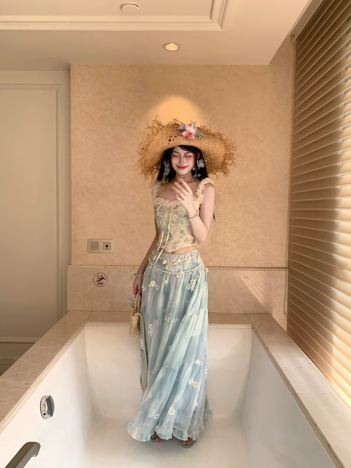 gege shop 꽃무늬 레이스 레이스 캐미솔 파란색 꽃 롱 코트 반신 스커트 휴가 착용 가져 가라.
