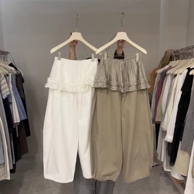 2026 여름 빅 사이즈 여성 프릴 와이드 레그 팬츠 허리밴드 레이스 패치워크 9부 바지 다용도 캐주얼 바지