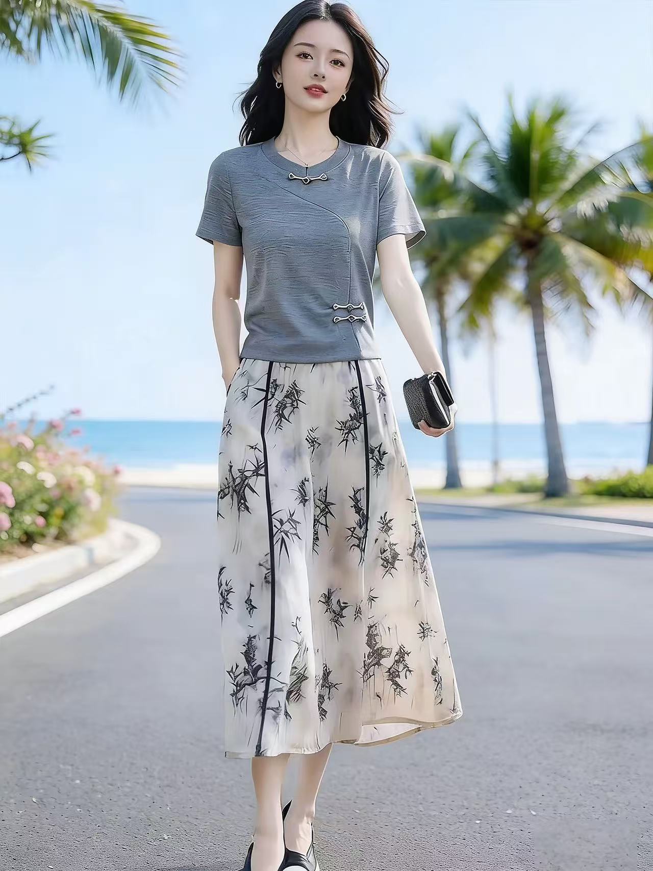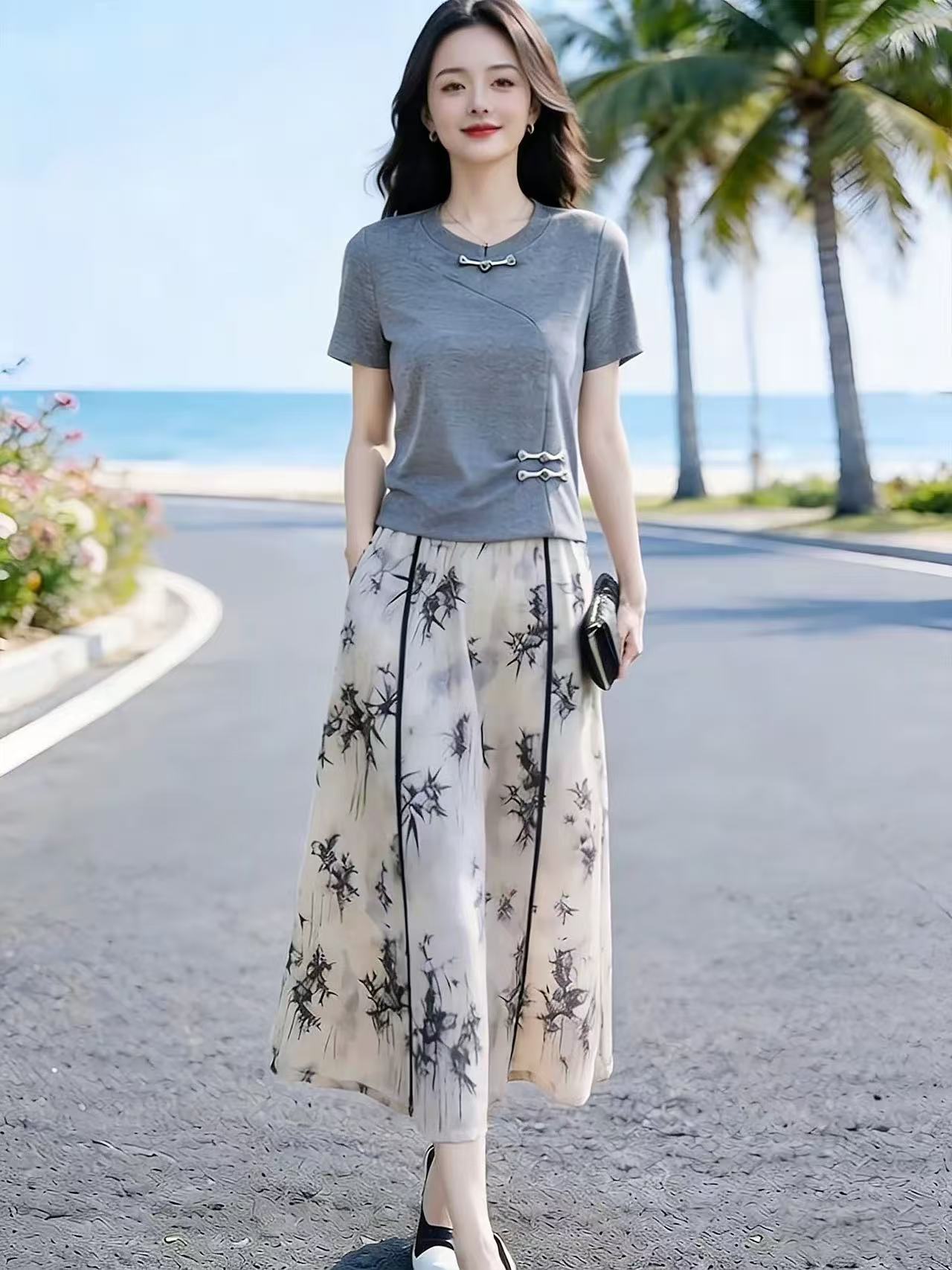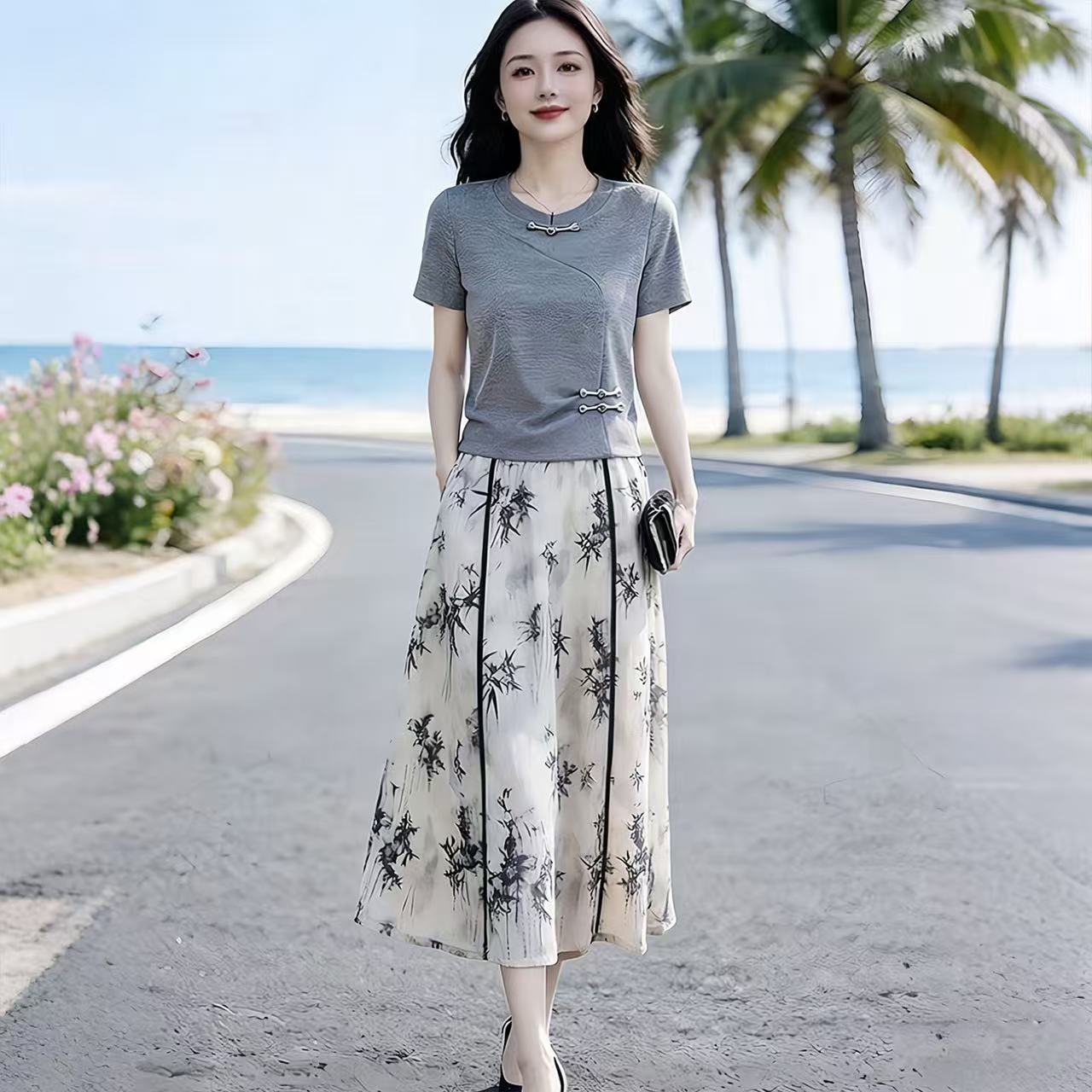 2026 문예 국풍 맨위 꽃무늬 반 스커트 품격 세트 여름 새로운
