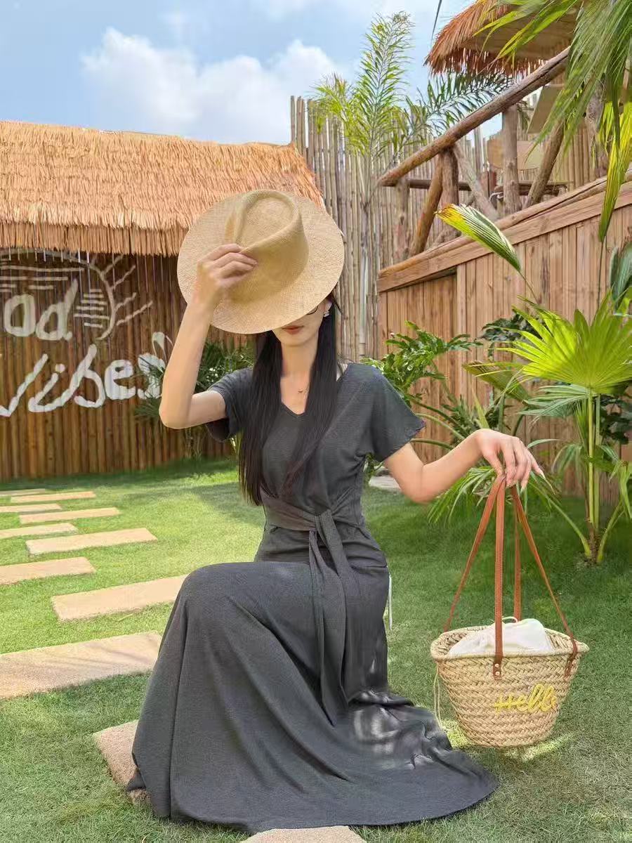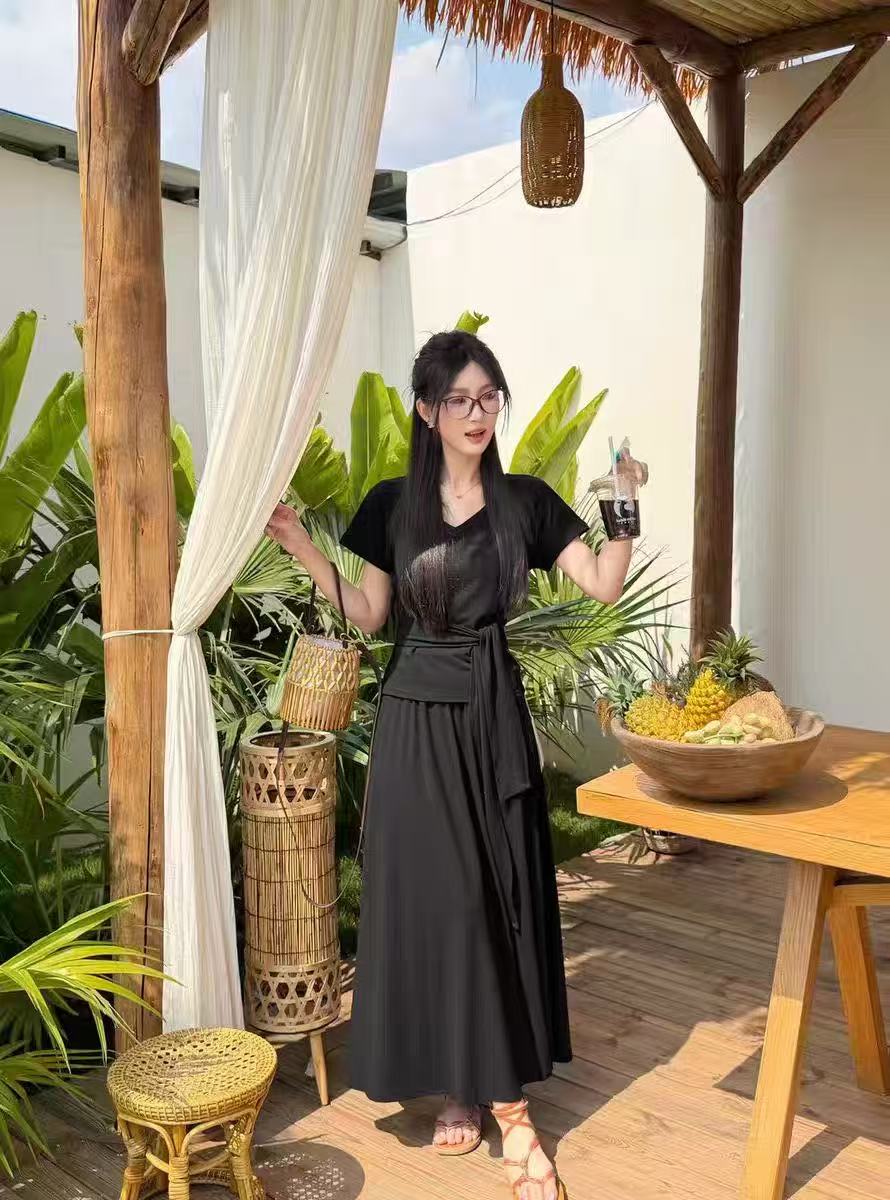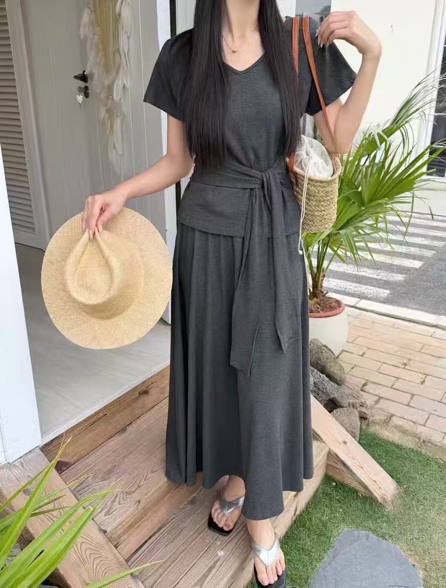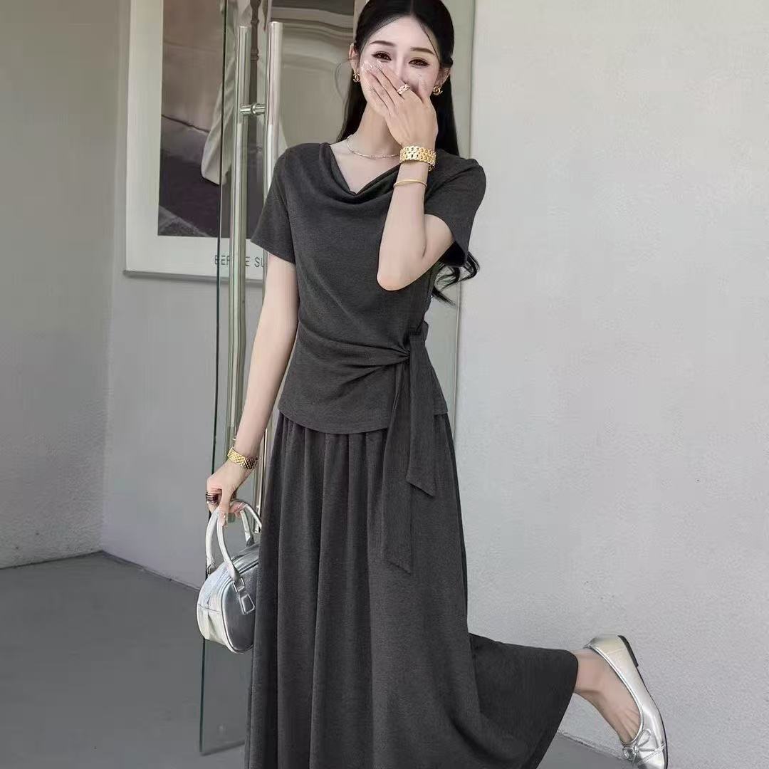새로운 한국 스타일 패션 캐주얼 스트랩 반팔 맨위 허리밴드 슬림해 보이는 반신 롱 스커트 투피스 세트