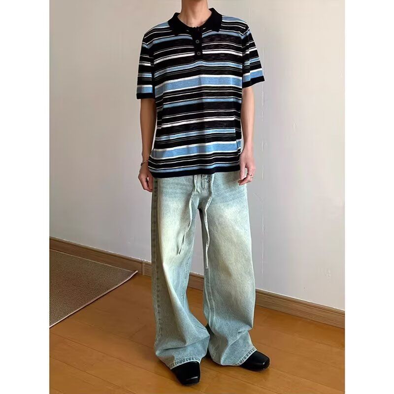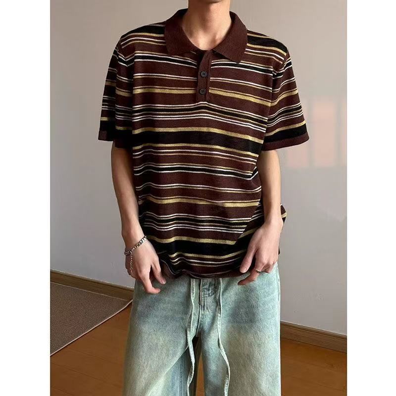 2026 새로운 얼음 실크 아마 니트 스웨터 레트로 스트라이프 폴로 칼라 POLO 셔츠 남자 반팔 니트 스웨터 여름 맨위
