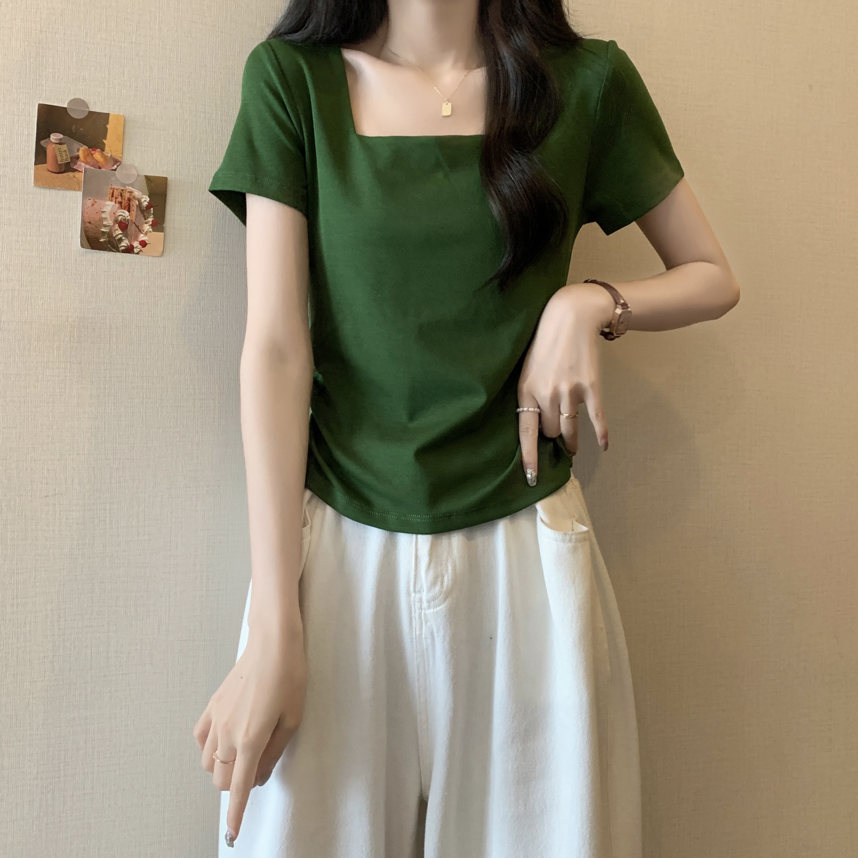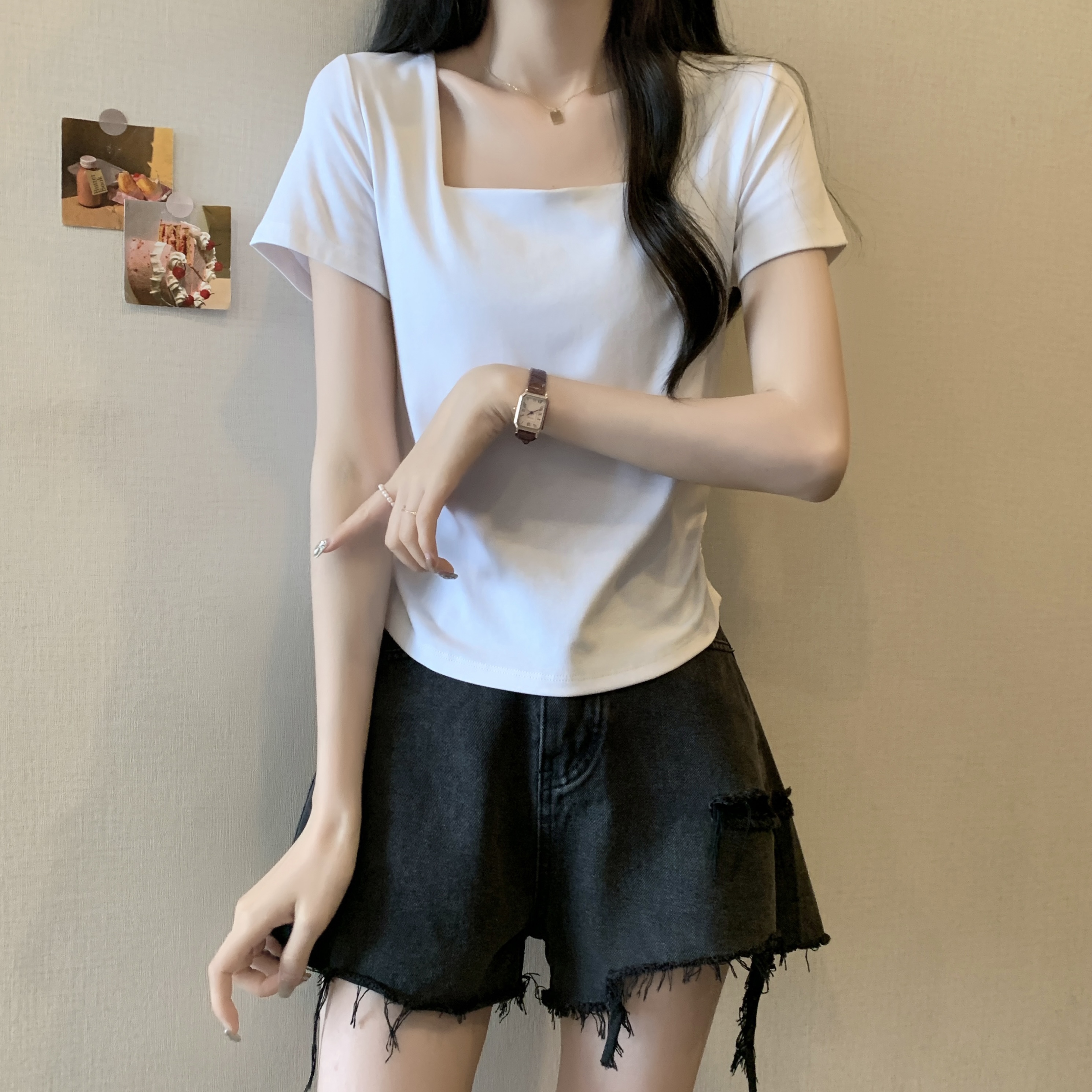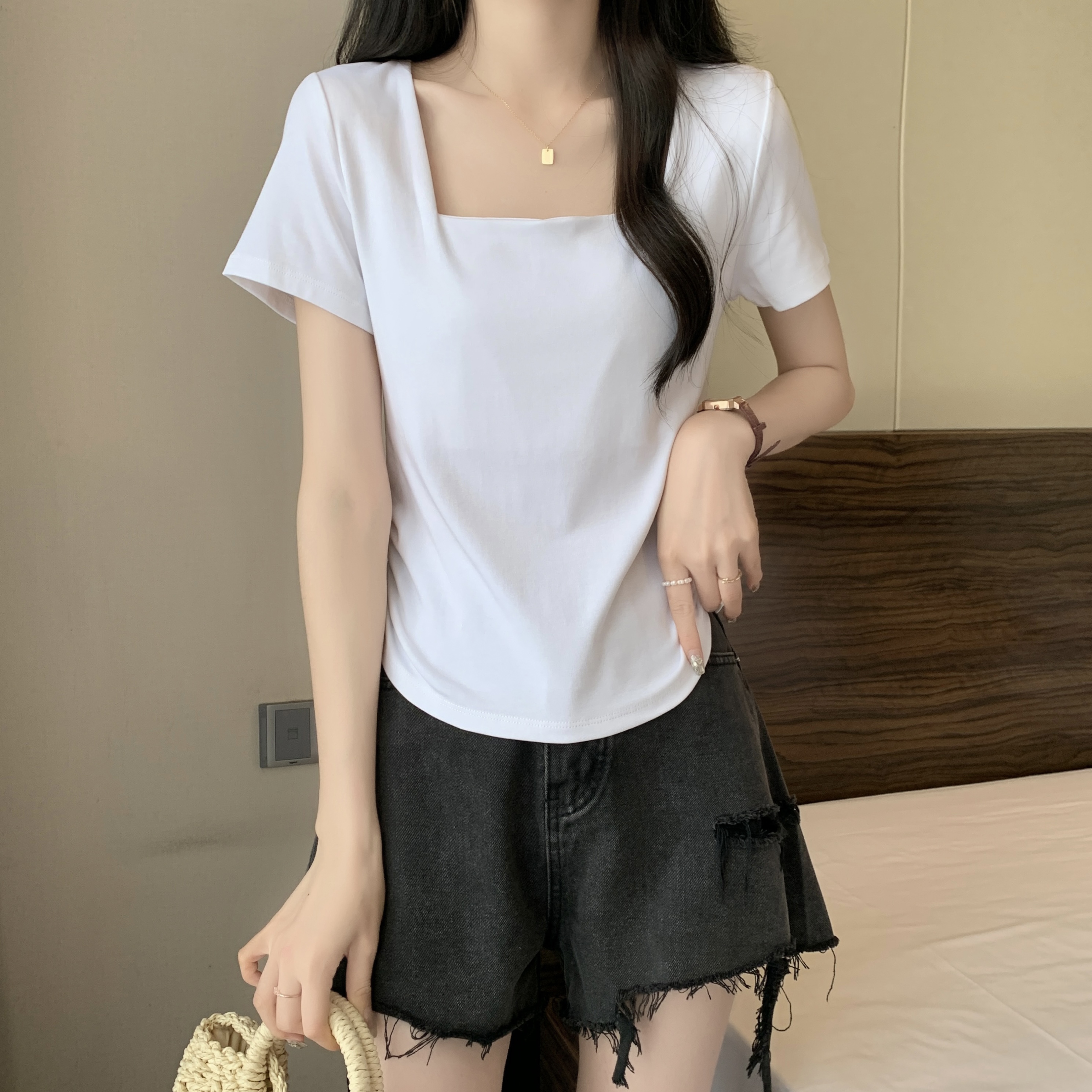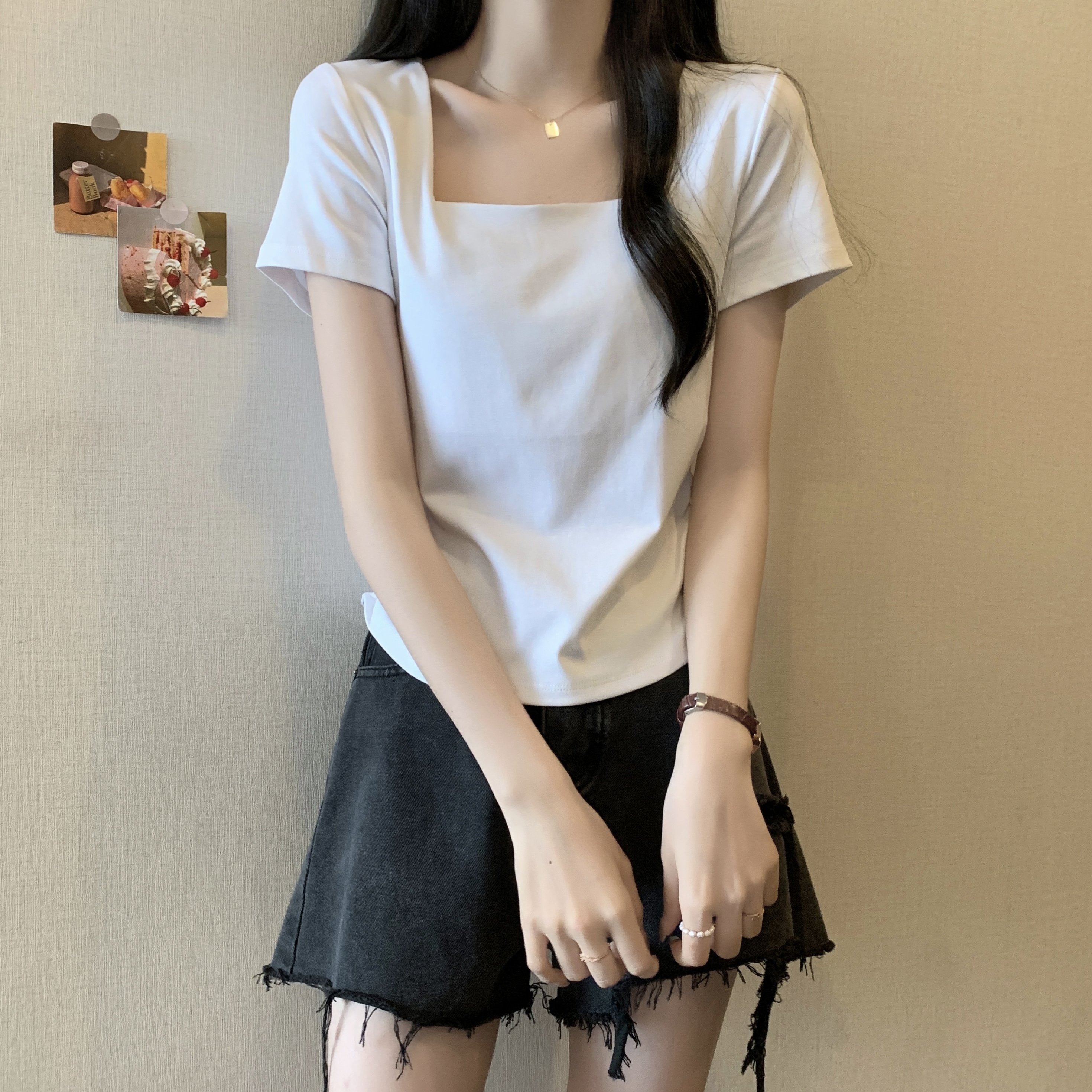 실사 빅 사이즈 지방 mm 새로운 디자인 센스 달콤한 스타일 광장 칼라 미니멀리즘 다용도 반팔 슬림해 보이는 표지 고기 맨위 여성