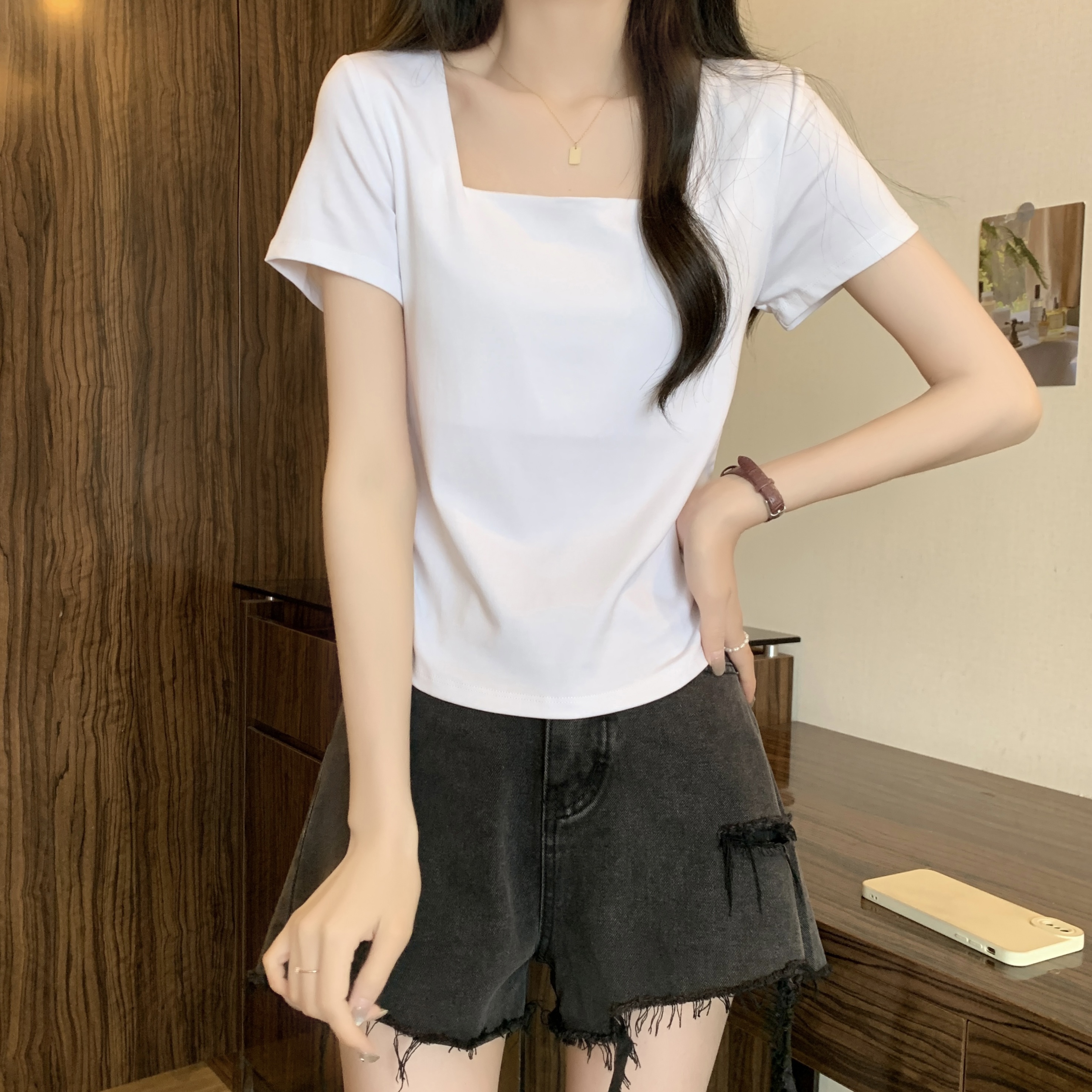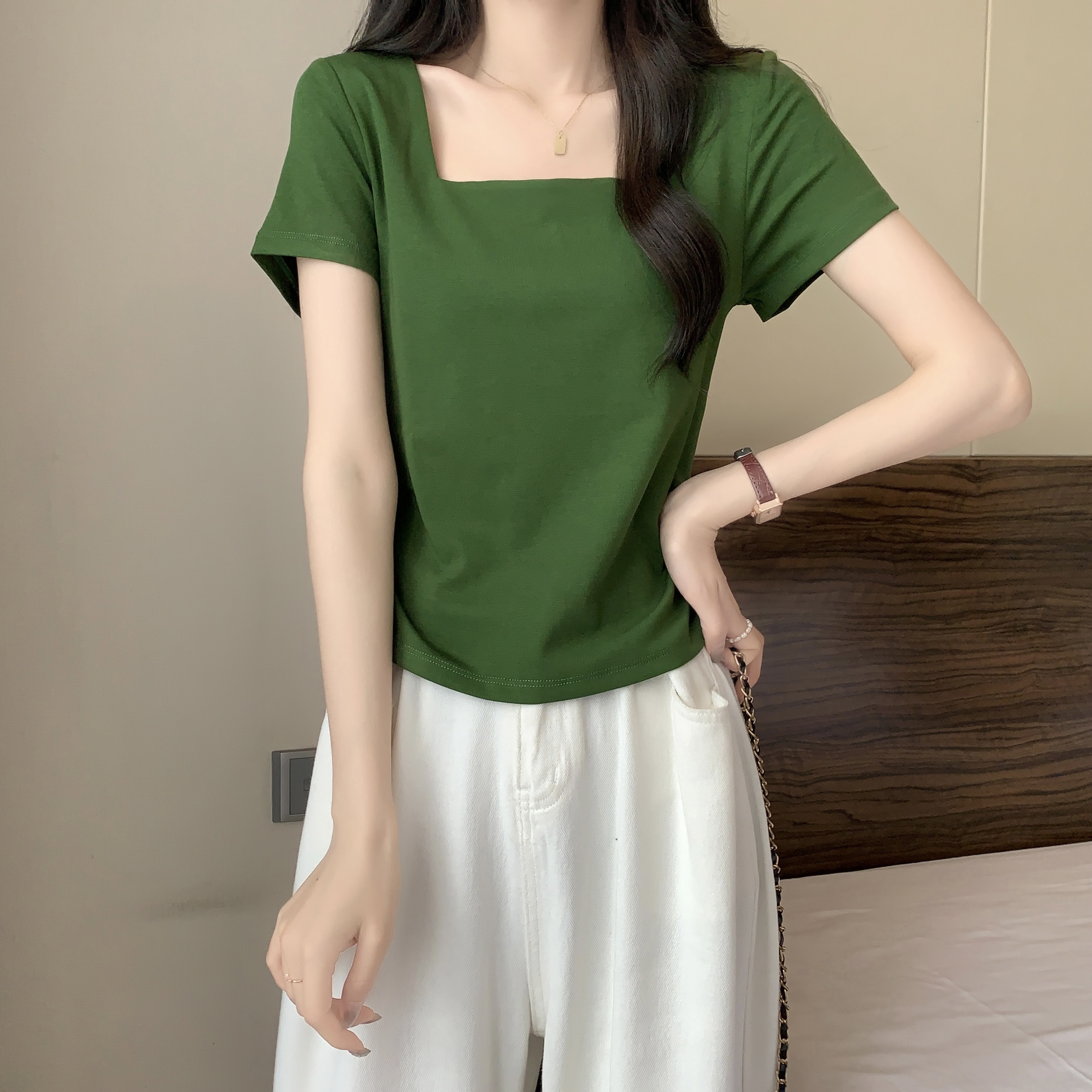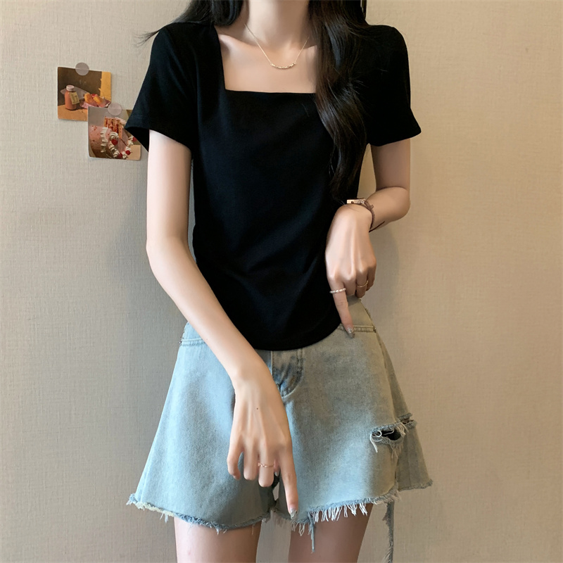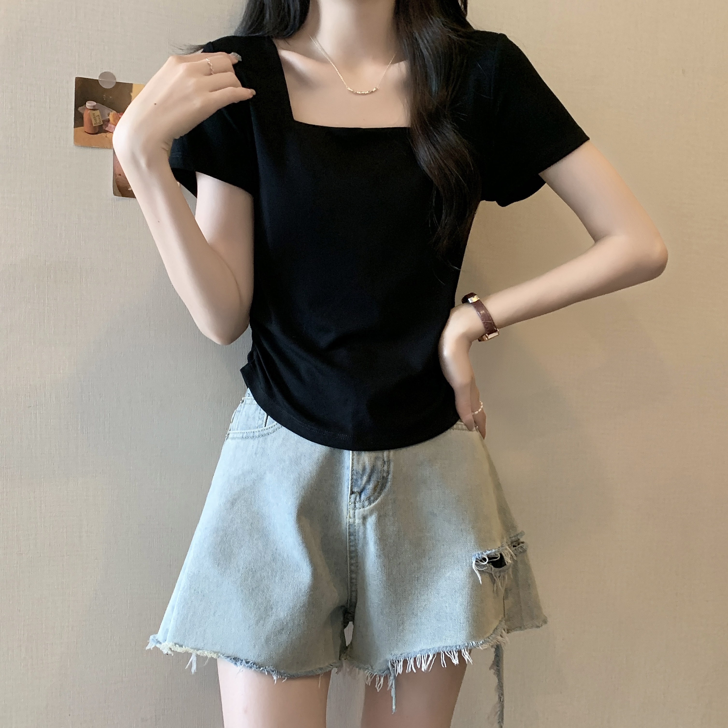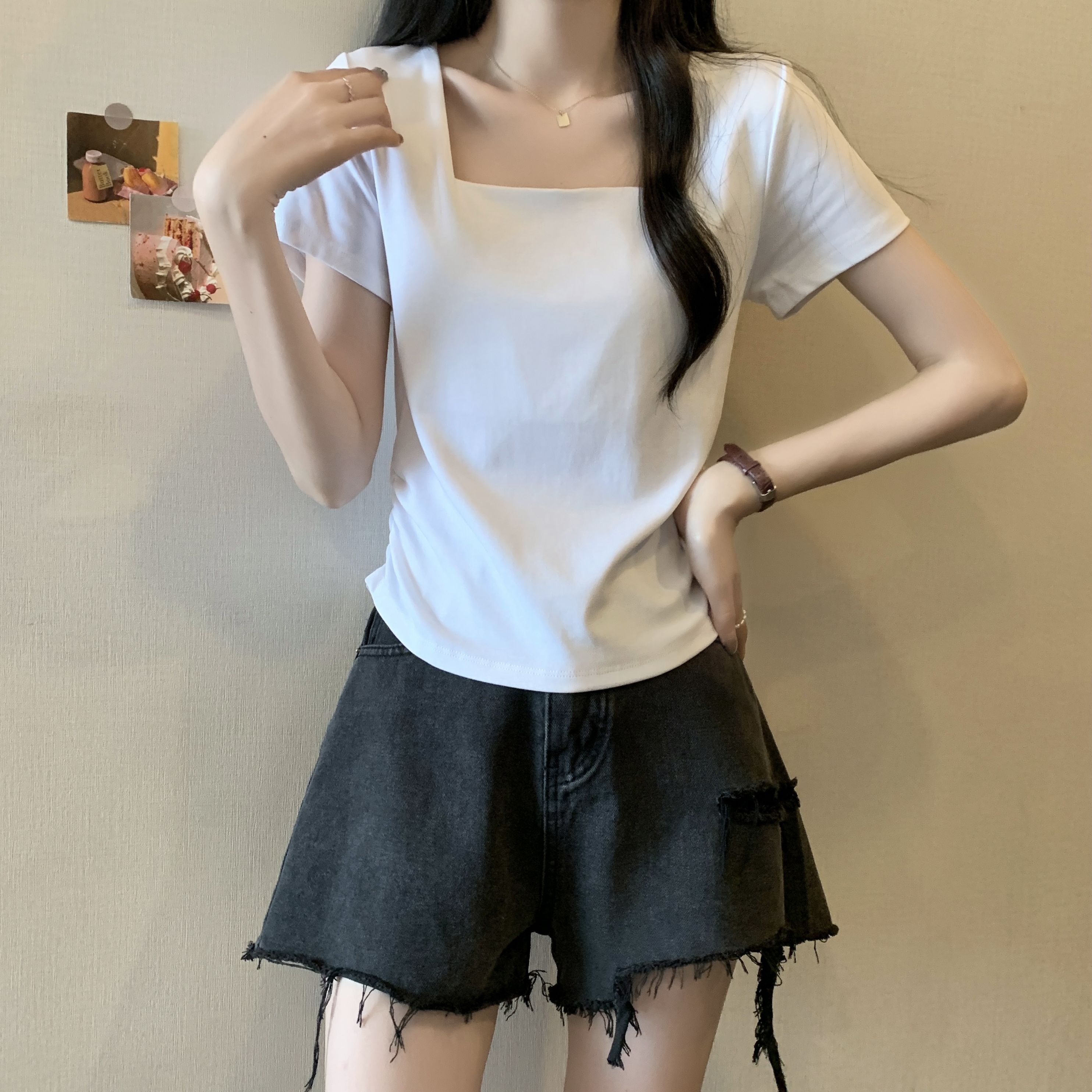실사 빅 사이즈 지방 mm 새로운 디자인 센스 달콤한 스타일 광장 칼라 미니멀리즘 다용도 반팔 슬림해 보이는 표지 고기 맨위 여성
