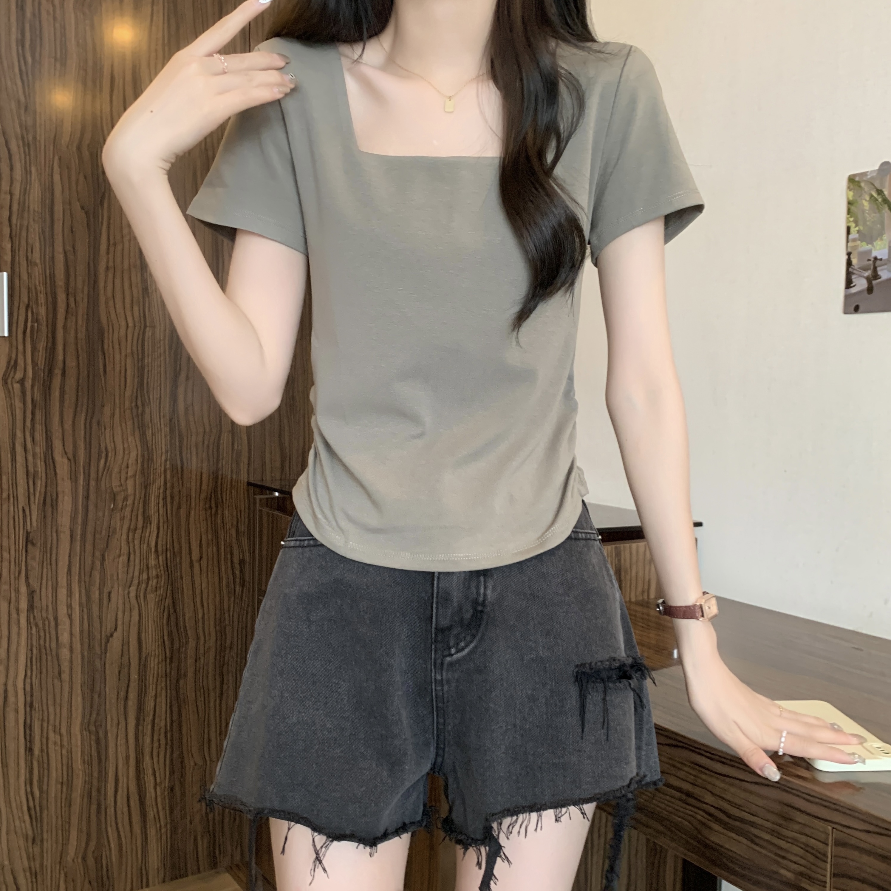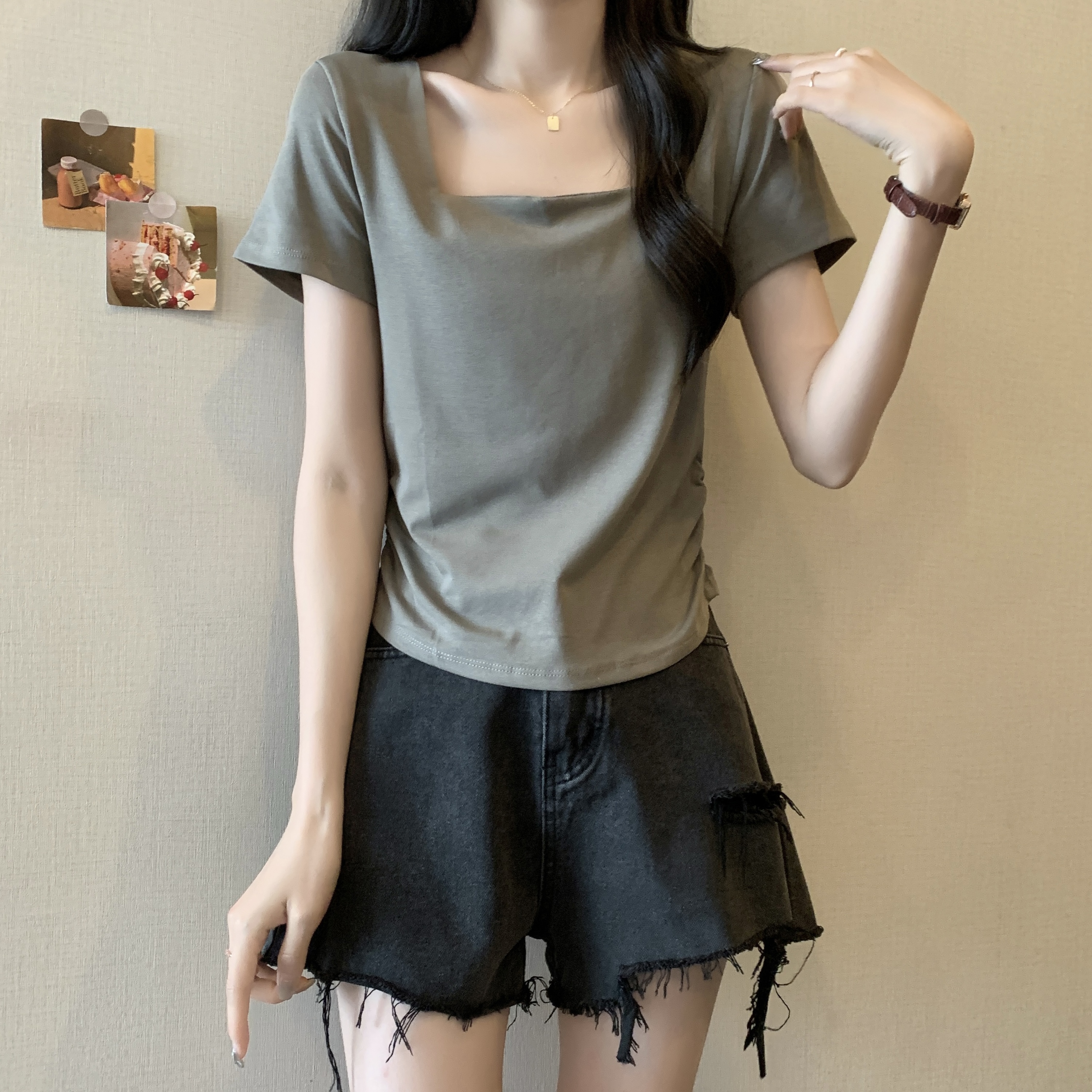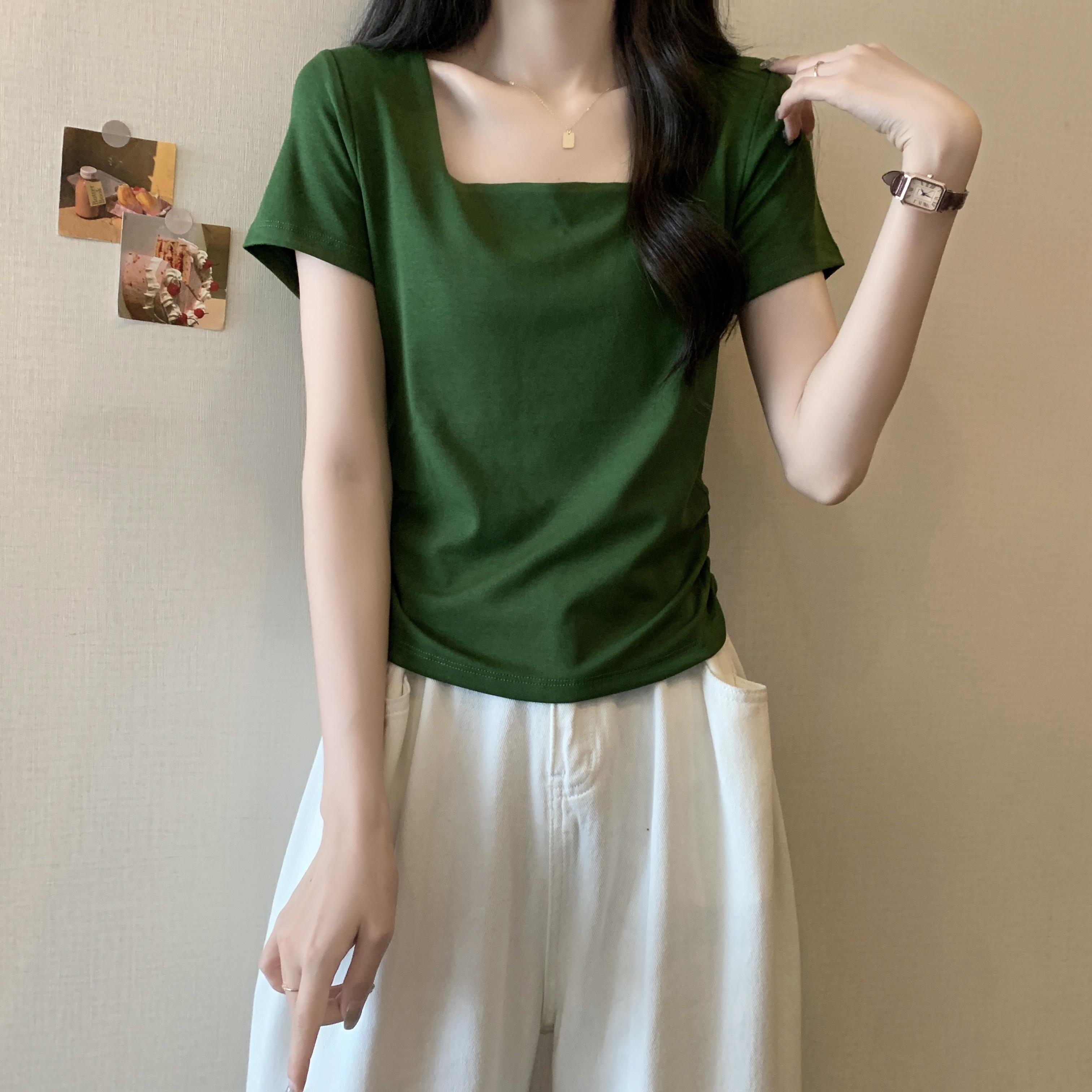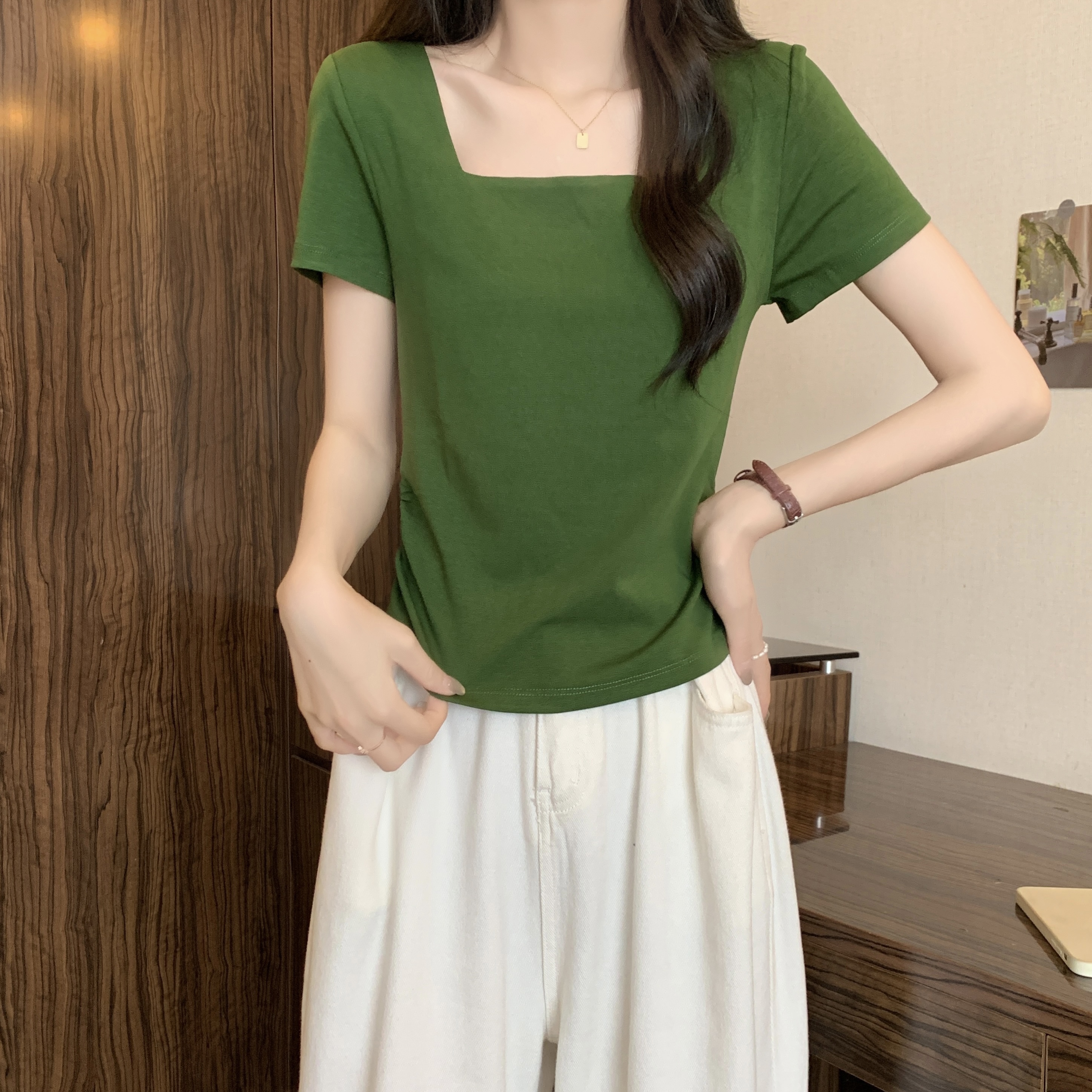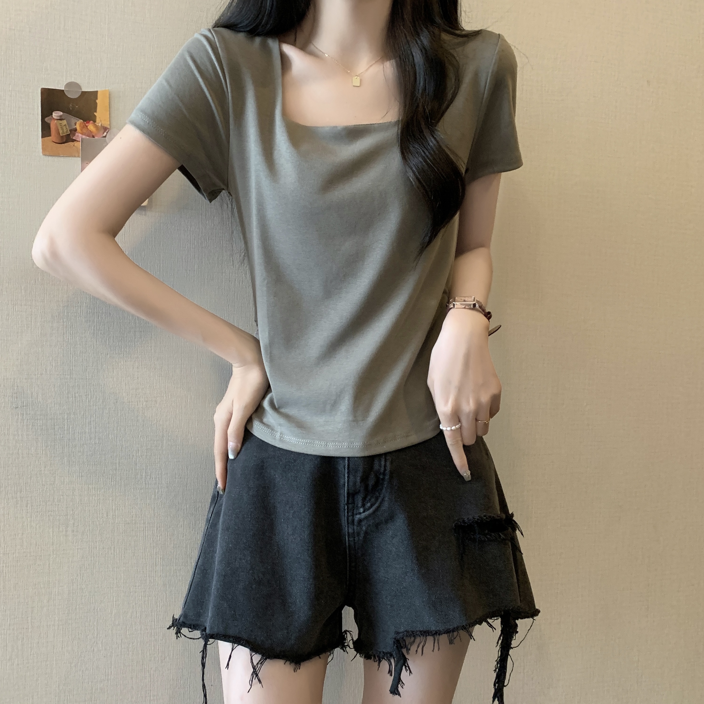 실사 빅 사이즈 지방 mm 새로운 디자인 센스 달콤한 스타일 광장 칼라 미니멀리즘 다용도 반팔 슬림해 보이는 표지 고기 맨위 여성