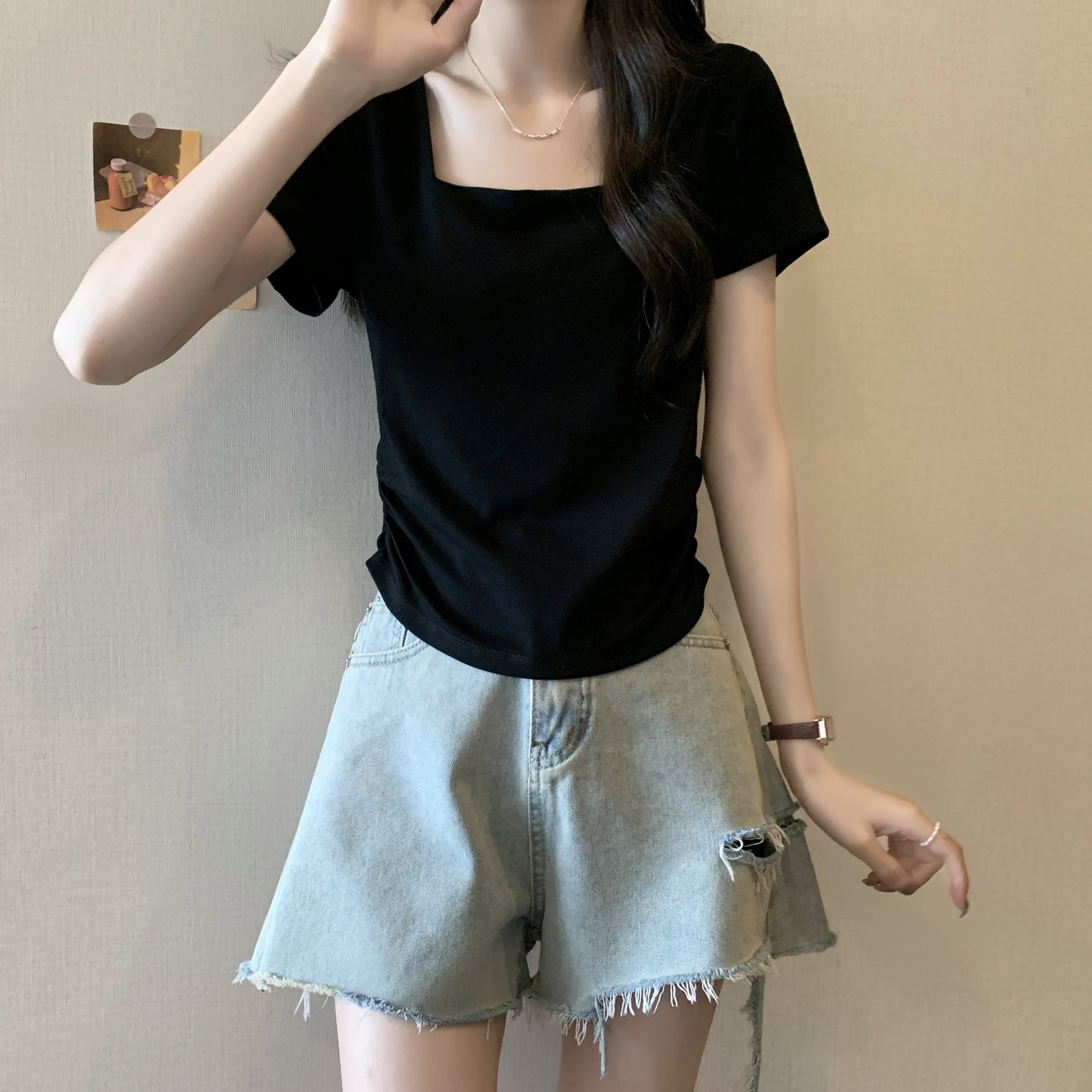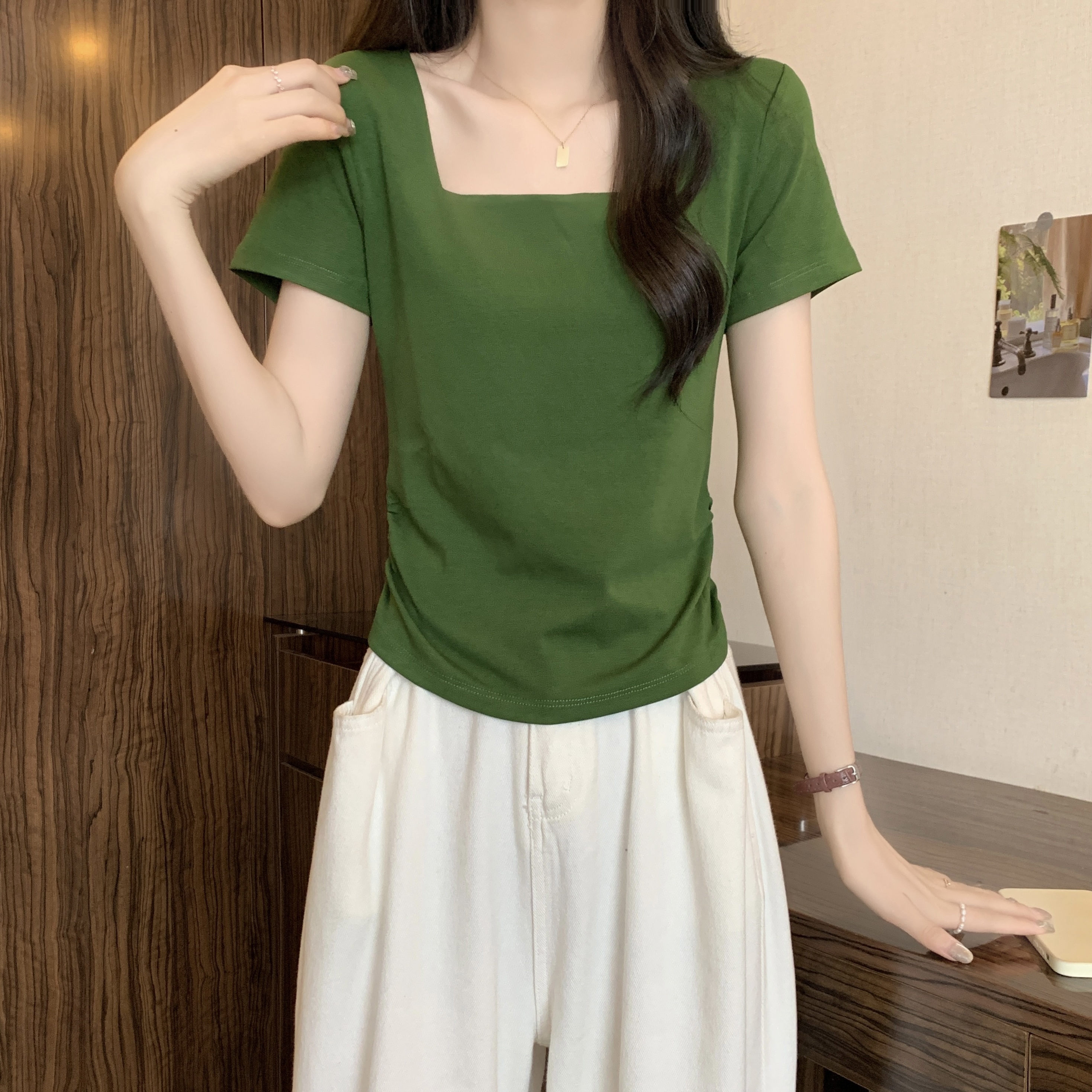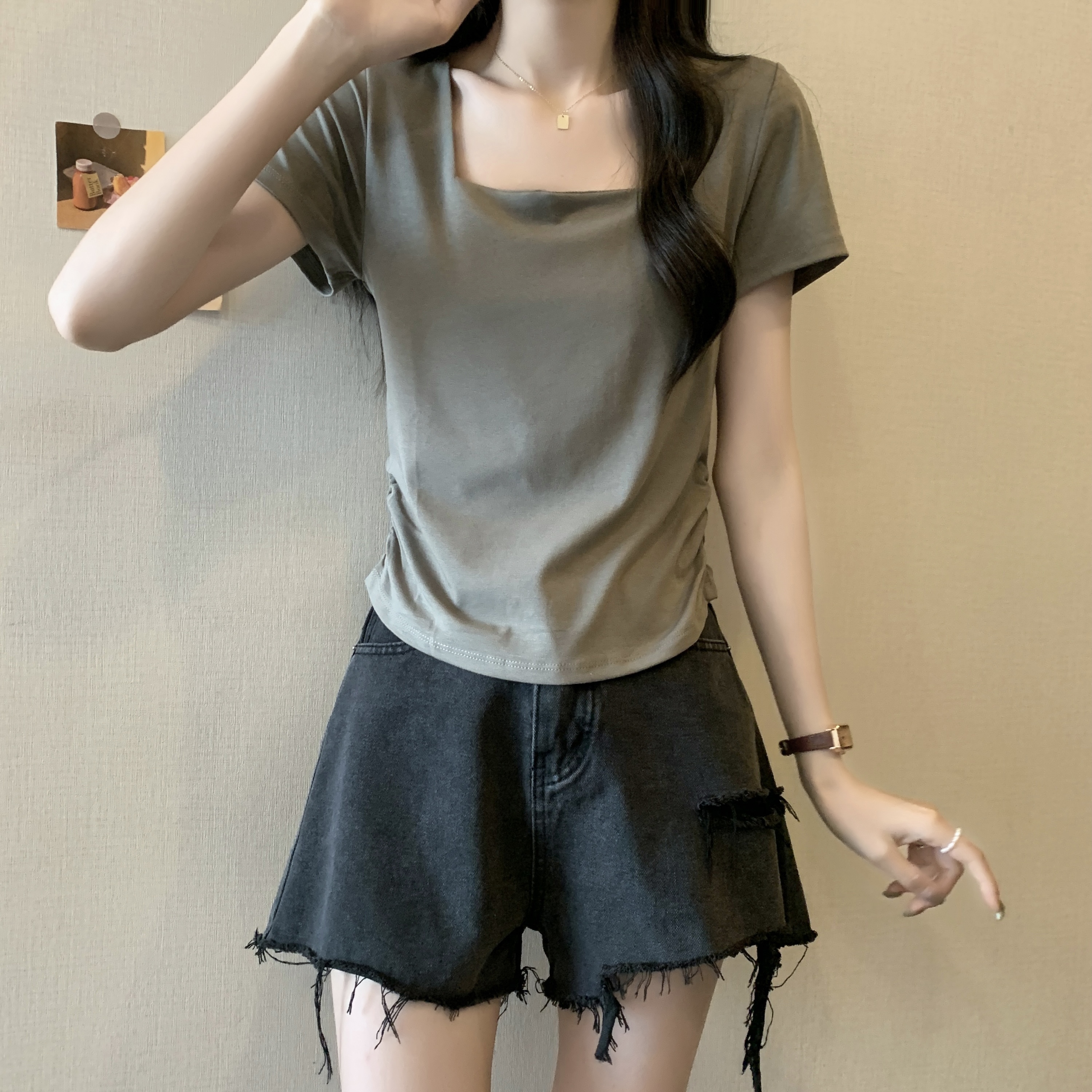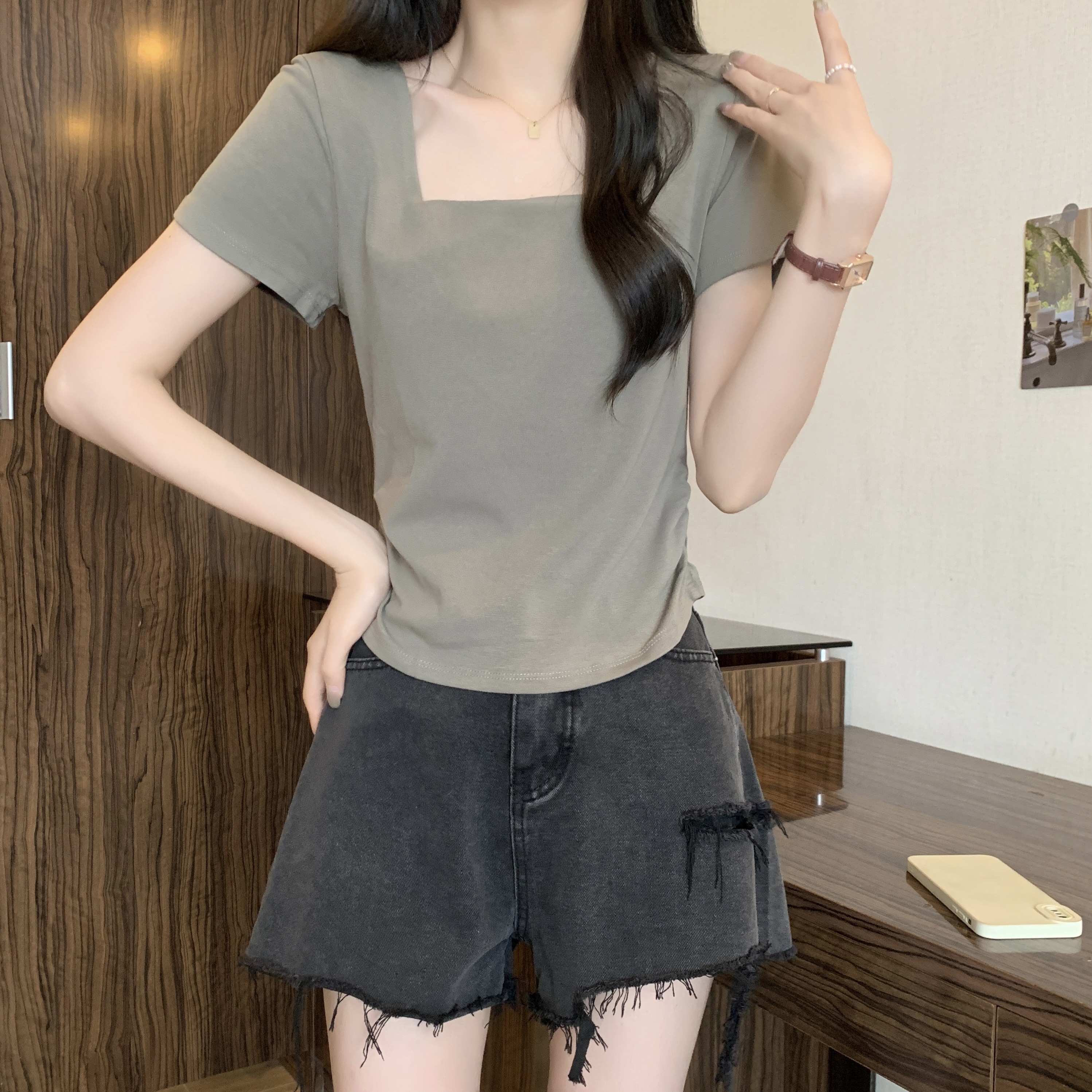 실사 빅 사이즈 지방 mm 새로운 디자인 센스 달콤한 스타일 광장 칼라 미니멀리즘 다용도 반팔 슬림해 보이는 표지 고기 맨위 여성