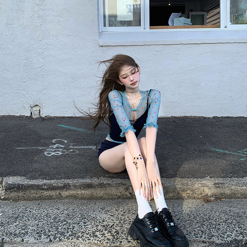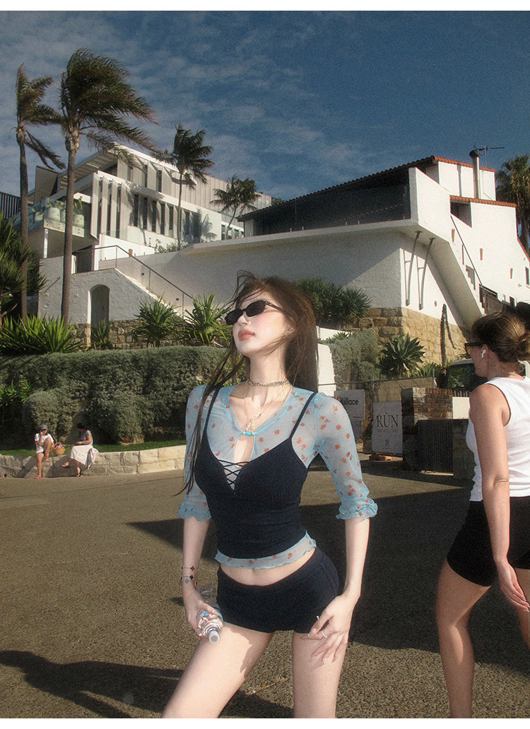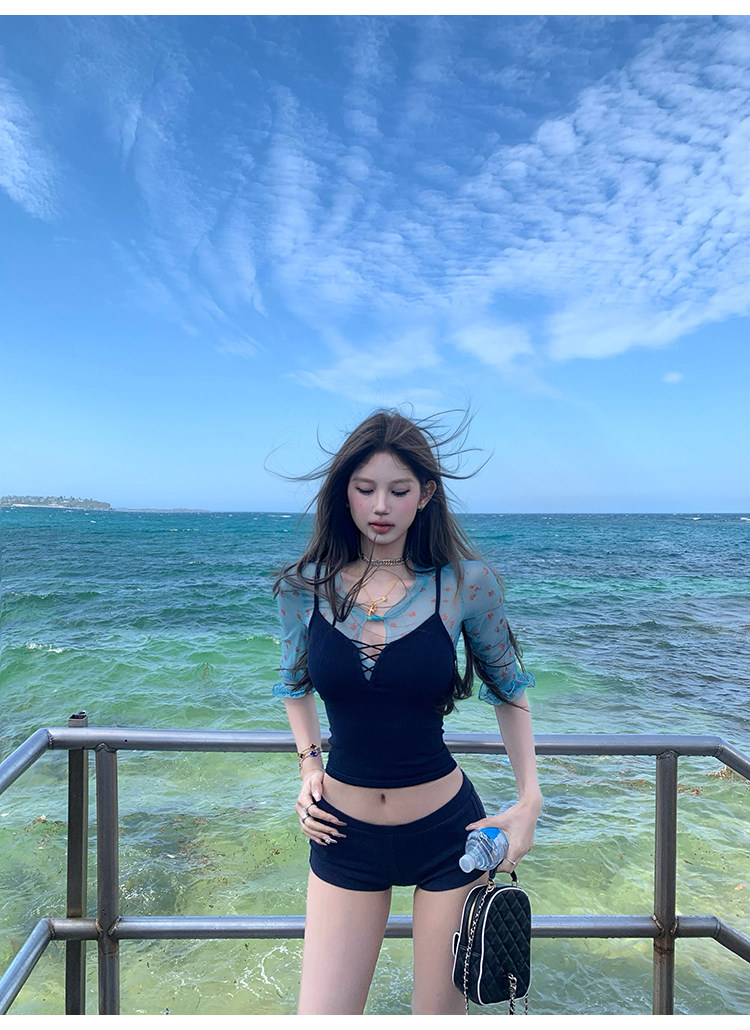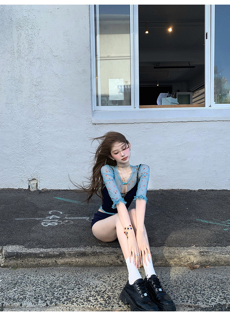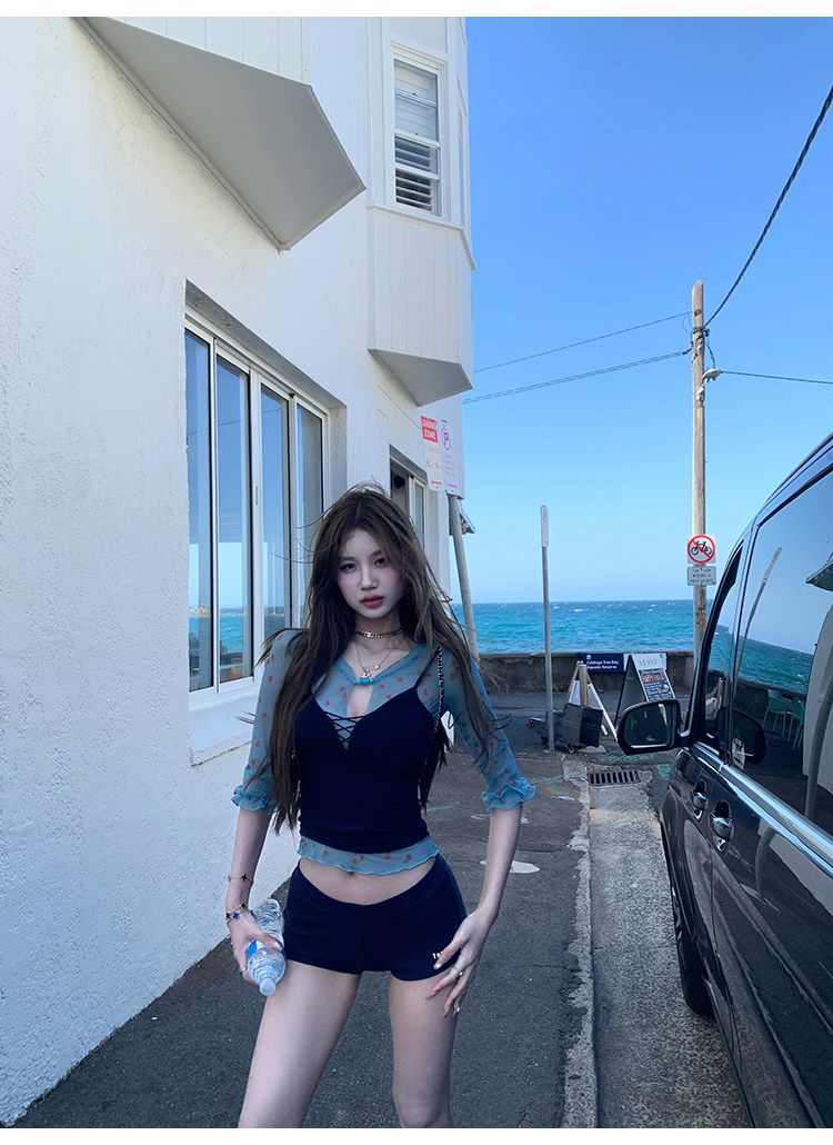 꽃무늬 망사 반팔 티셔츠 여성 몸매 가꾸기 슬림해 보이는 캐미솔 세트 여름