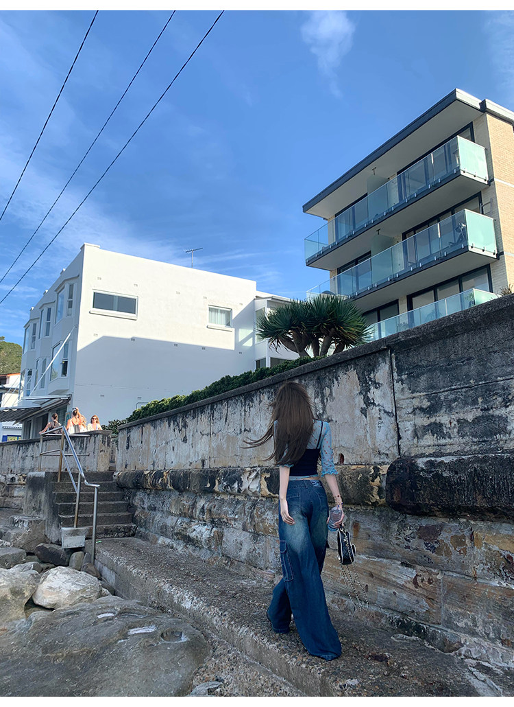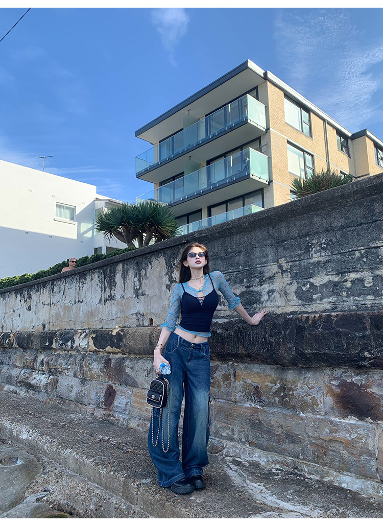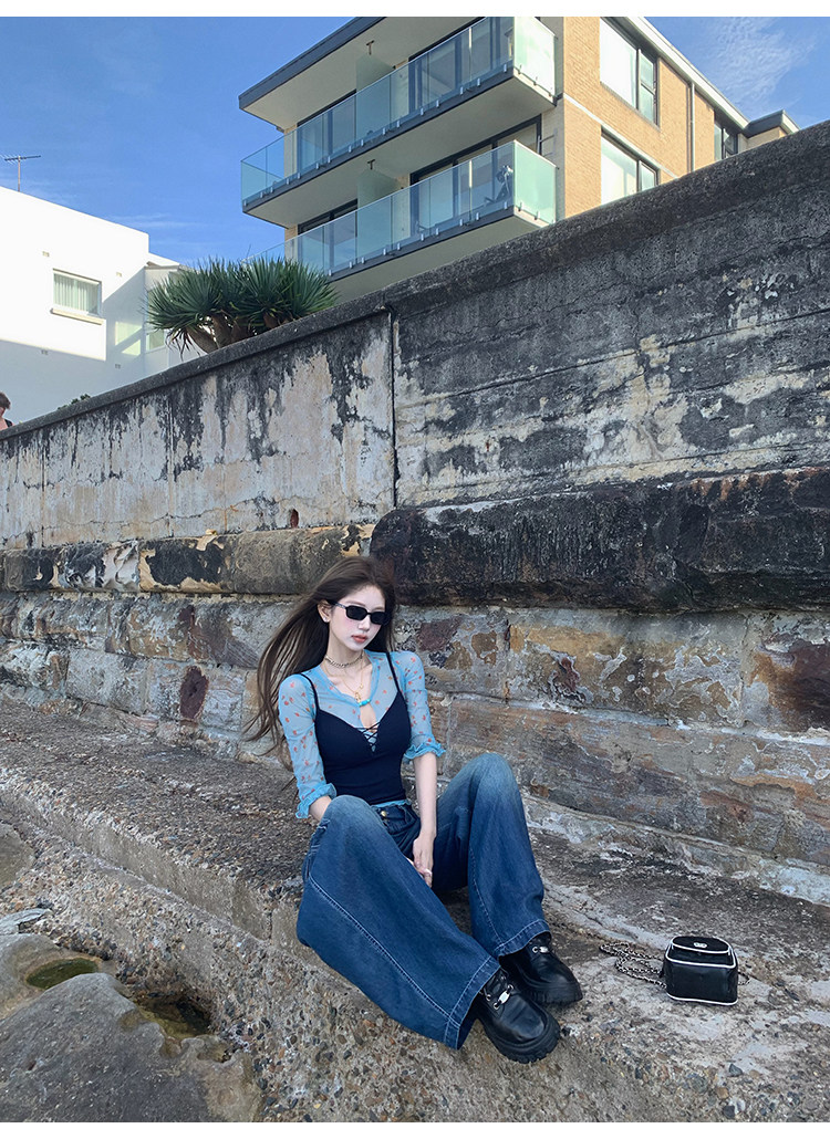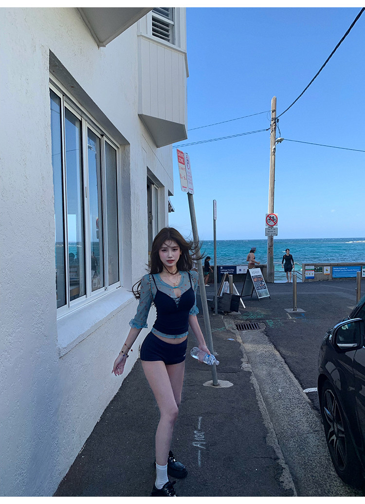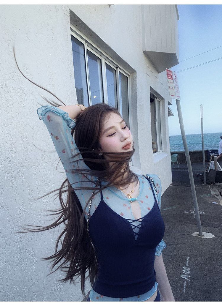 꽃무늬 망사 반팔 티셔츠 여성 몸매 가꾸기 슬림해 보이는 캐미솔 세트 여름