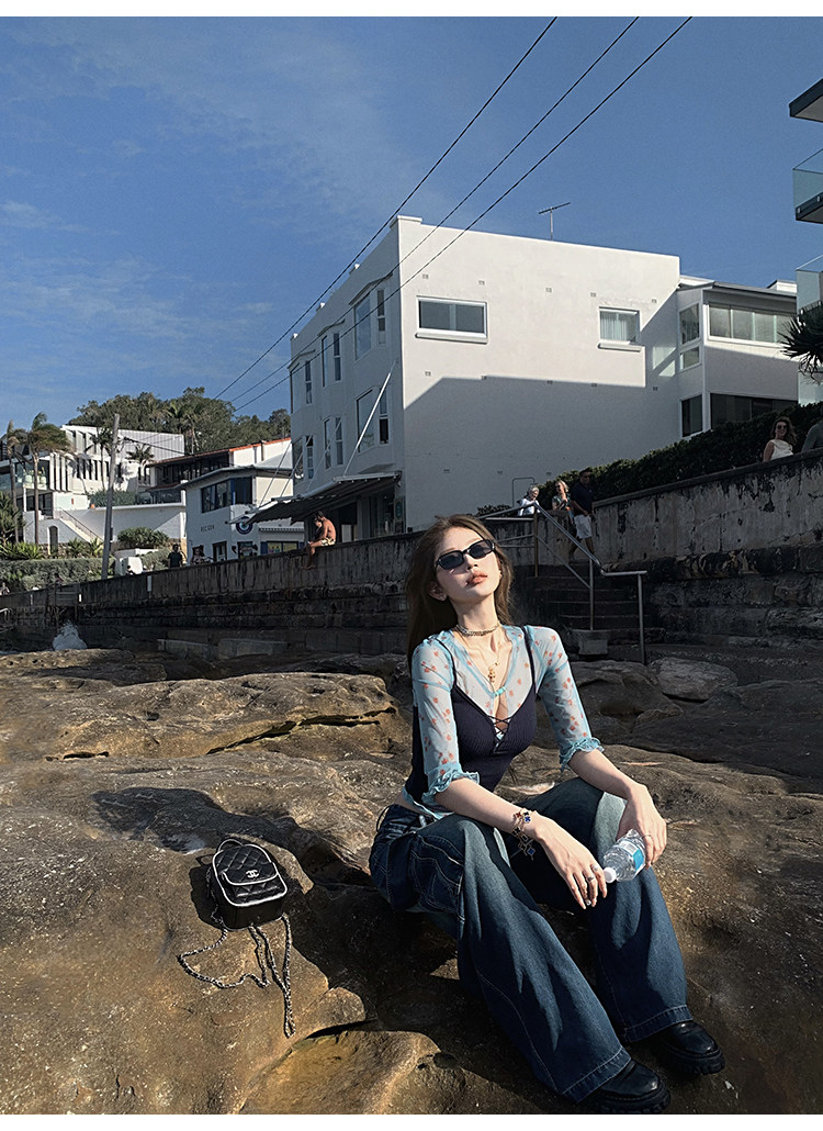 한 부서 레트로 도트 무늬 파란색 니트 오픈 가디건 여성 봄 느긋한 바람 다용도 슬림해 보이는 맨위