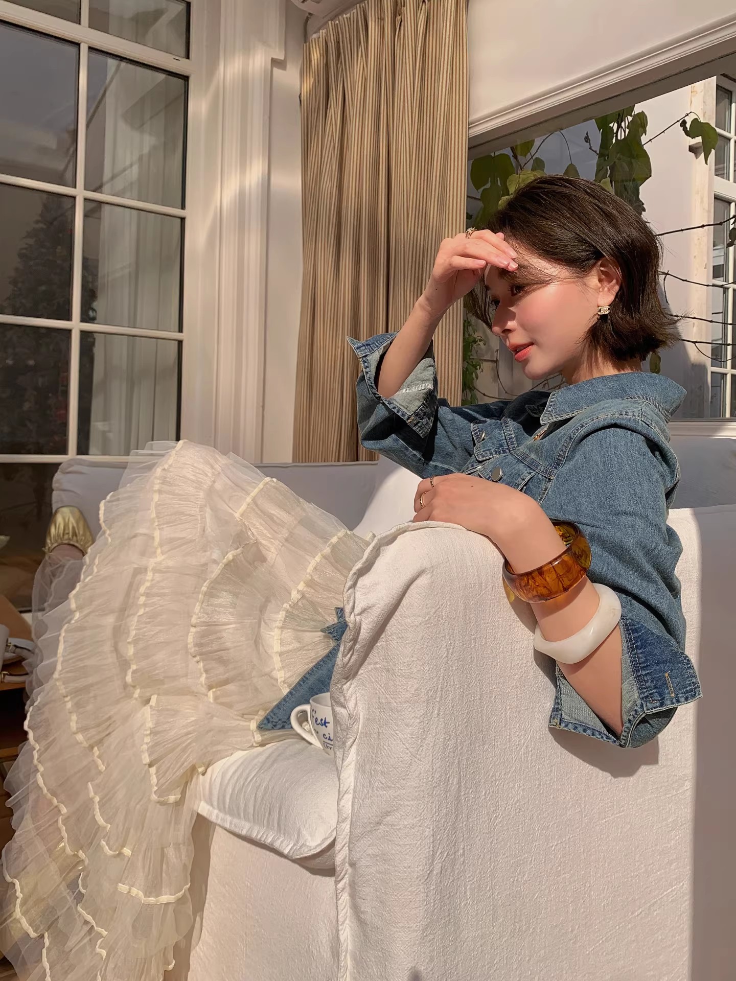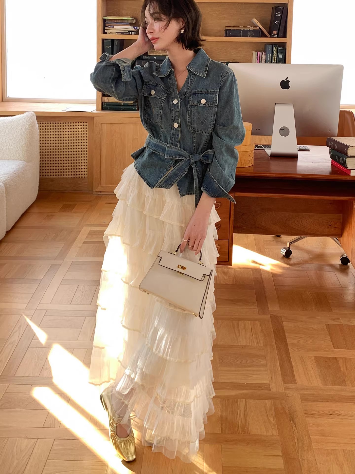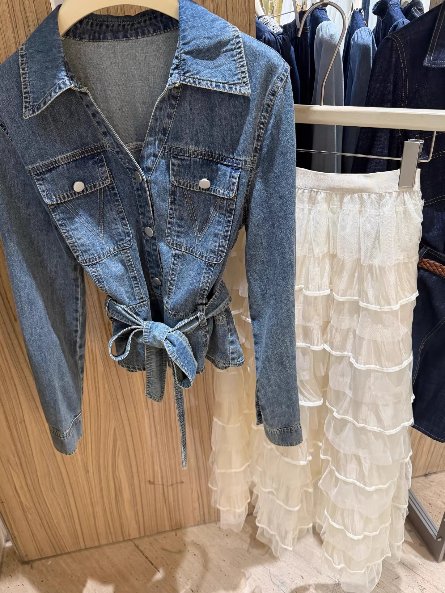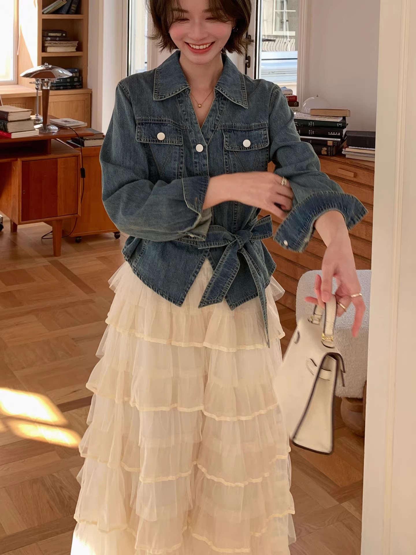 항구 바람 프랑스식 분위기 센스 세트 허리 수축 데님 셔츠 재킷 롱 스커트 망사 케이크 드레스 전체 집합 이른 봄