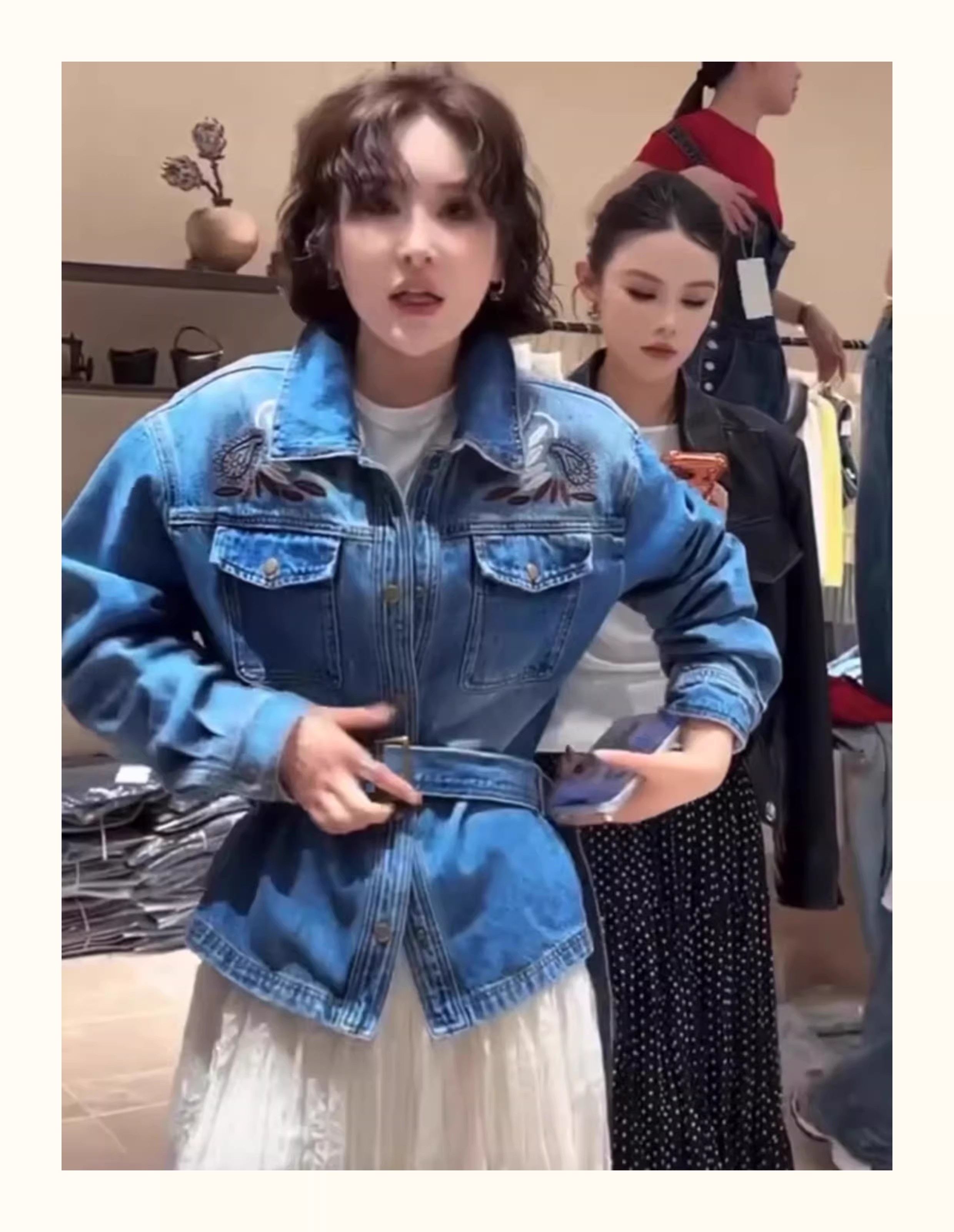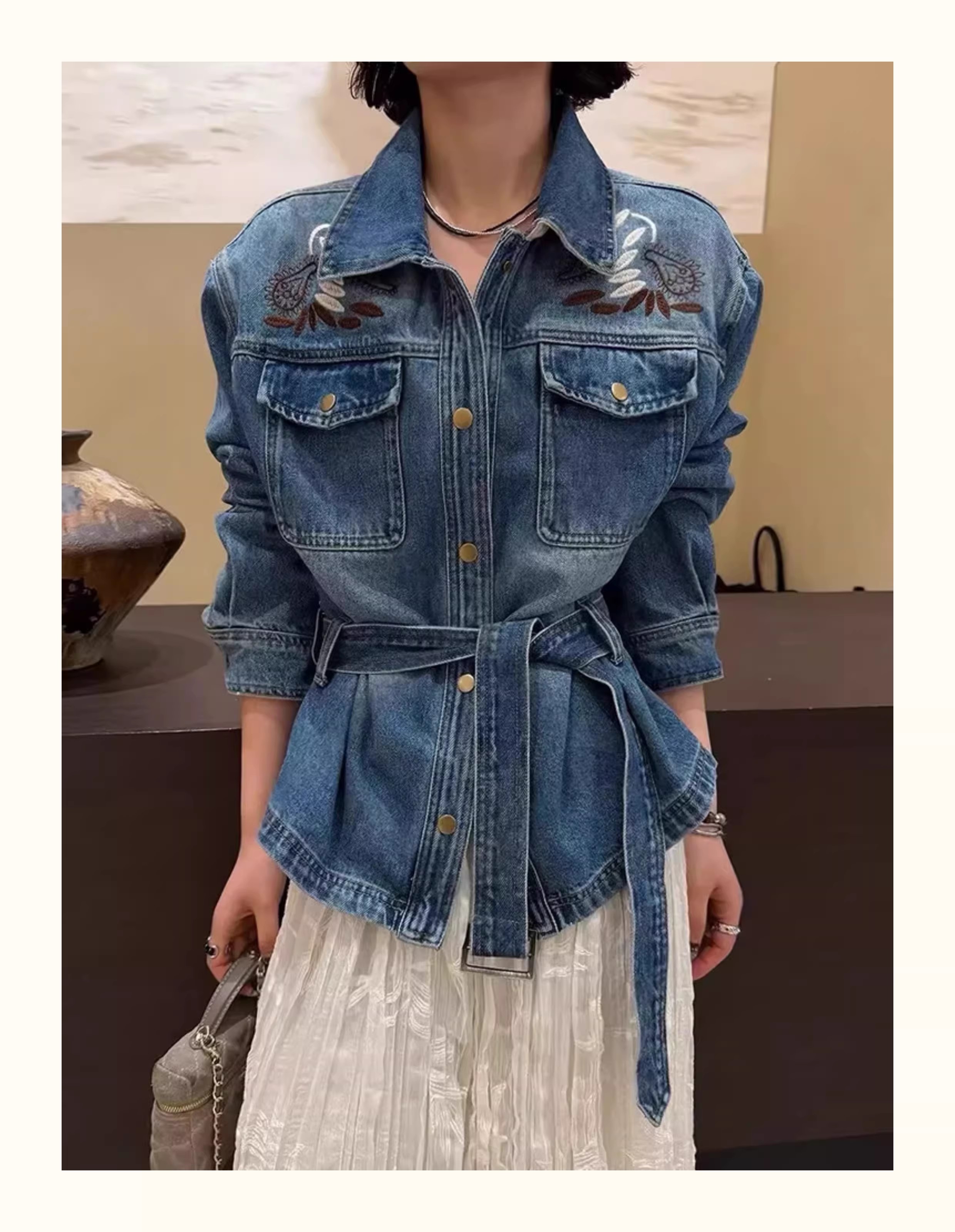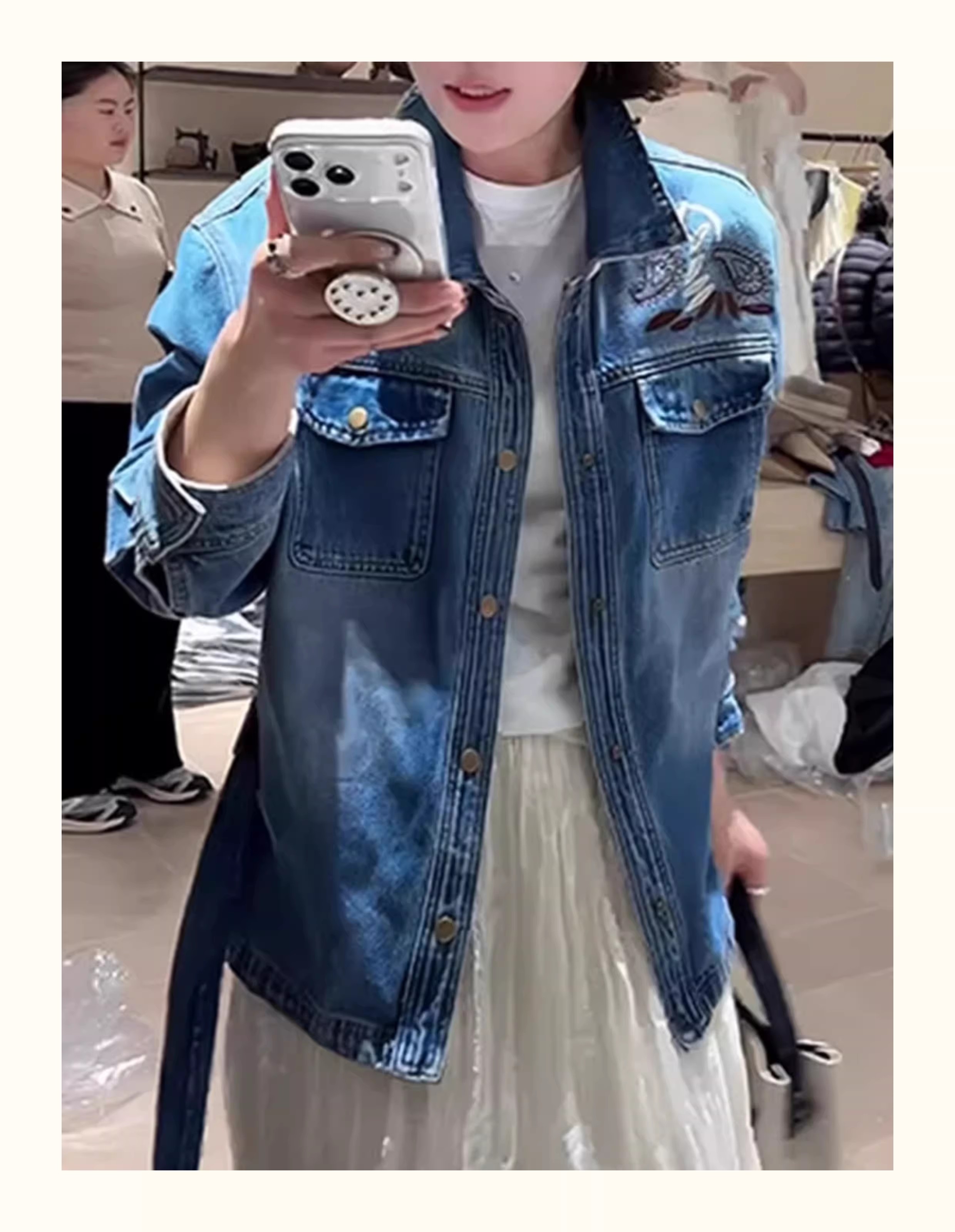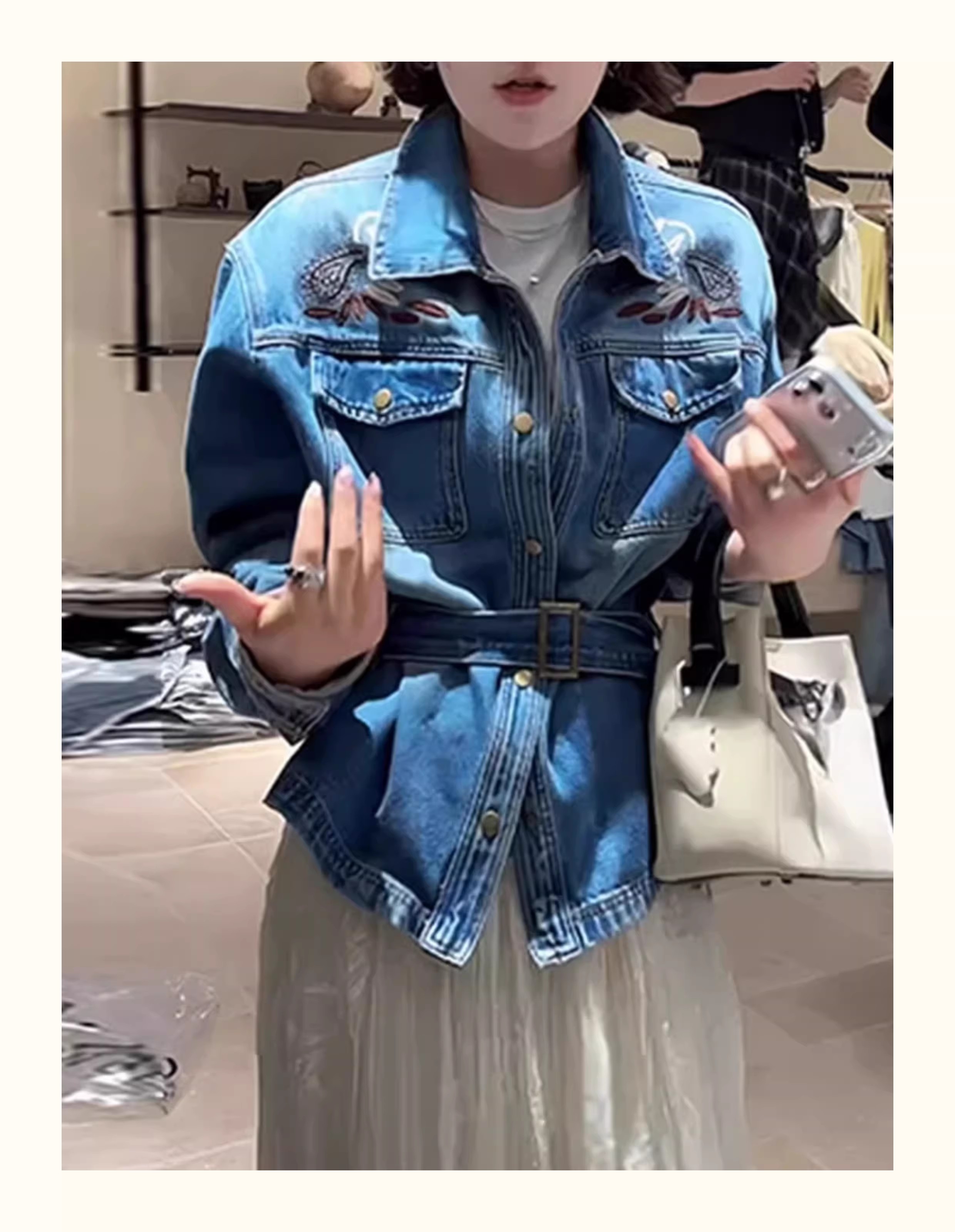 무거운 작업 자수 레이스업 데님 여성 코트 유럽 상품 2026 봄 새로운 폴로 칼라 허리 수축 슬림해 보이는 다용도 재킷 맨위
