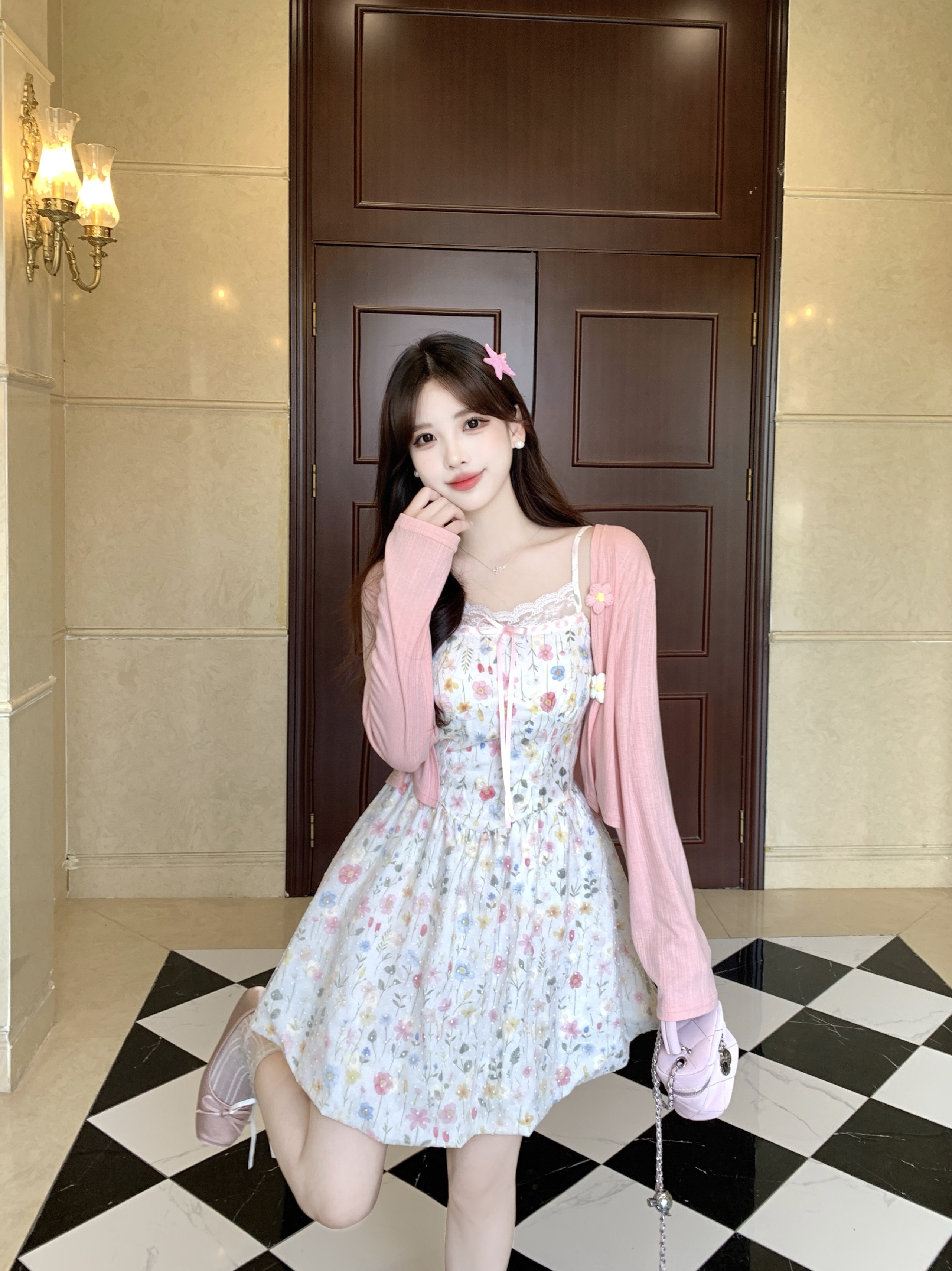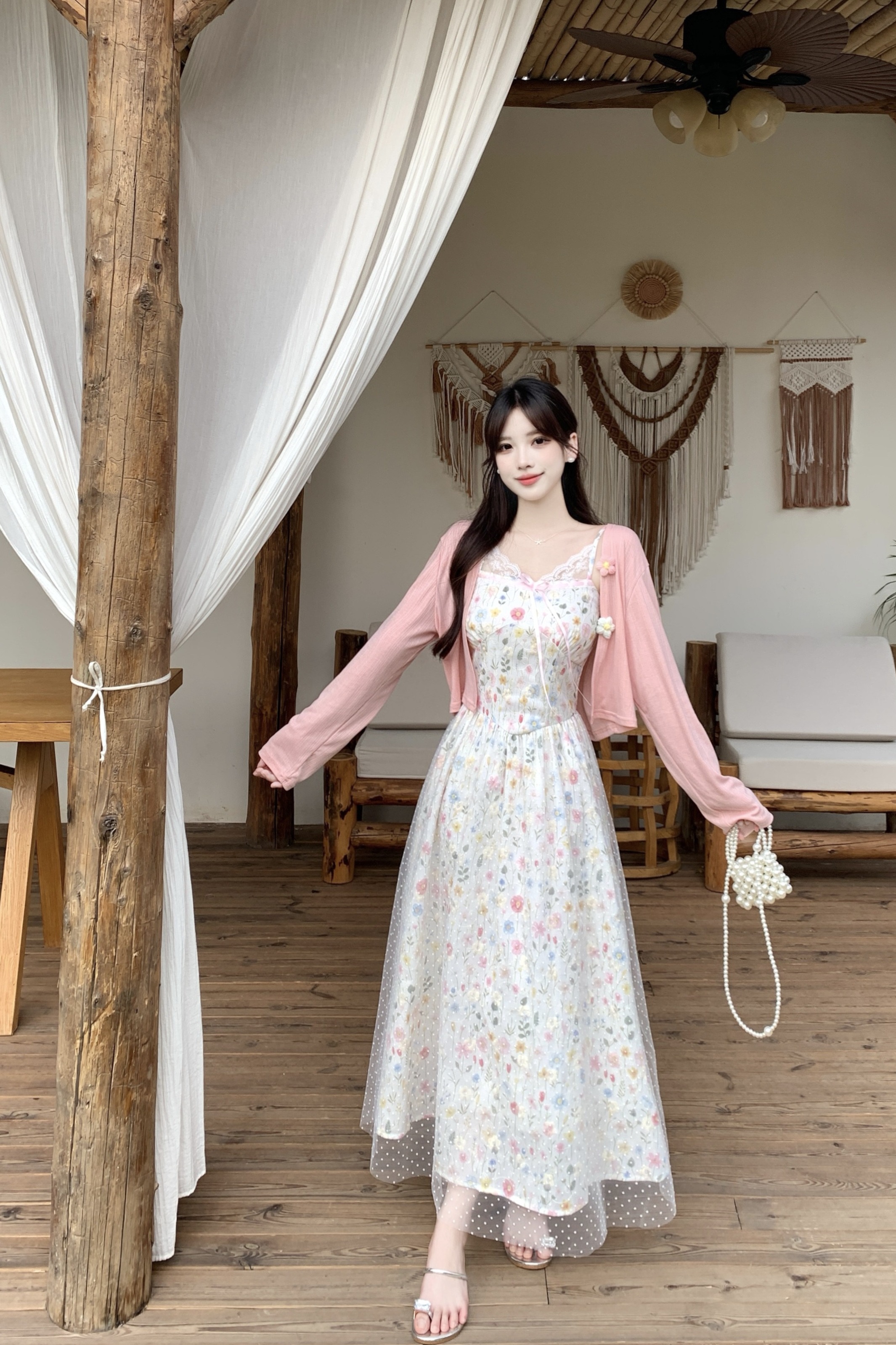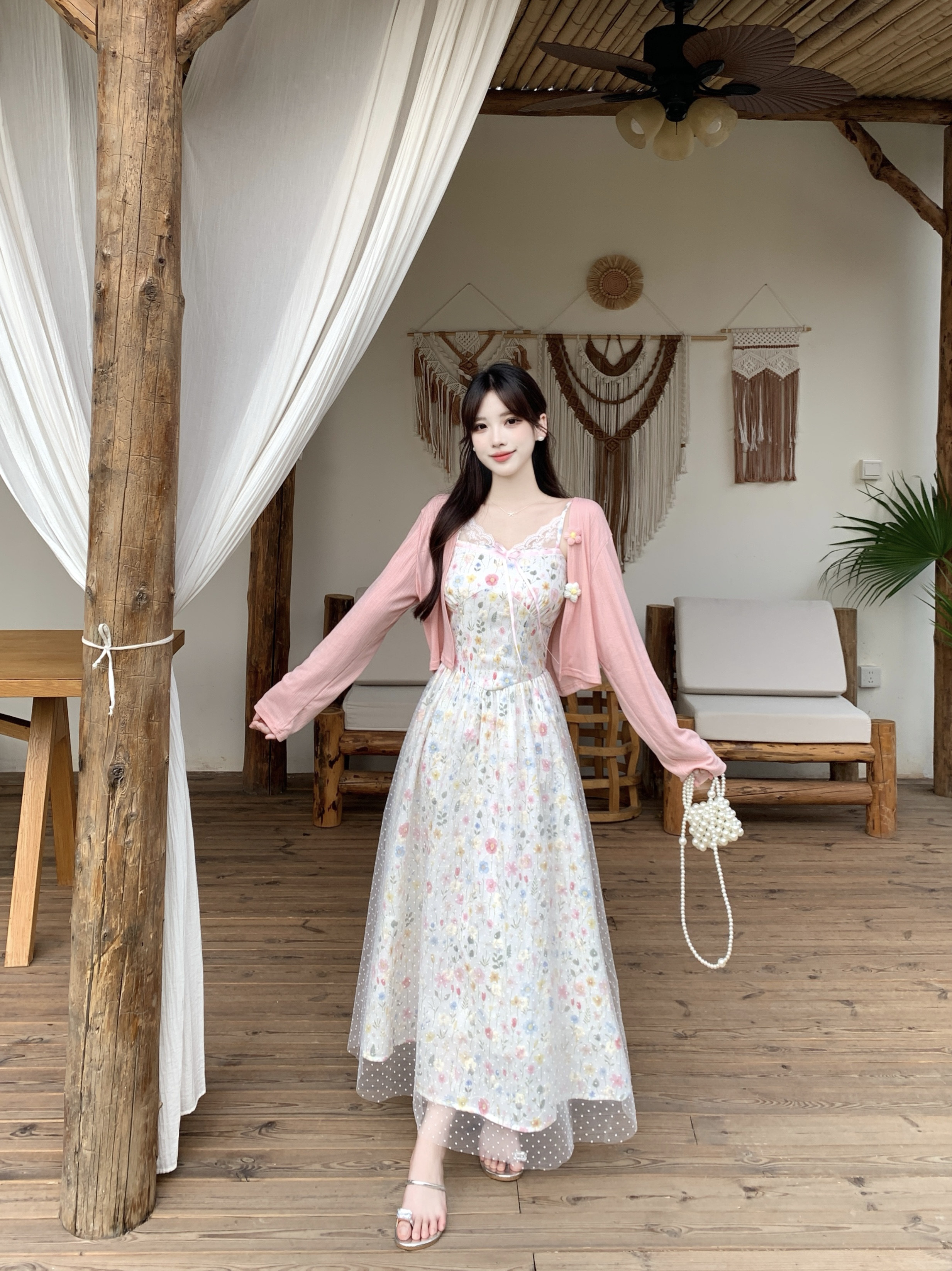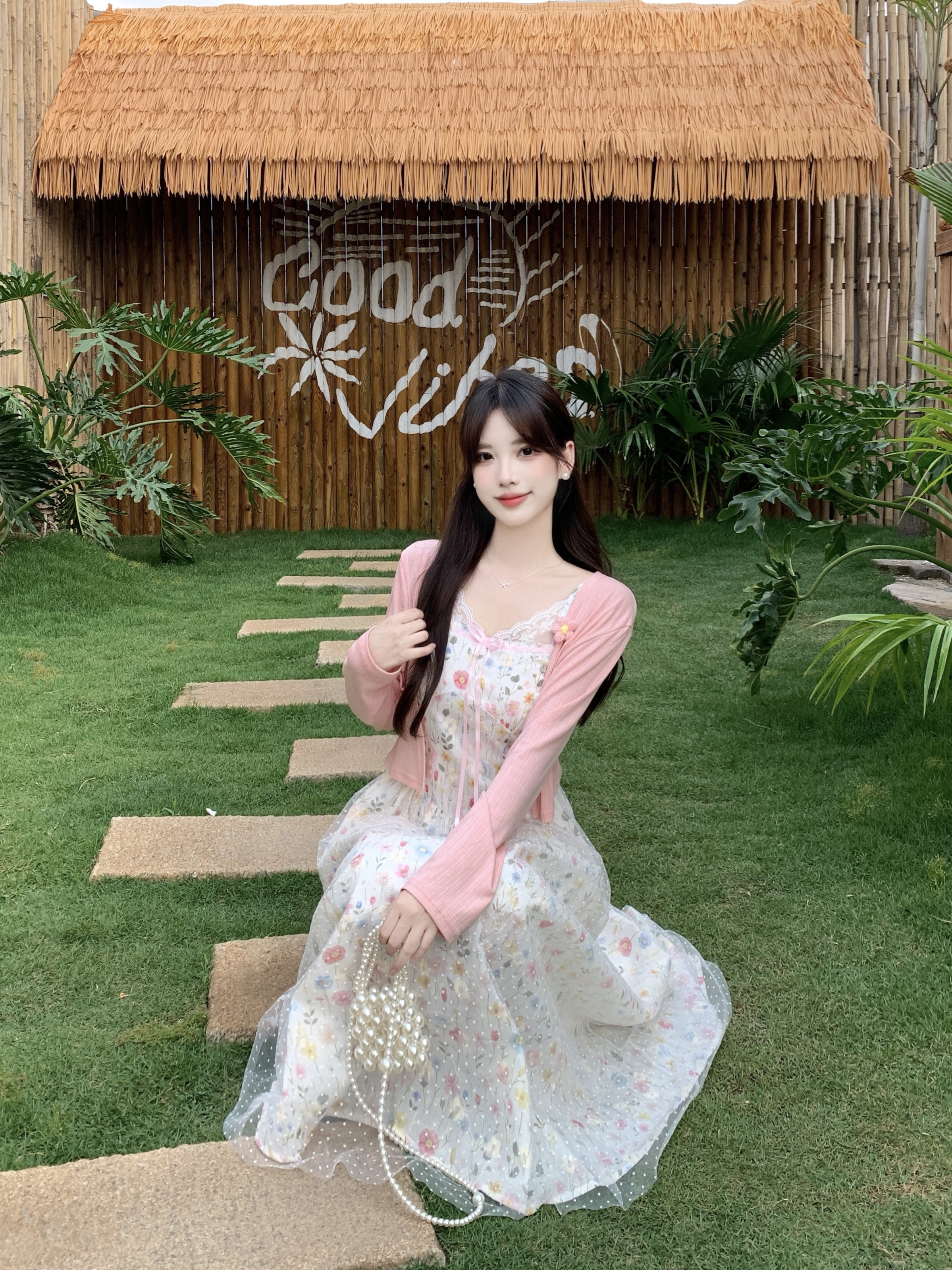 빅 사이즈 여성 의류 지방 mm 살구 색상 전원 바람 달콤함 작은 꽃무늬 프랑스식 레이스 슬립 드레스 오픈 가디건 투피스 세트