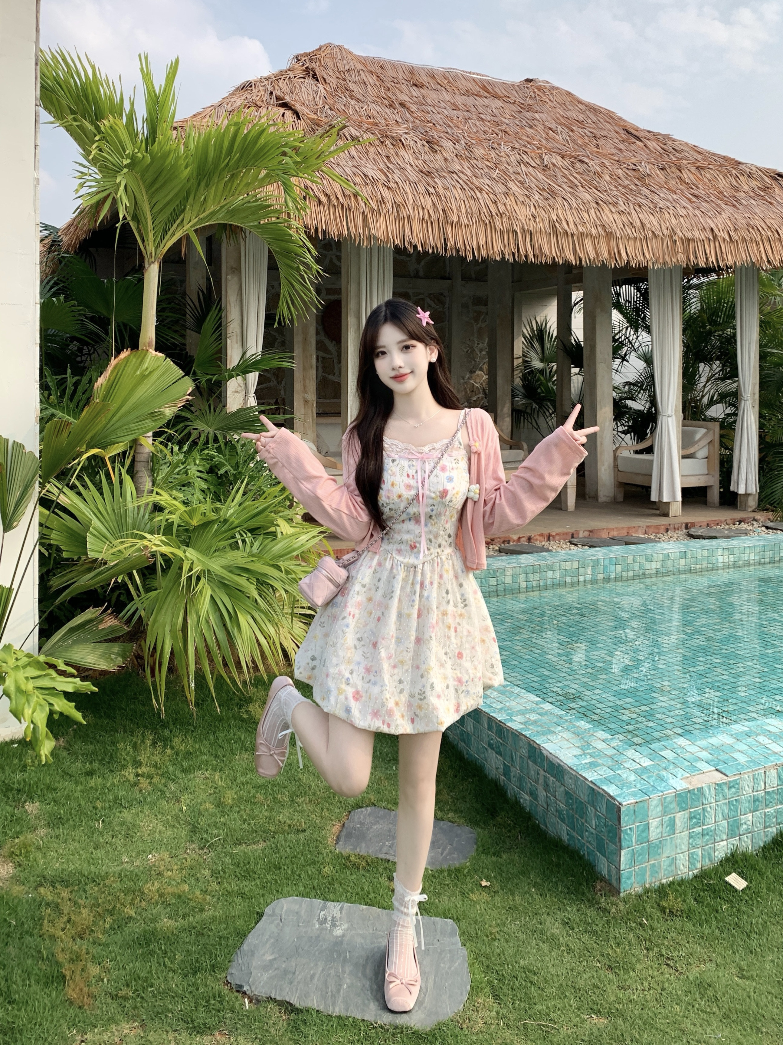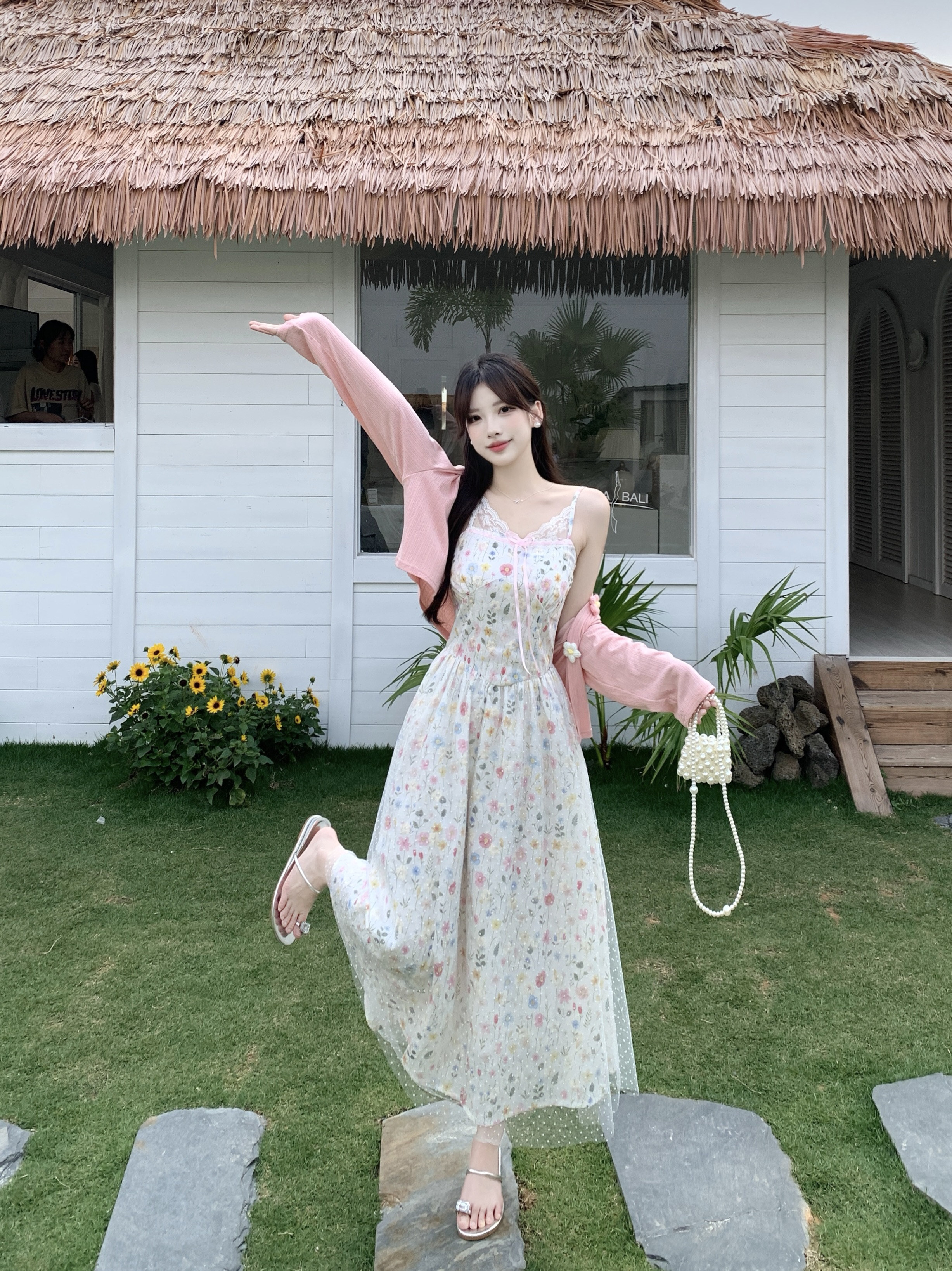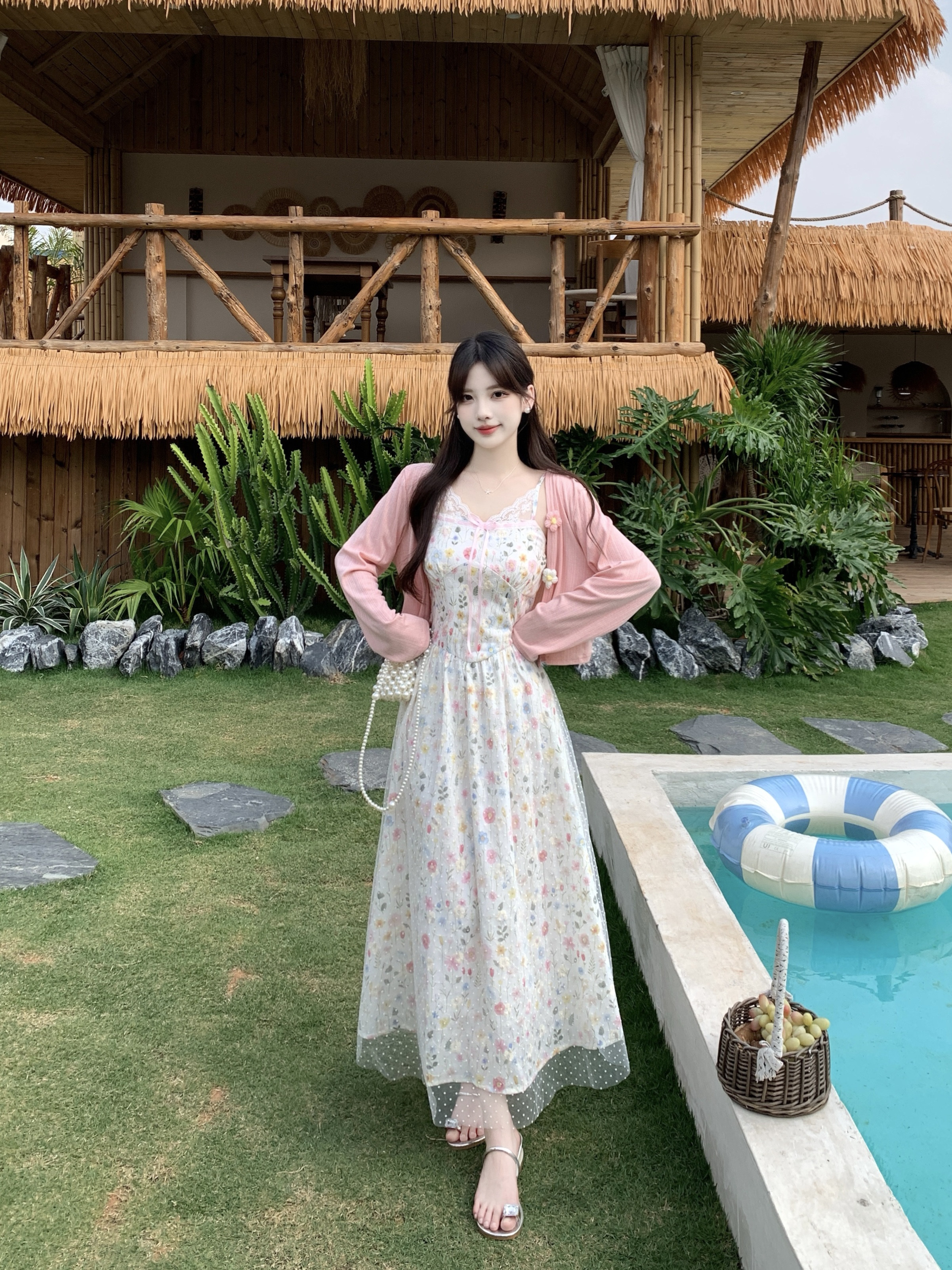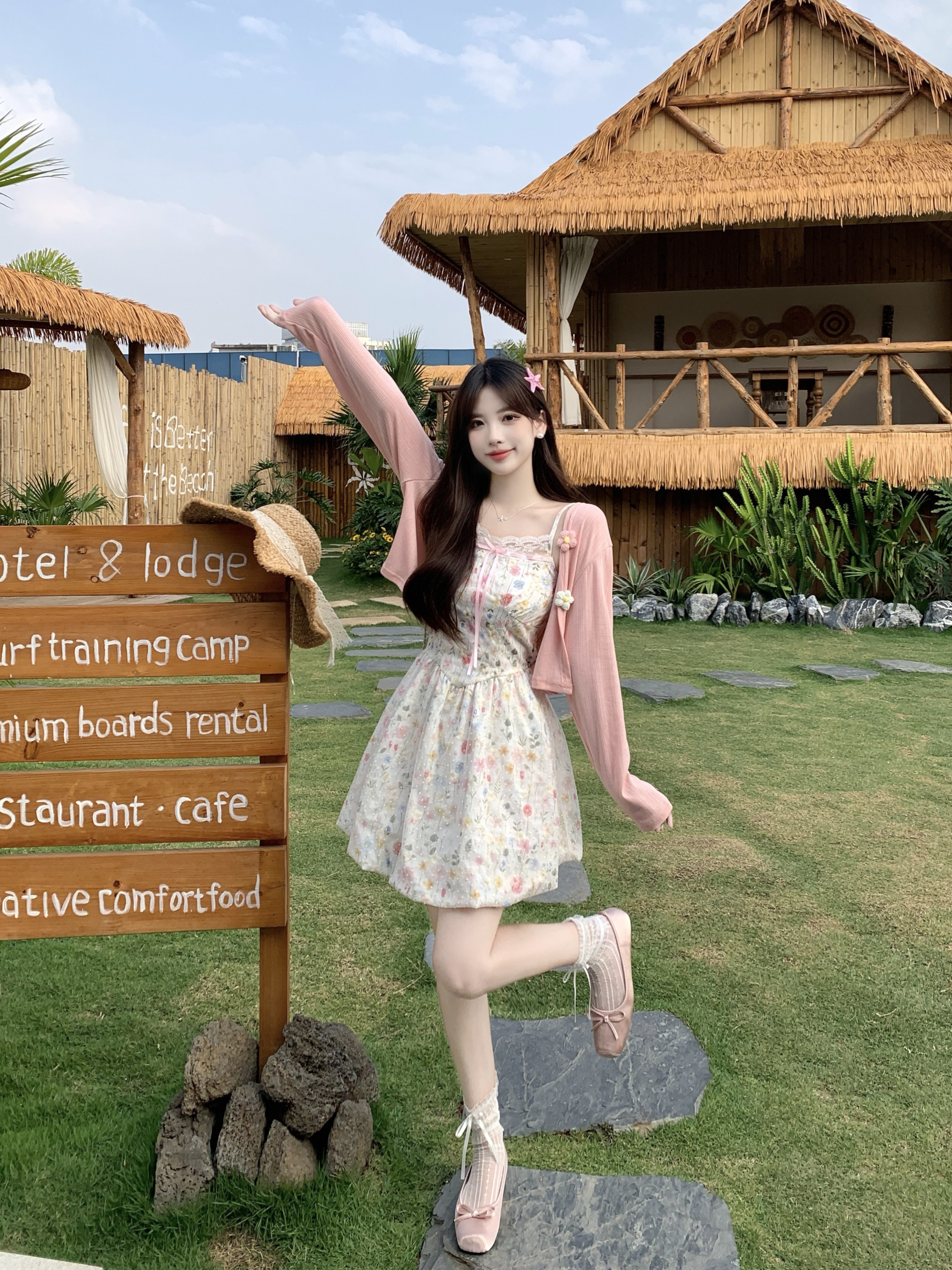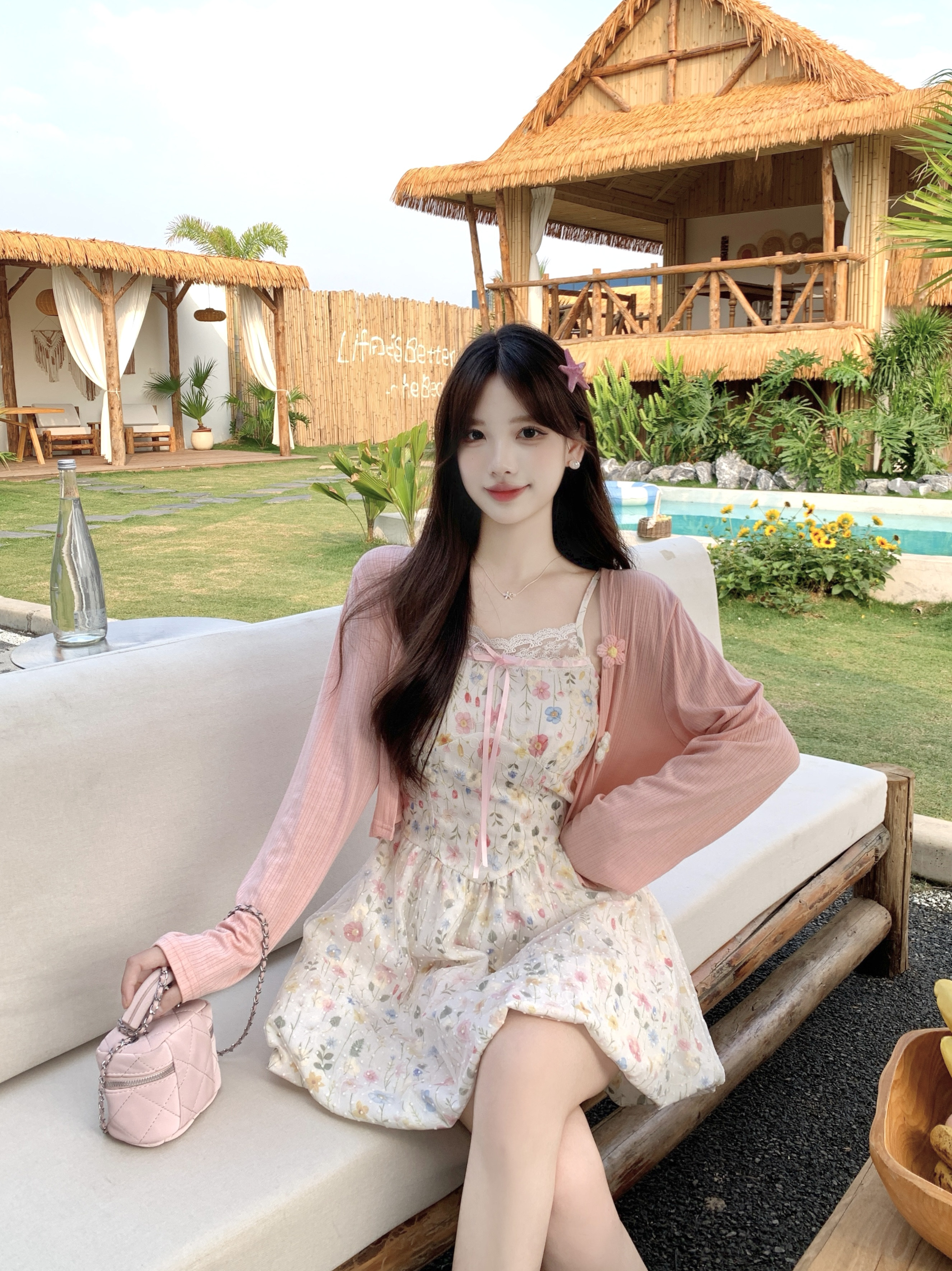 빅 사이즈 여성 의류 지방 mm 살구 색상 전원 바람 달콤함 작은 꽃무늬 프랑스식 레이스 슬립 드레스 오픈 가디건 투피스 세트