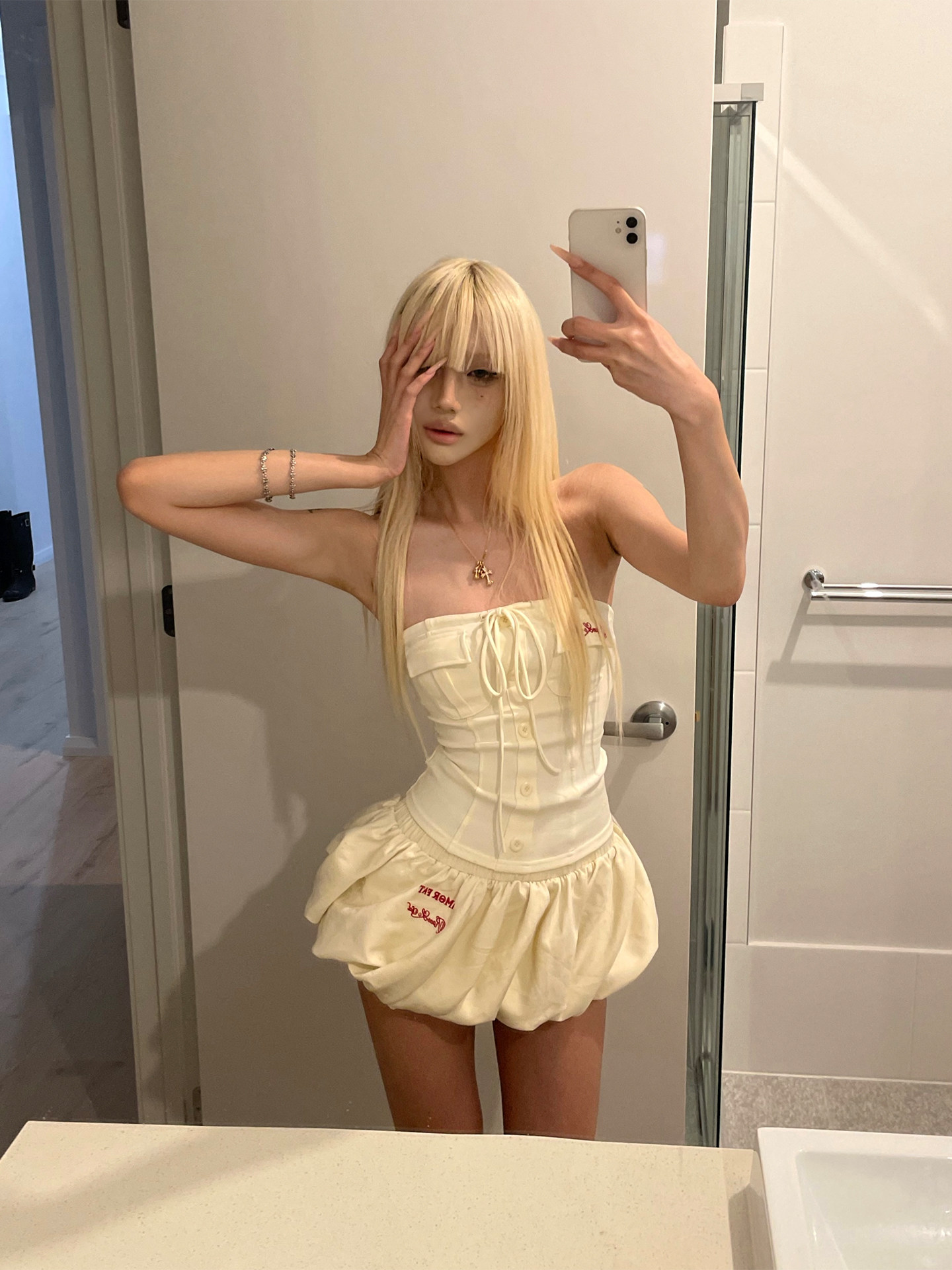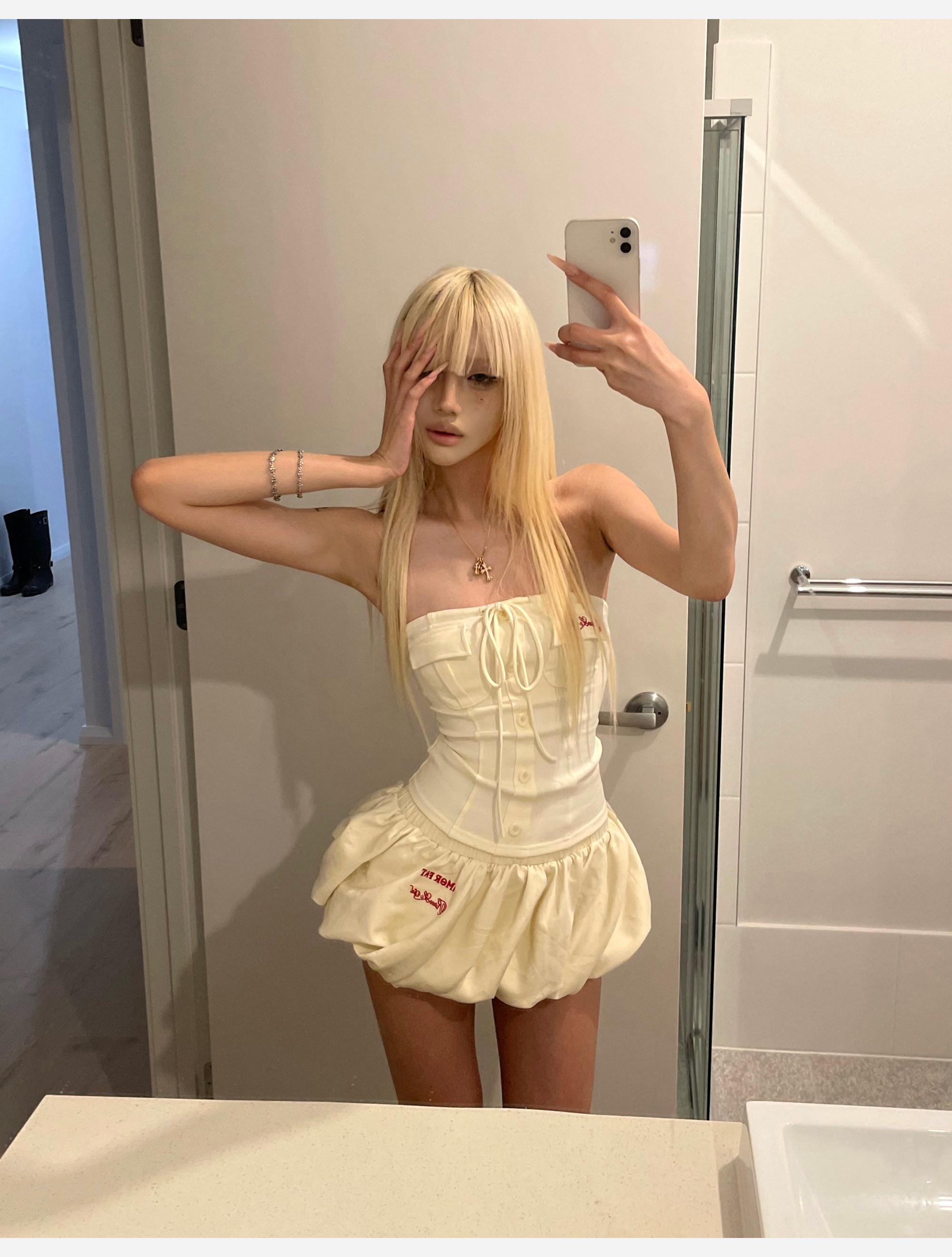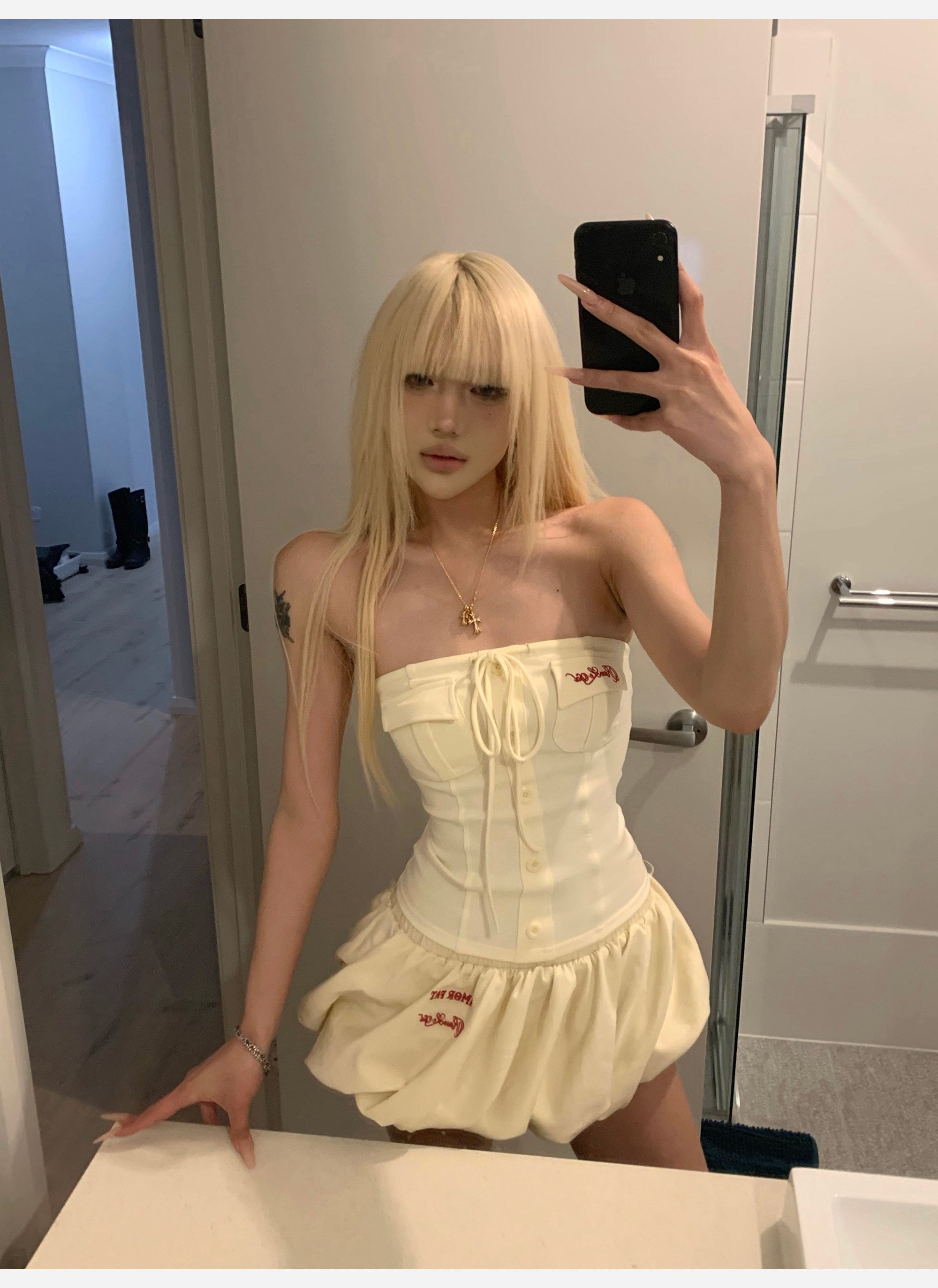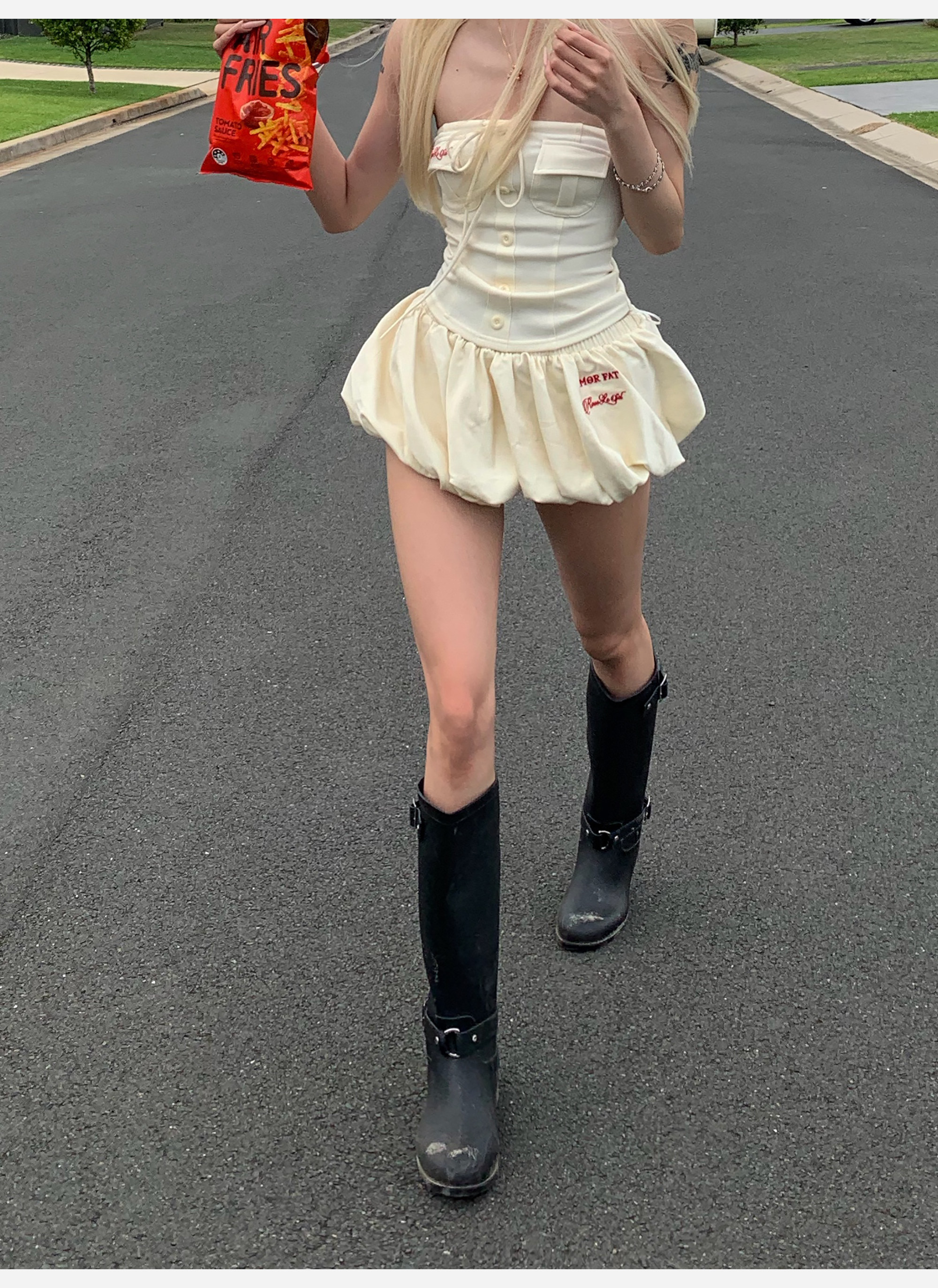 joykiki 튜브탑 맨위 여성 순수한 욕망 바람 코르셋 퍼프 미니 스커트 하이웨이스트 슬림해 보이는 디자인 반신 치마 세트