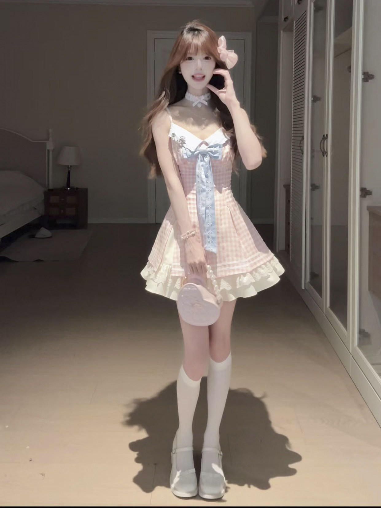 캄파넬라 세과 house 복숭아 복숭아 남자 웨이브 프랑스식 부드러운 바람 달콤함 소녀 귀여운 파우더 블루 배색 체크무늬 슬립 드레스