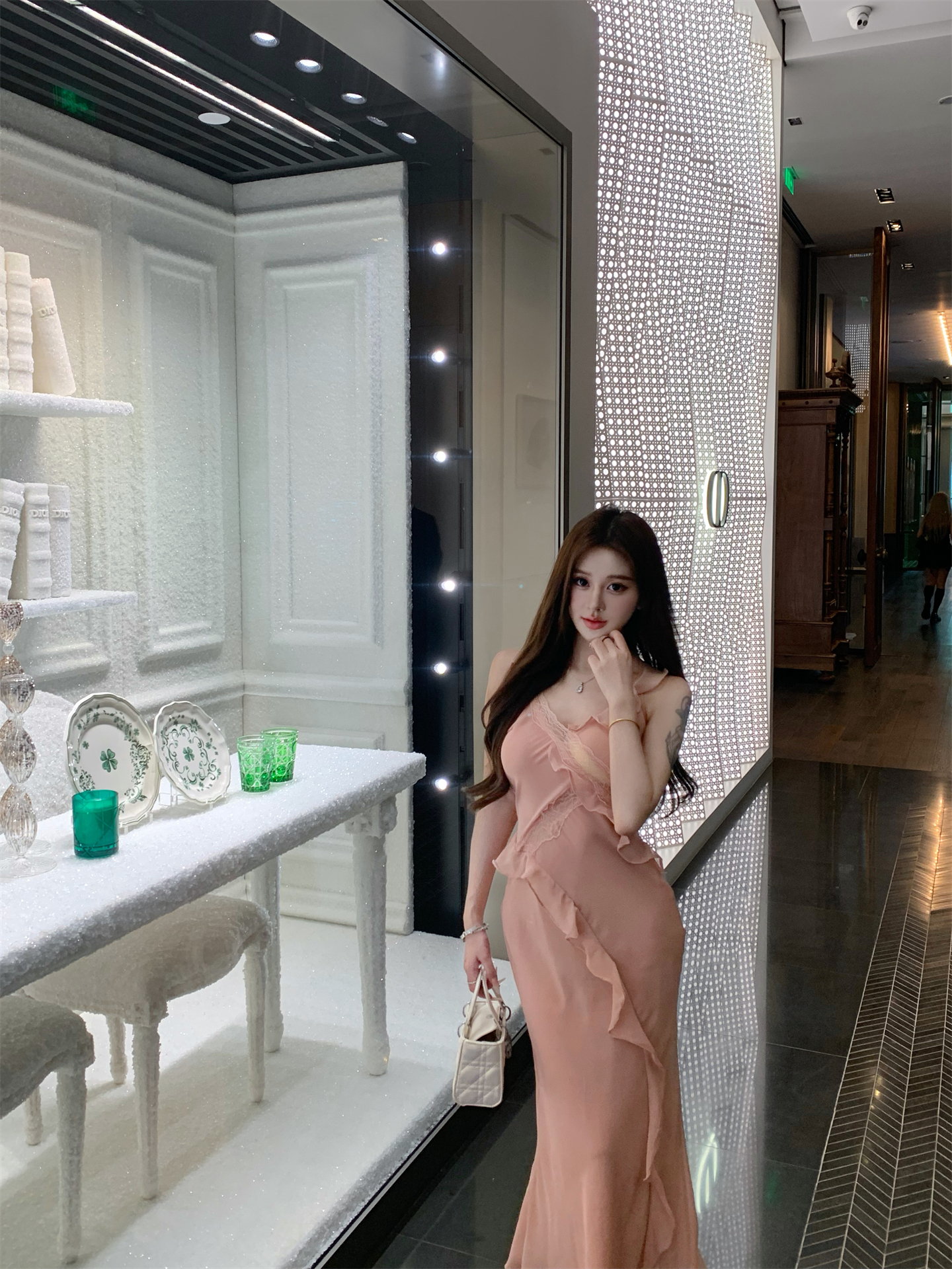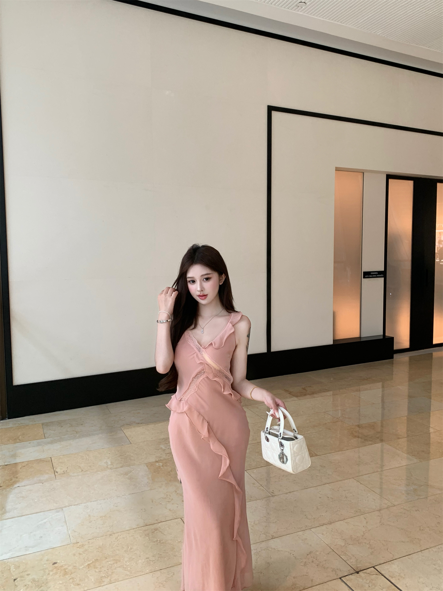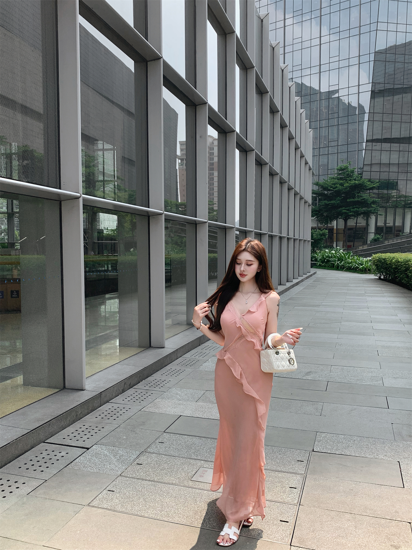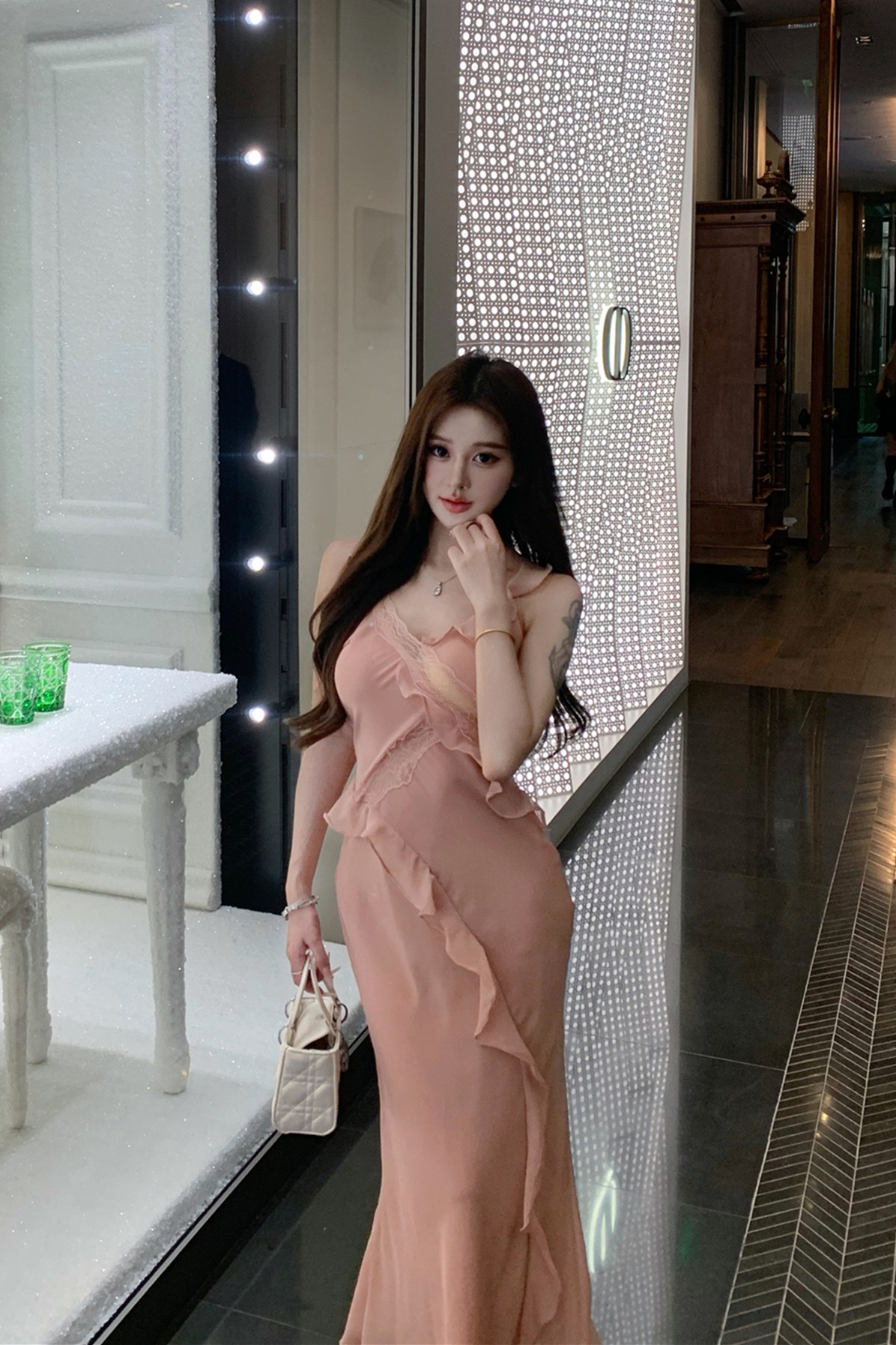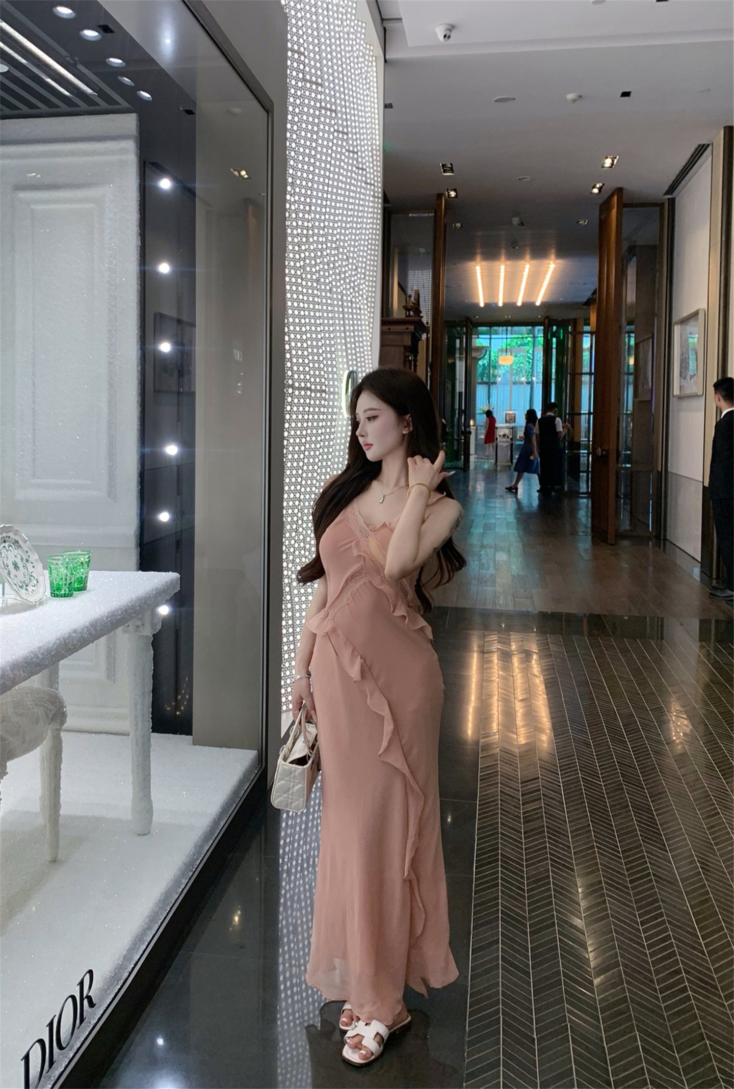 실사 청각 장애인 아니요 자기 인식 프랑스식 우아함 프릴 쉬폰 레이스 슬립 점프 슈트 롱 스커트 여성