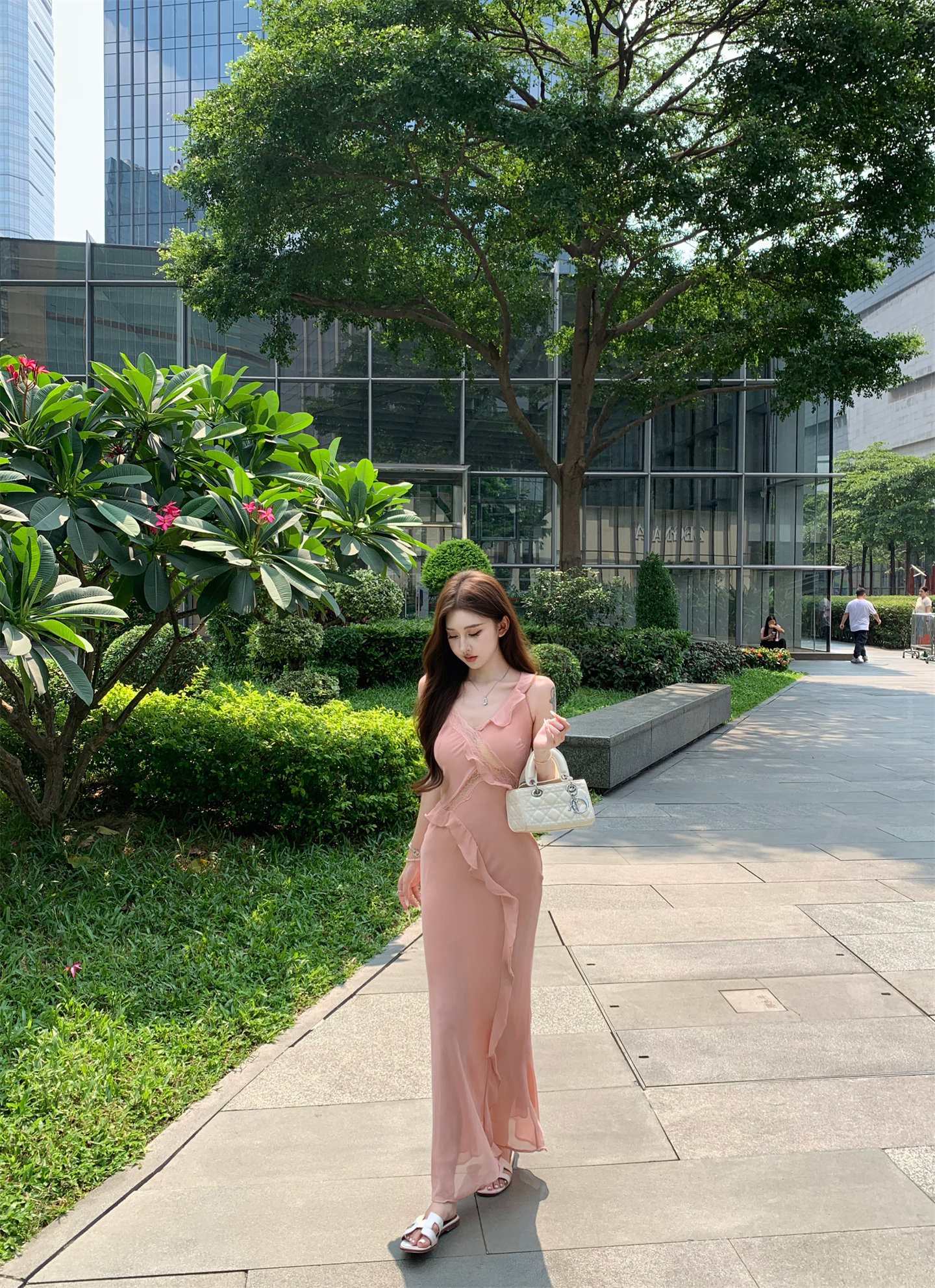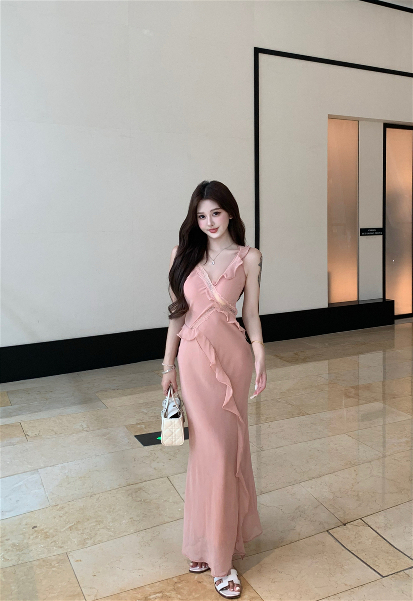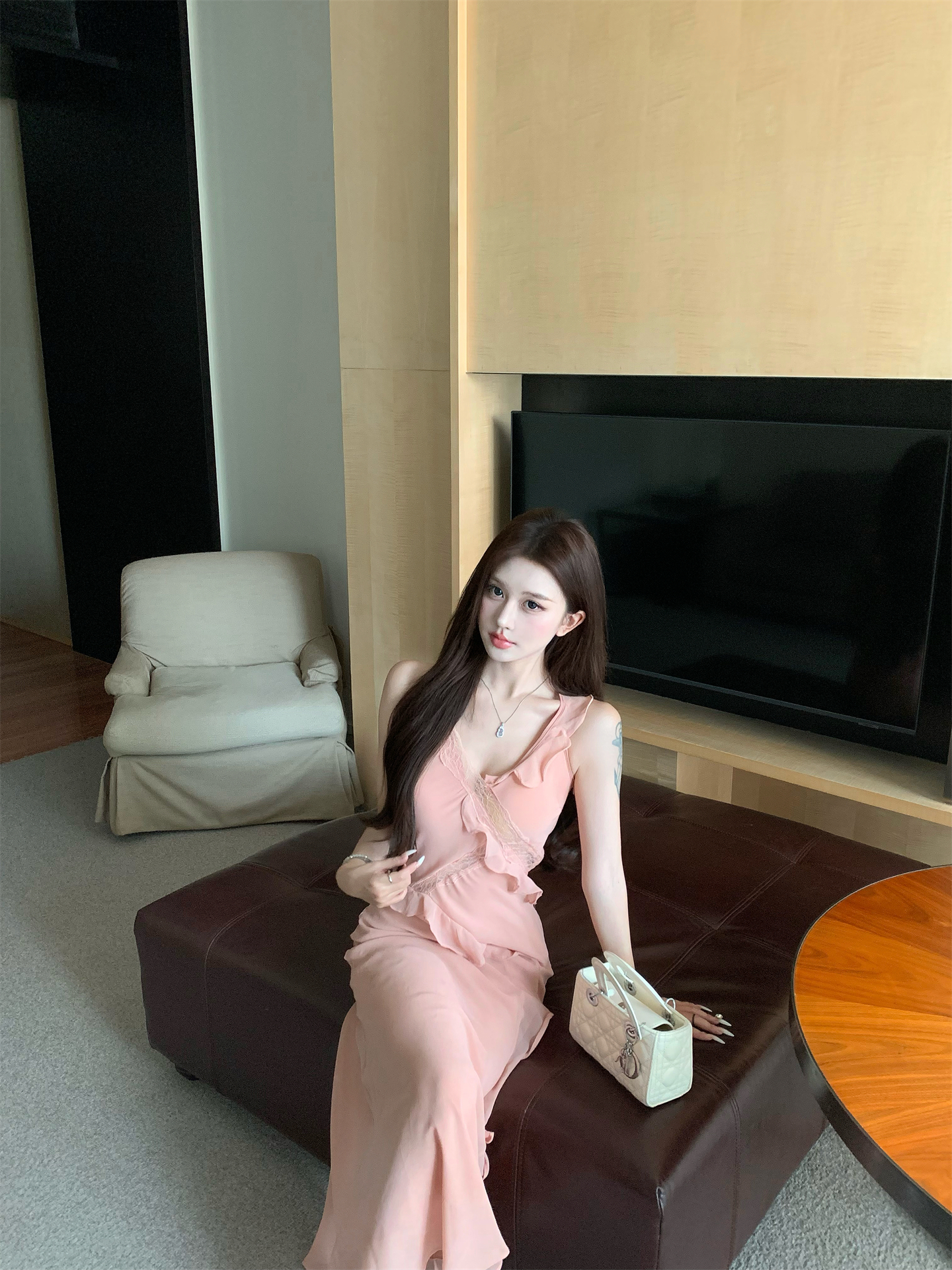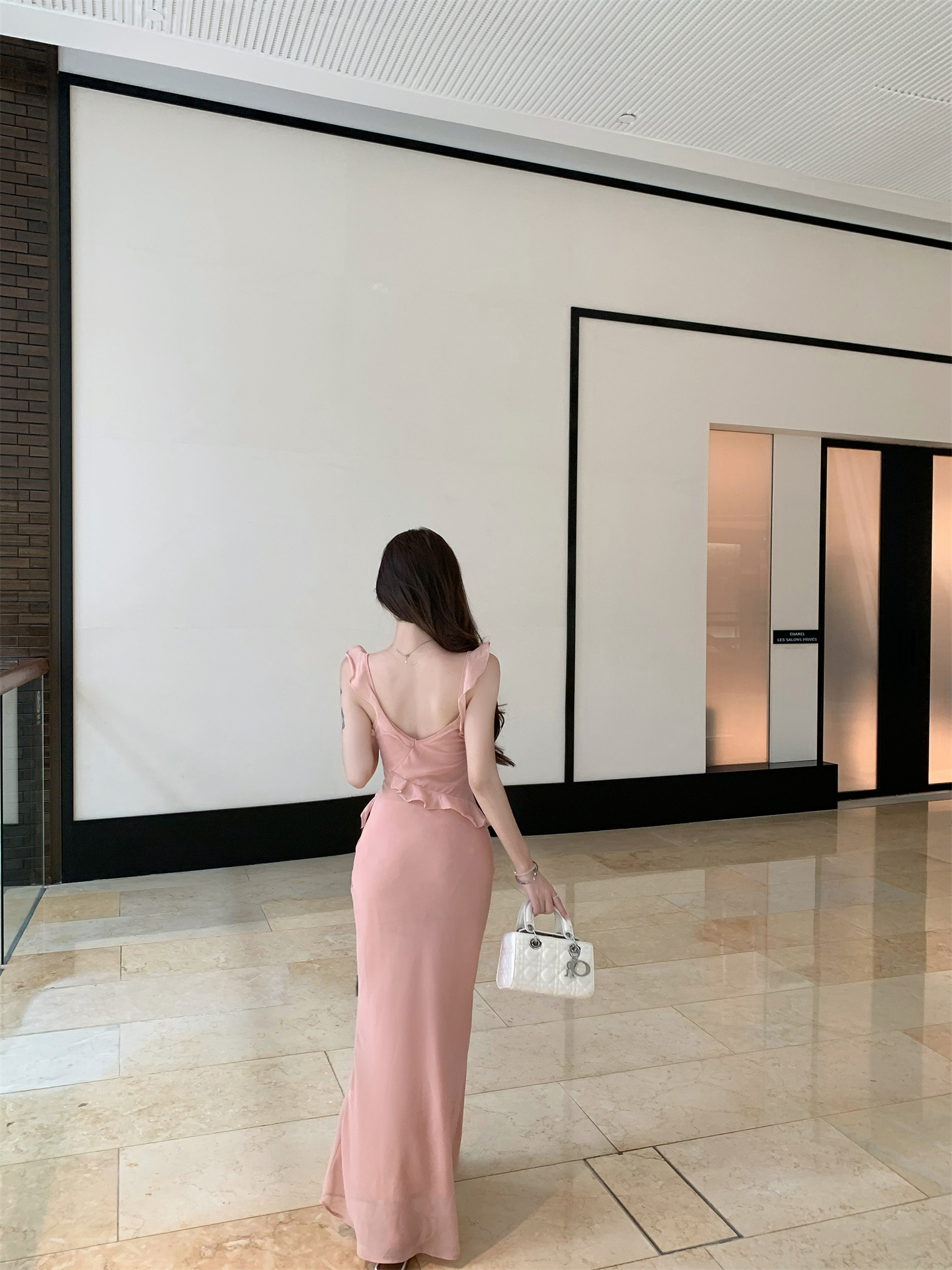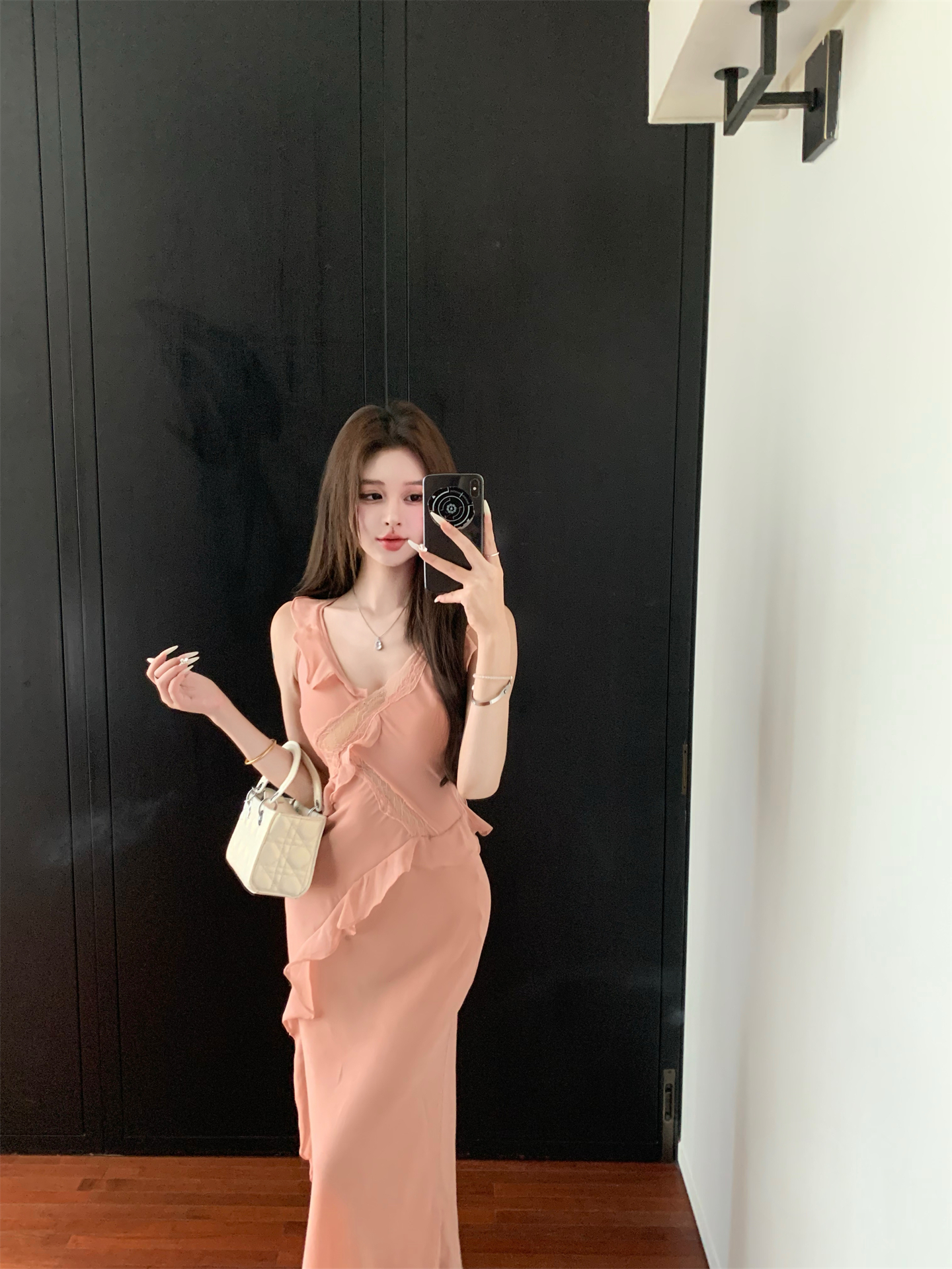 실사 청각 장애인 아니요 자기 인식 프랑스식 우아함 프릴 쉬폰 레이스 슬립 점프 슈트 롱 스커트 여성